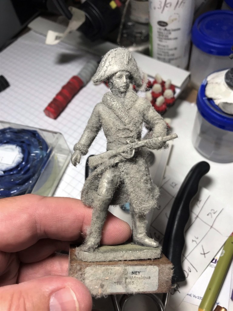Lastly, I mentioned that we also have gotten shelving from Home Depot and have been assembling them and redoing storage in the cellar. We have put together 3 of these, 1 of these, and 1 of these. The last one replaced an old particle board printer stand that had been used for laundry soap, bleach, etc. It was messed up, and had a storage area under it. In the storage area were a couple of yearbooks from junior high I had not seen in a while, plus under the stand was a big lint-encrusted pewter figure of Marshal Michel Ney, the Bravest of the Brave, that I bought in France in the 1980’s! I was always fascinated by his story. However, I had zero idea how he ended up there.