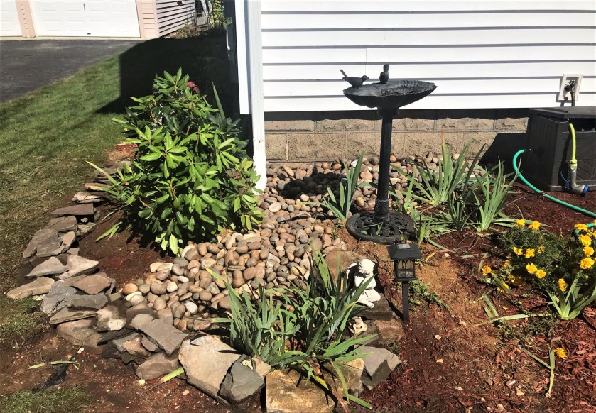 Before I did that, I rebuilt the drywell. When I originally built it, I had dug down about 3 feet and hit sand, so I had then assumed that the soil was free-draining. When I dug this time, I went a bit deeper, and to my surprise I found that there was yet another soil layer under the sand. This one was a loamy clay – that does not drain well. So, I dug down another 3 feet and backfilled it all with sand from the excavations in the backyard. I replaced the downspout extensions and doubled the length. The we covered the area with a filter fabric and then covered that with river stones.