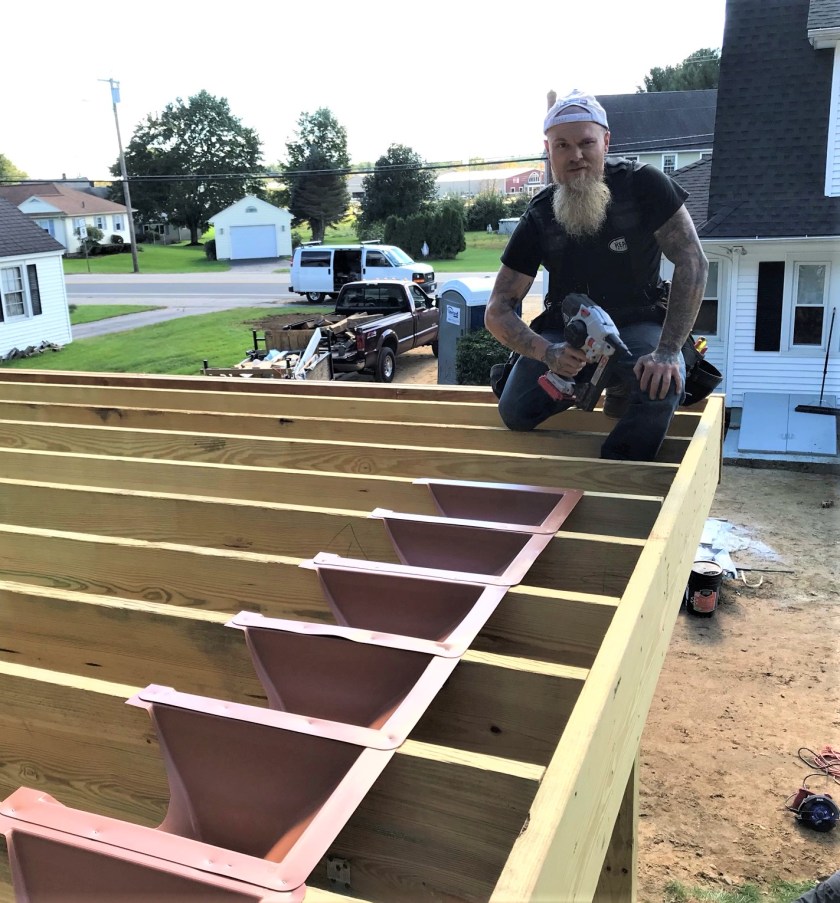 The next work skipped a day (rain), and that involved the framing of the replacement house deck. This was October 1st. Jonny also got ready to install the rain gutter system for the garage deck.