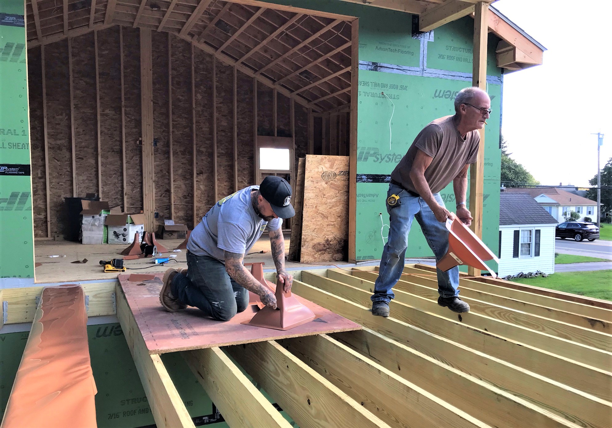 The downspouts fit between the joists (with some help).Jon and Will prep the downspouts for Josh.Josh Victor stapling in the downspouts.