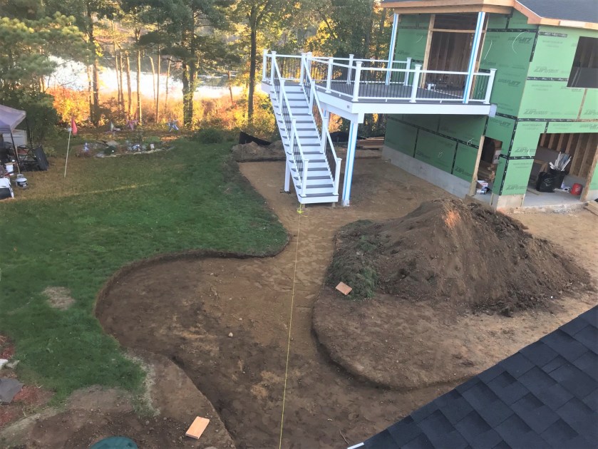 We had decided that we needed to upgrade our plan to include paving stone patios, walkways, a wall, and a gas fire pit. This post will focus primarily on those aspects. Evandro had previously roughly marked out where these new parts would go and link in with the new garage and the new house deck.