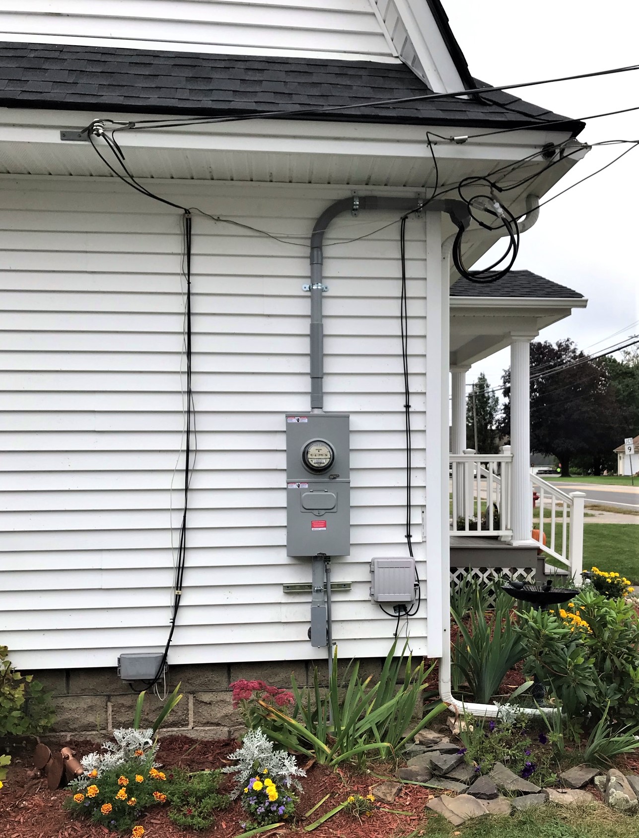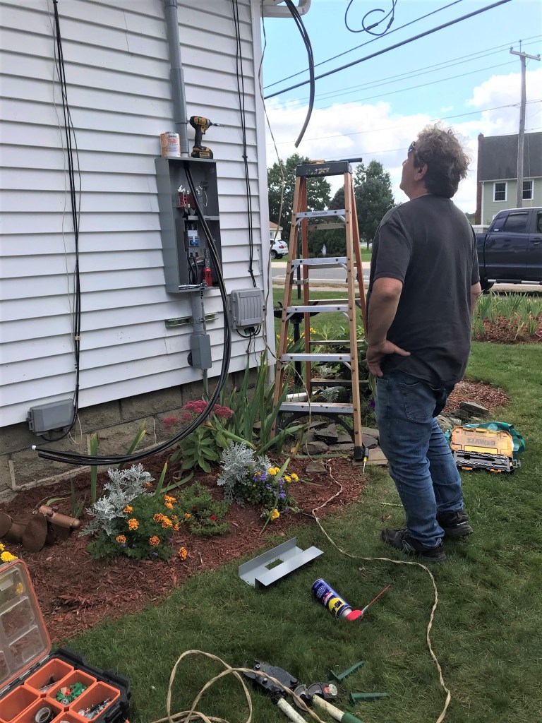 To power the new building, I needed to get the service upgraded from 100 amps to 200 amps. Our electrical service meter and box was in the back of the house over the old (now removed) house deck. Previously, electrical power came from the National Grid pole out front on the street to the house then went along the soffit and into the cellar at the back right-hand corner of the house if you will. The plan was to make this bigger and better by moving the meter and building a new box for it at the front left corner of the house. A new hole had to be drilled for the new power cable, and that needed to be run to a new replacement distribution box in the basement. This work occurred on September 21st.