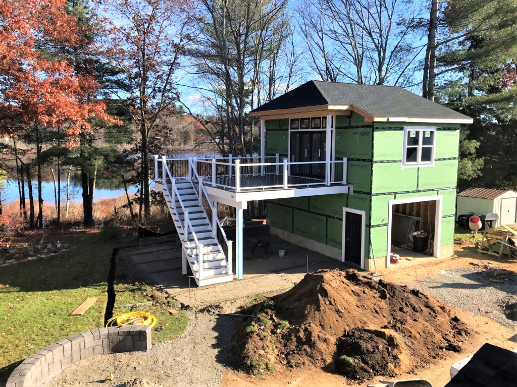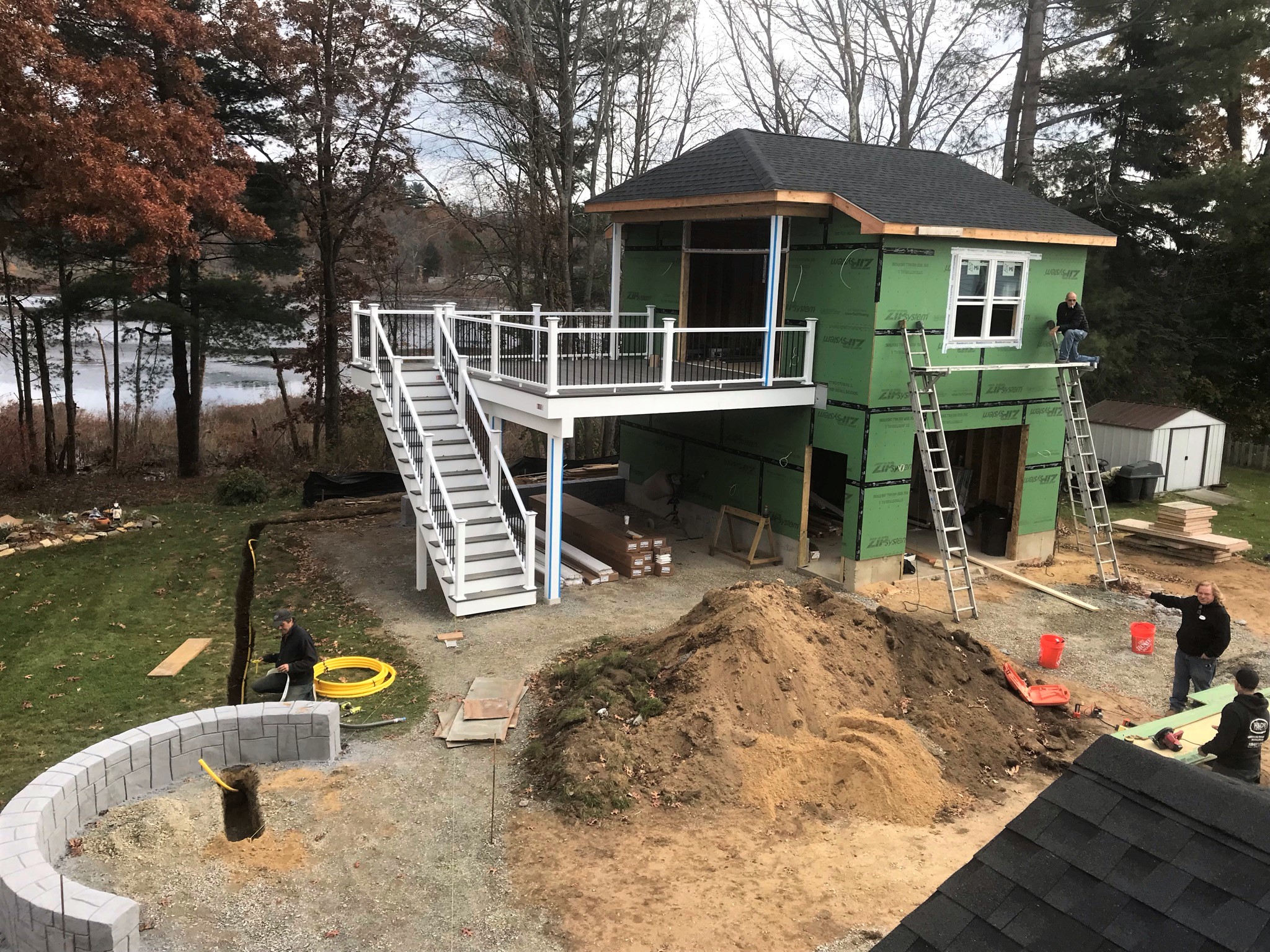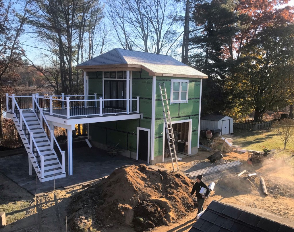 Evandro’s guys excavated the gas line (by hand) into the fire pit area.The windows were prepped for installation.Finally – after a long supply chain delay, windows and siding arrived and were moved onto the job site.