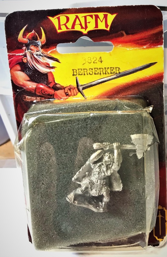 One was a six-figure blister of Ral Partha Imports “Viking Berserkers with Axes” (#DA45) – circa 1982. The second was a six-figure Minifigs “Viking Command” blister pack probably from around 1980-1982. The third was a six-figure pack of Ral Partha “Saxon Huscarle” (#1117) from their “1200 A.D.” line – circa 1982. The last was a single figure from RAFM, “Berserker” from their “Adventurers” line circa 1989. This adds up to 19 figures, and Greg is making me 20 or so canoes. So, the following will describe how I proceeded to paint all of these up.