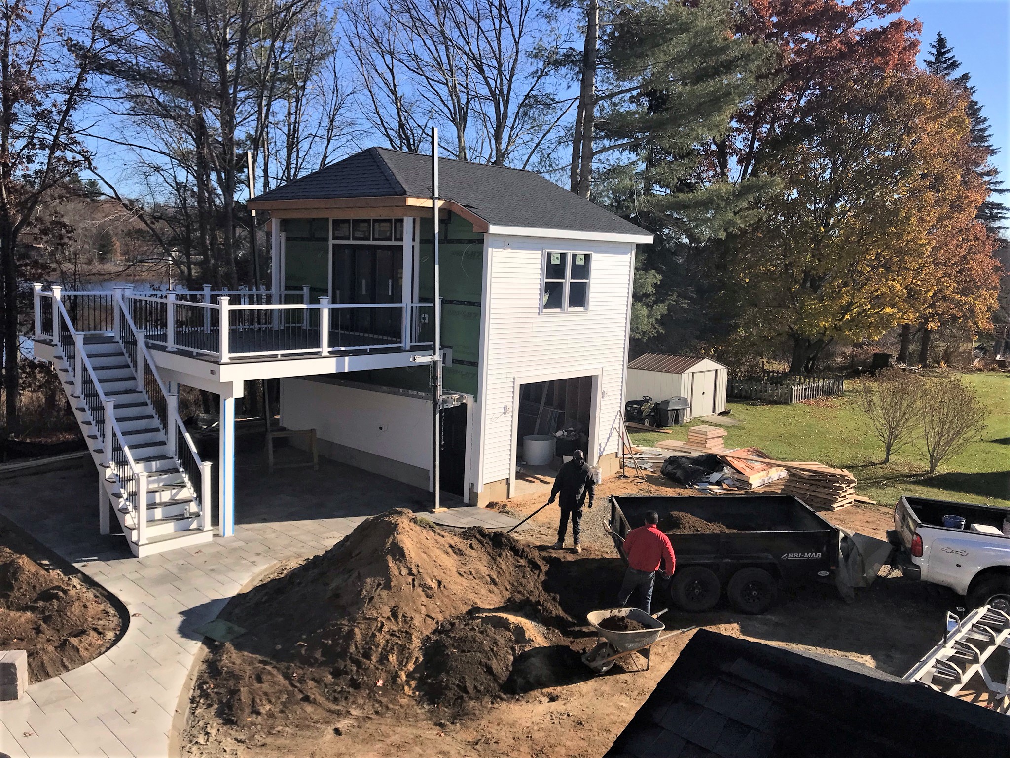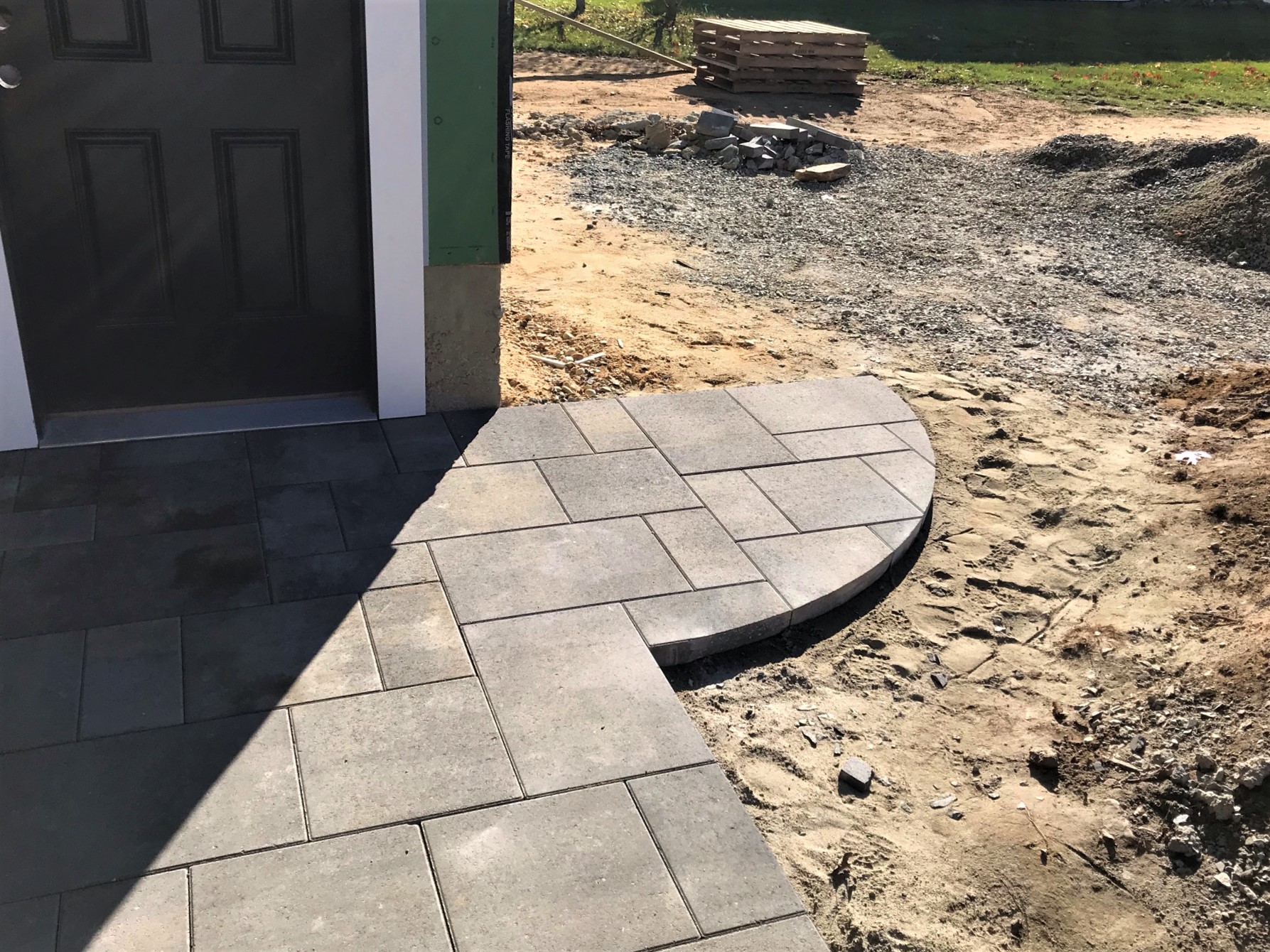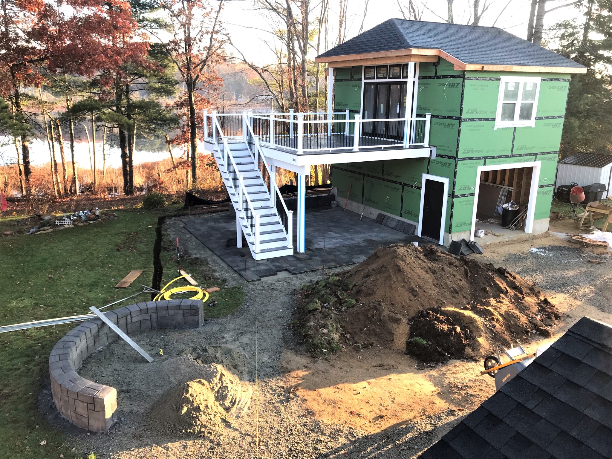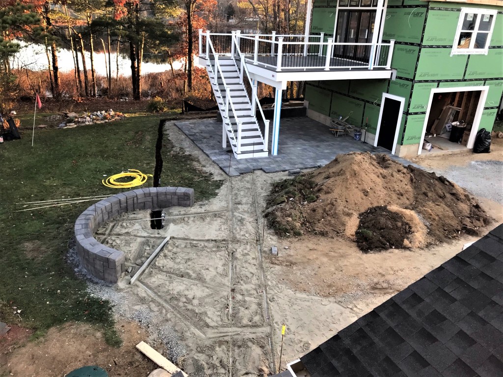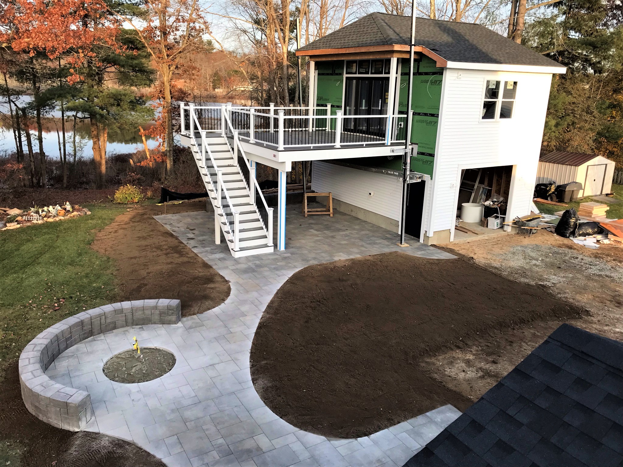 Early morning Friday the 19th showing siding and patio progress around the fire pit. All pavers are cut to shape.