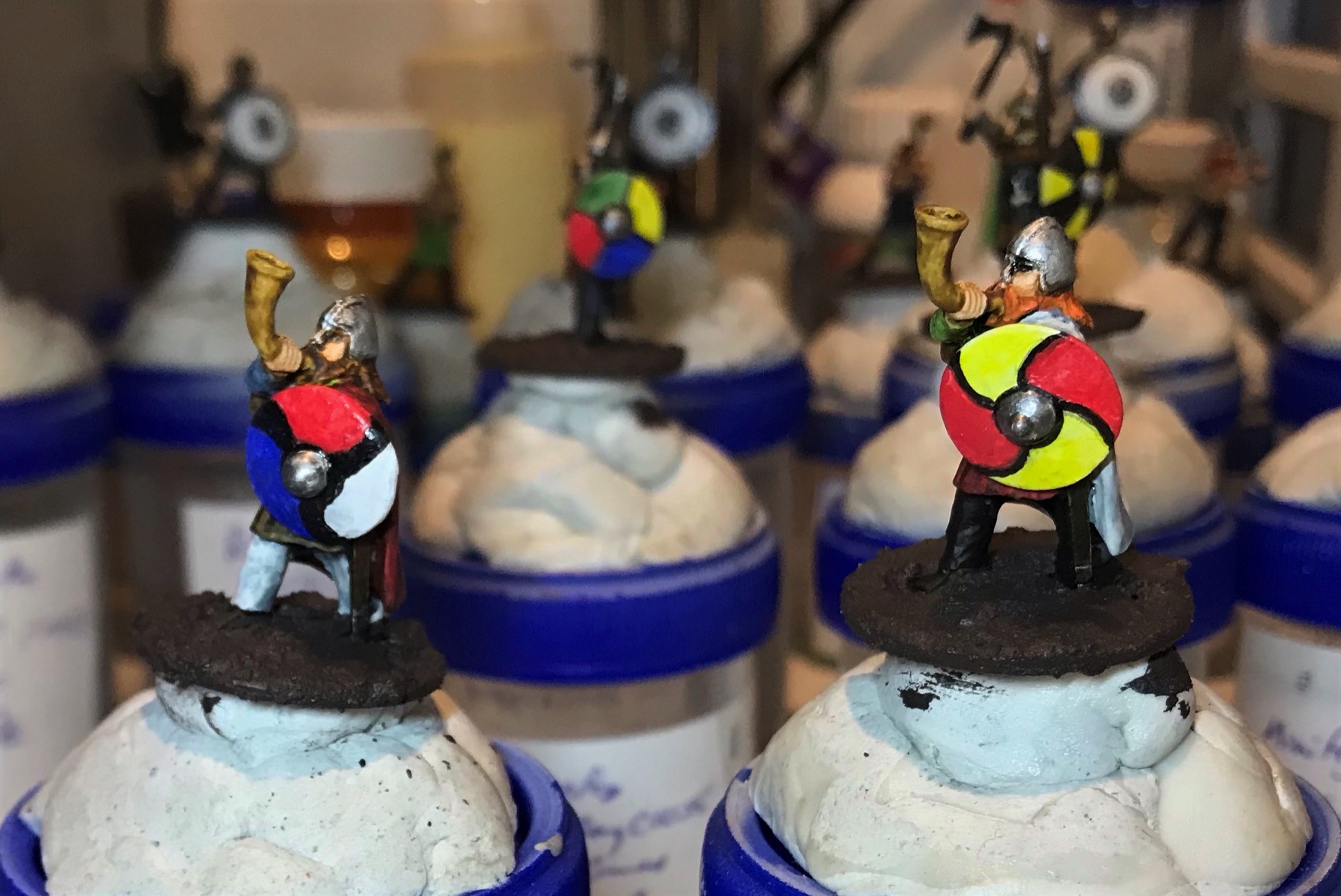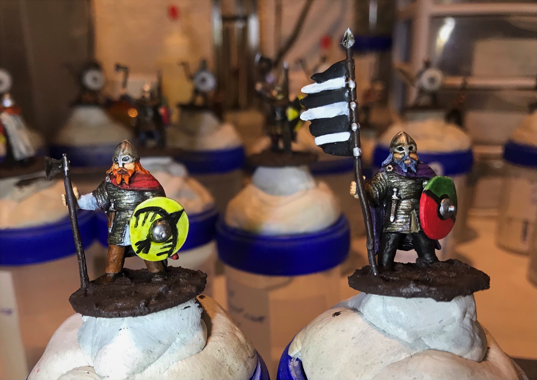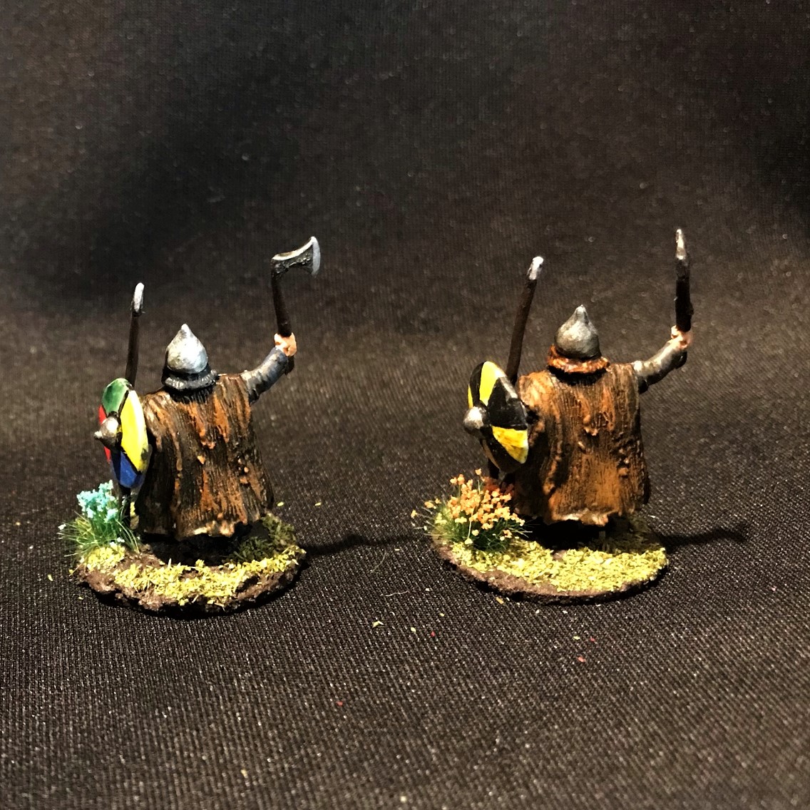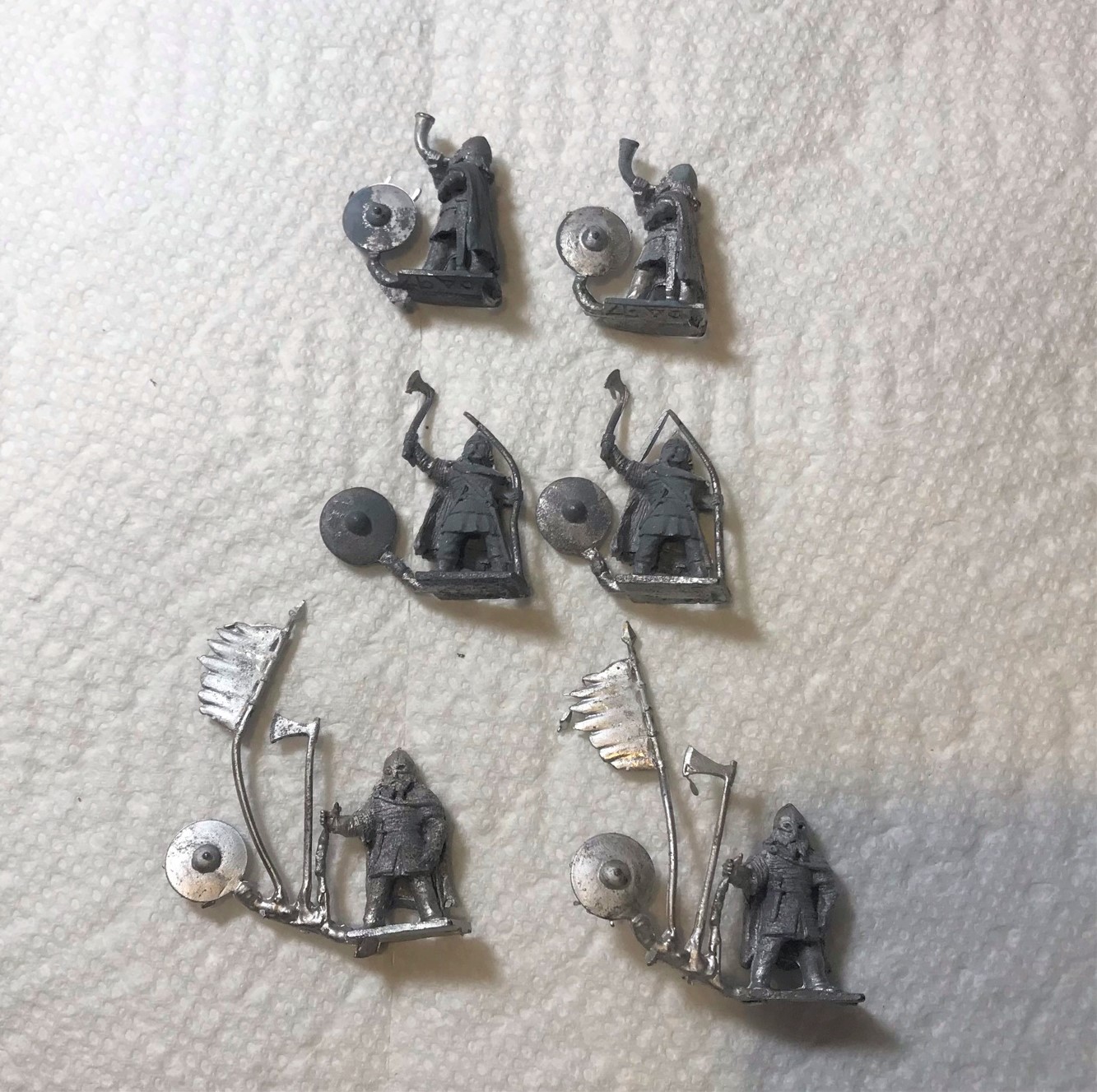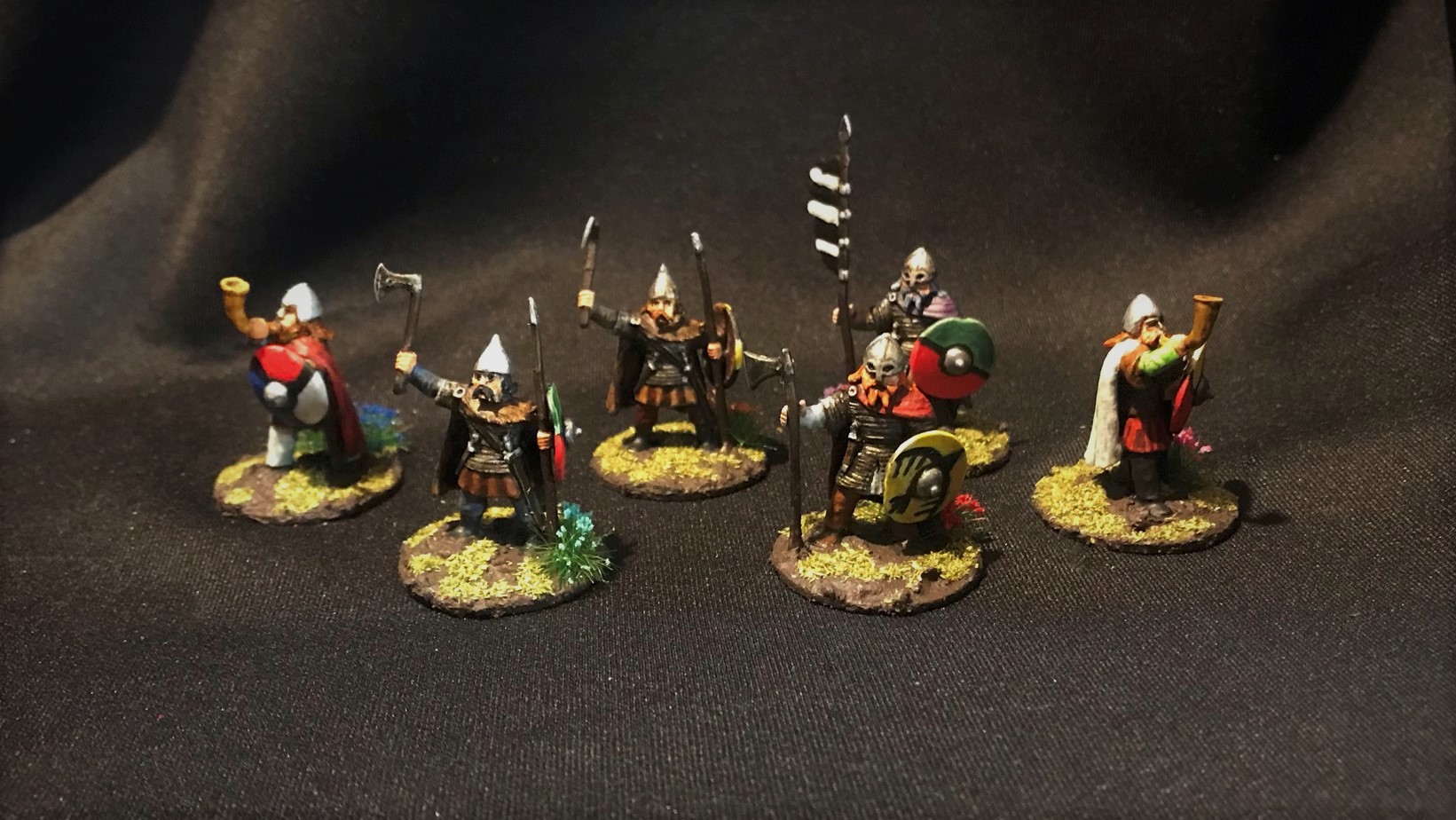 There were three poses here. Two with a horn, two with spears and axes, and two with either a banner or a long-shafted axe. For the last group, I gave one an axe and one a banner. They all had shields (unattached) so I did need to get some references for free-hand painting them.
