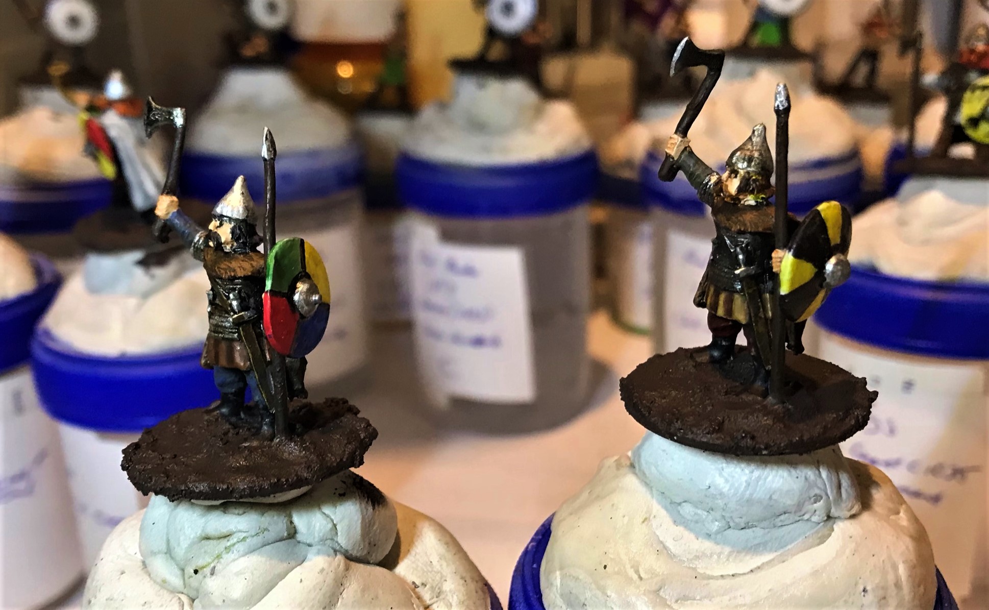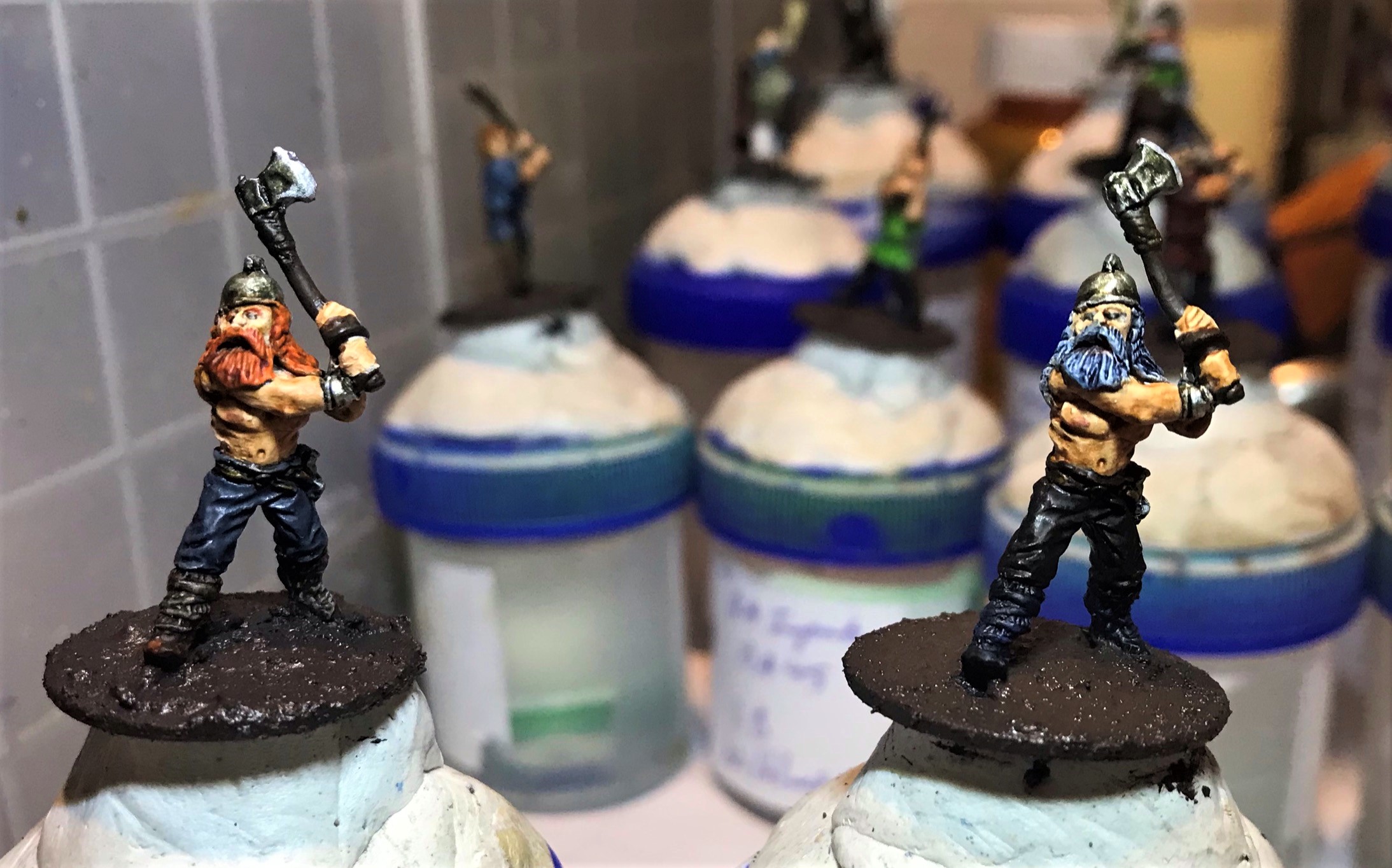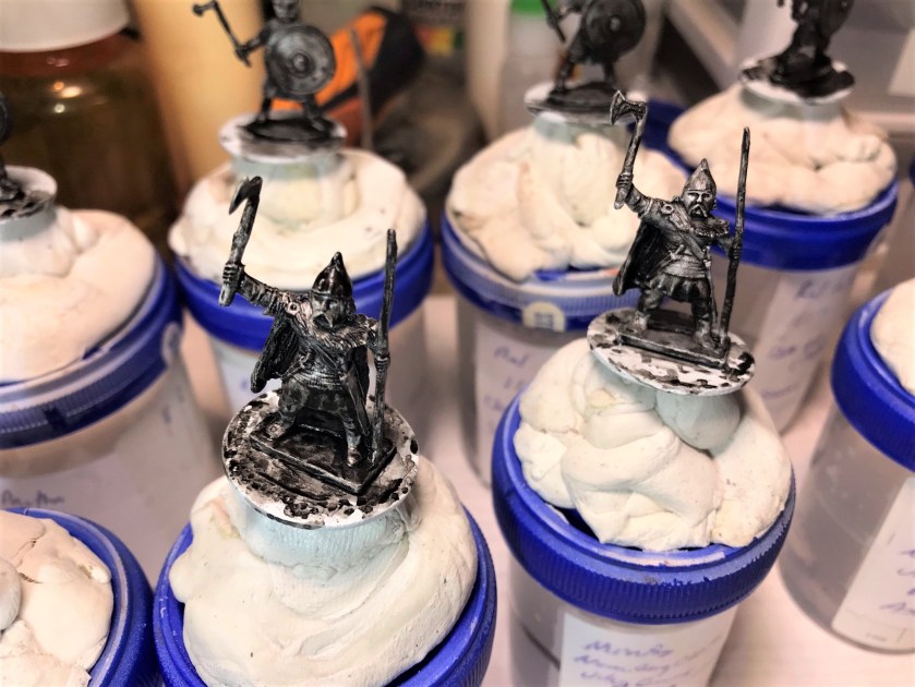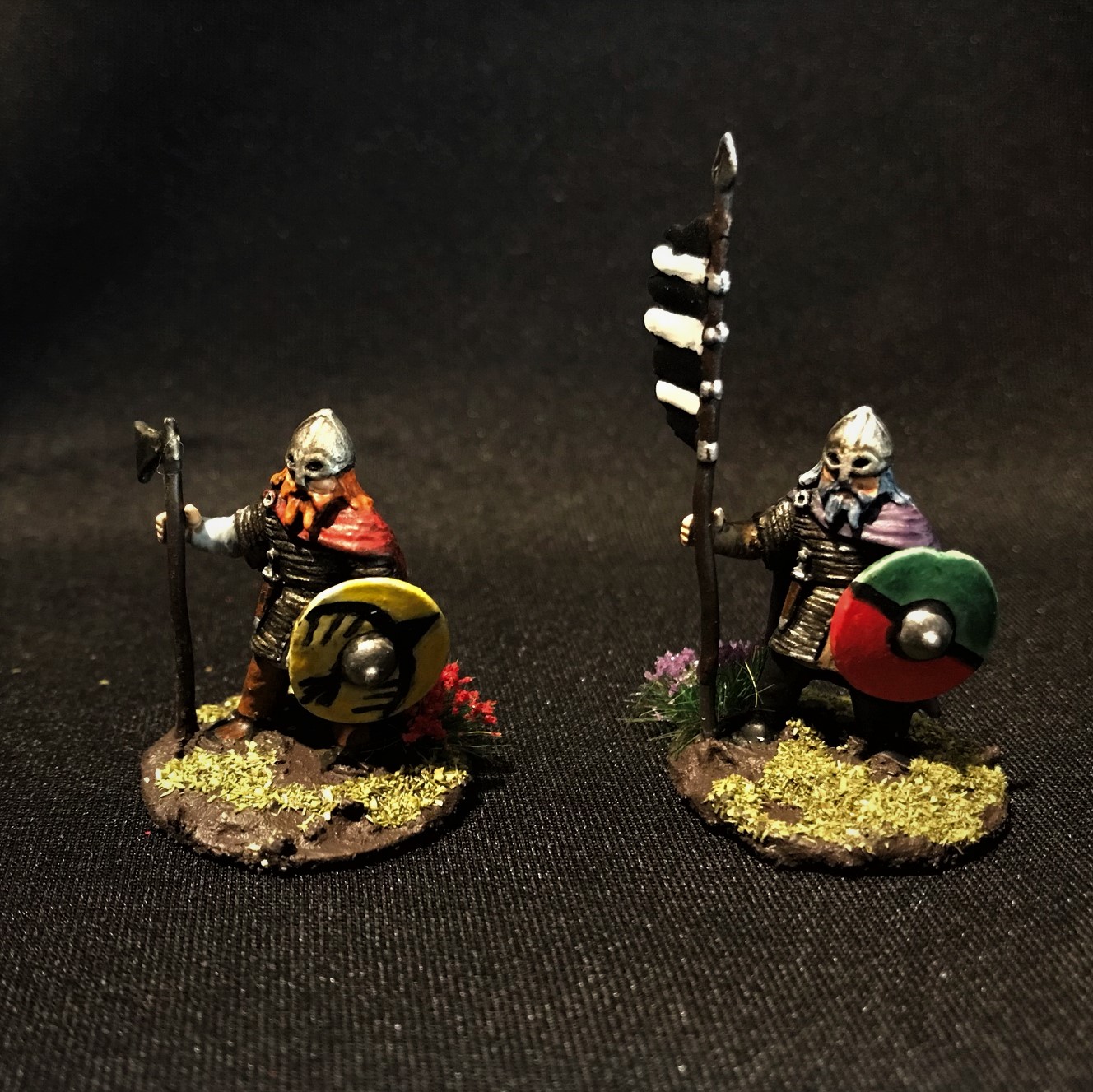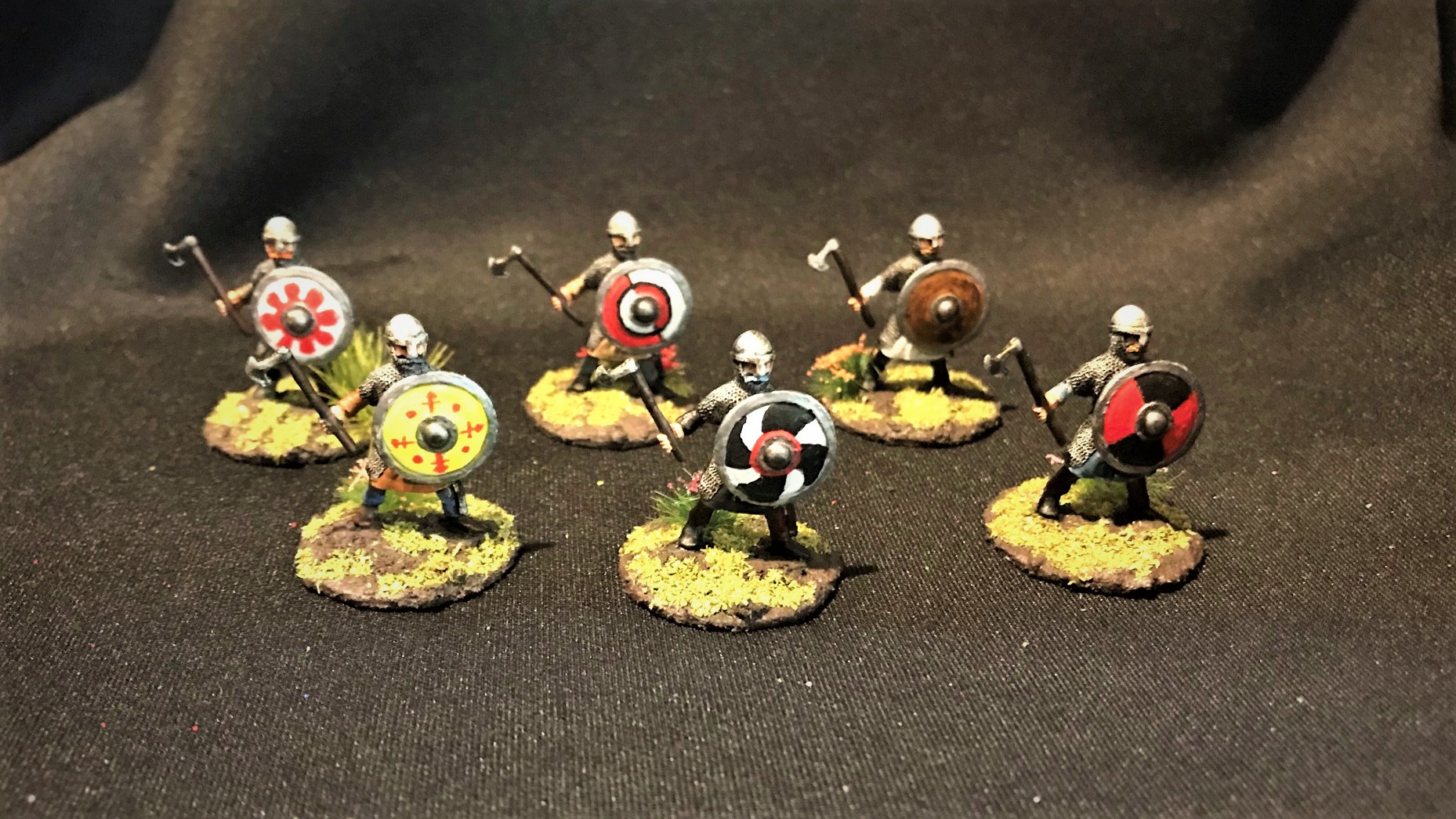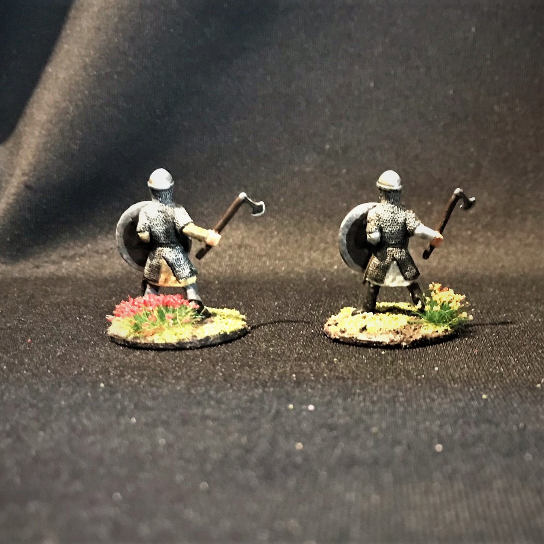 There were three poses here. Two with a horn, two with spears and axes, and two with either a banner or a long-shafted axe. For the last group, I gave one an axe and one a banner. They all had shields (unattached) so I did need to get some references for free-hand painting them.