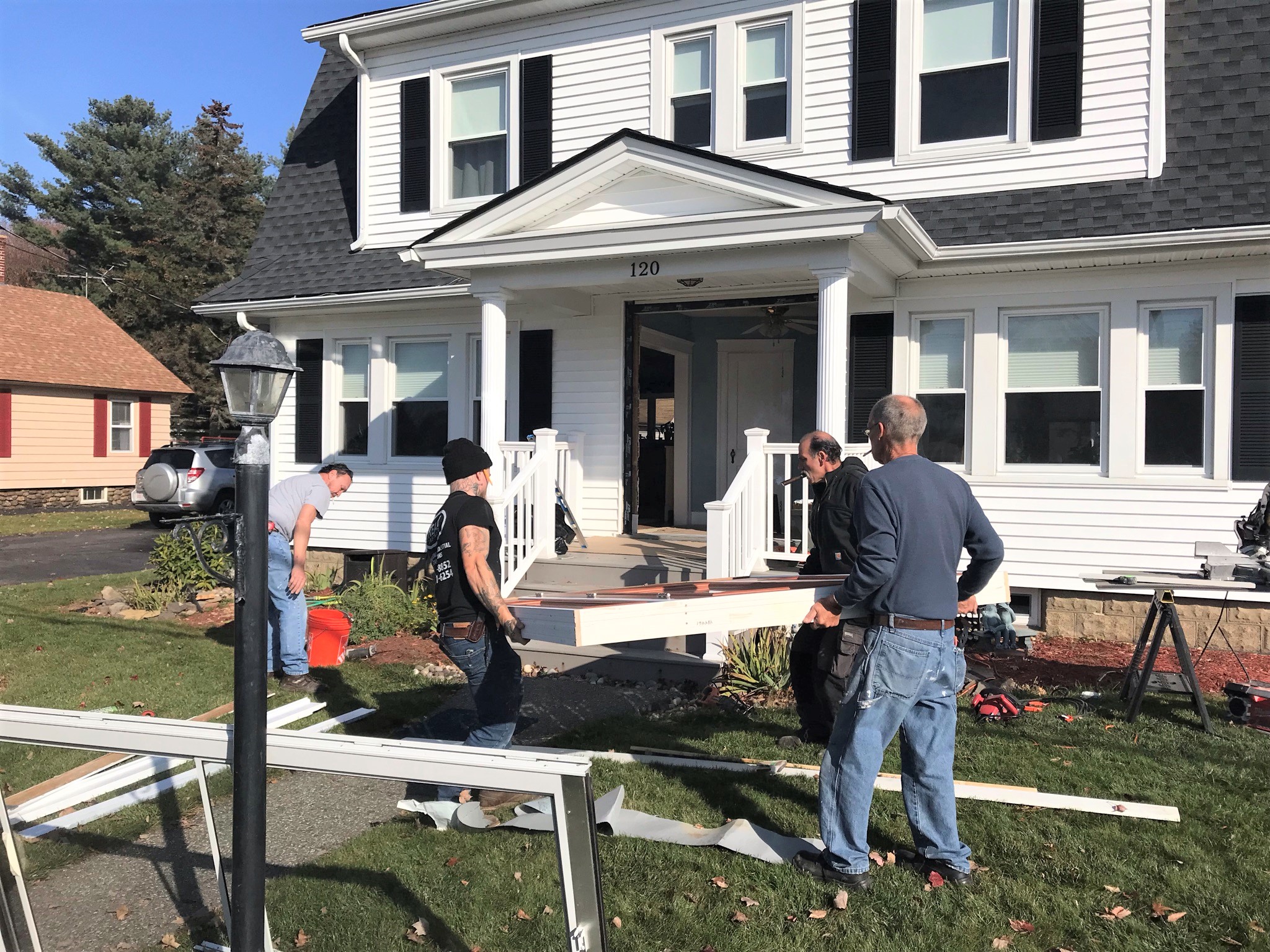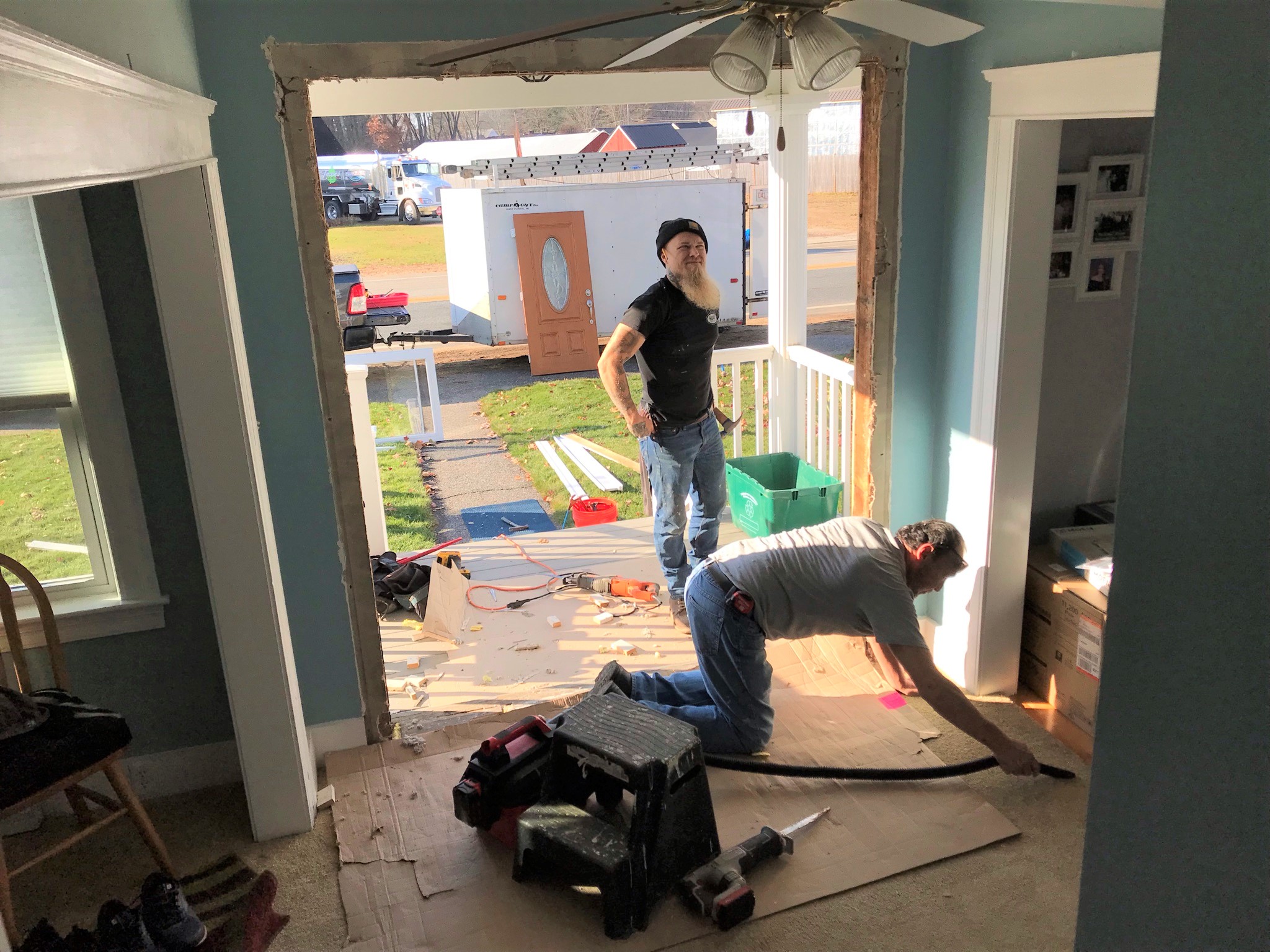 Early Wednesday morning shows the front window getting installed, Don Millette putting the gas line in the trench, and the Victors supervising.