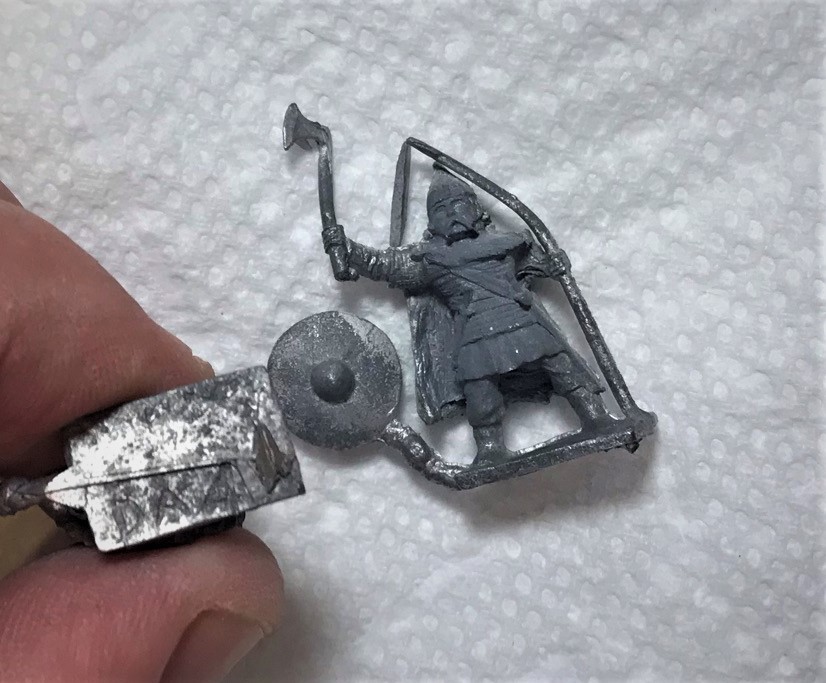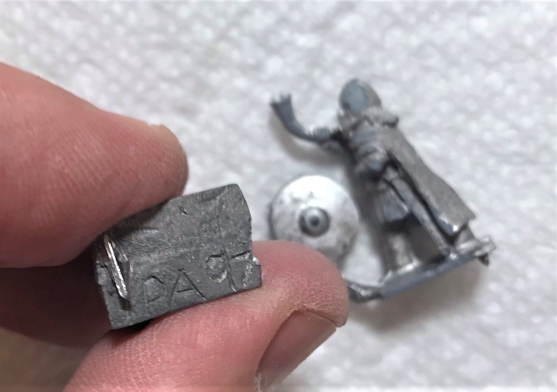 Each of the three poses had a different number on the bases. Pose 1 (with horn) was DA97, pose two (with axe and spear) had only partially DA4-something, and the last one was DA42. I’m assuming DA stood for “Dark Ages”.