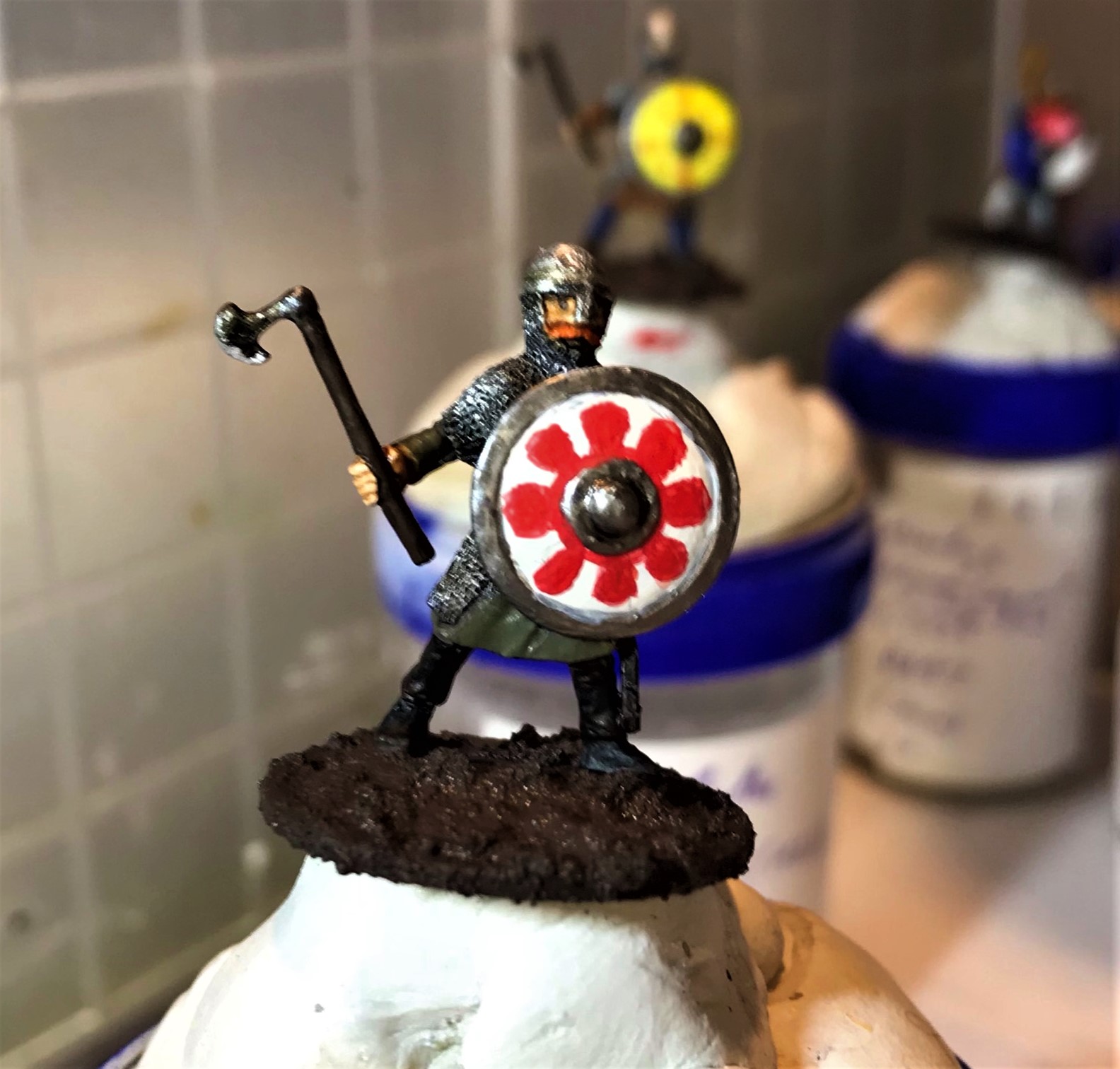 After I painted the shields, I gave them a brush of satin varnish. Once they dried, I mounted them to the figures.