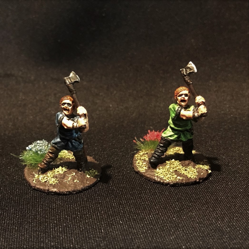 The first pose had no helmets.The second pose had caps.The third pose was more of a classic Viking berserker one with no shirts and helmets.The group. I tried to give the eyes a “mascara” look like the show “Vikings” did. At 25mm, this was hard to do, but you can let me know if it worked or not to your eye (pun intended).