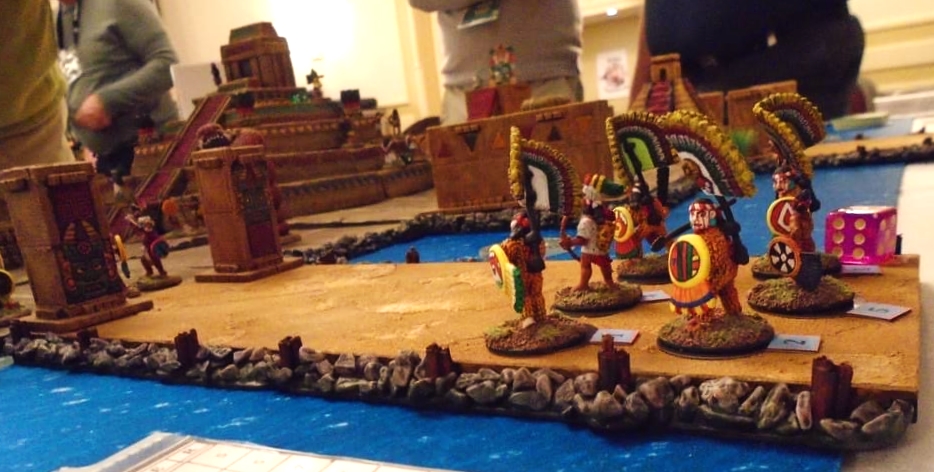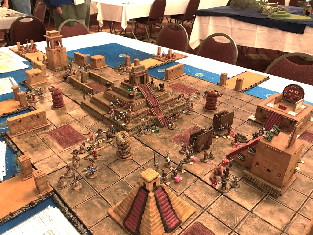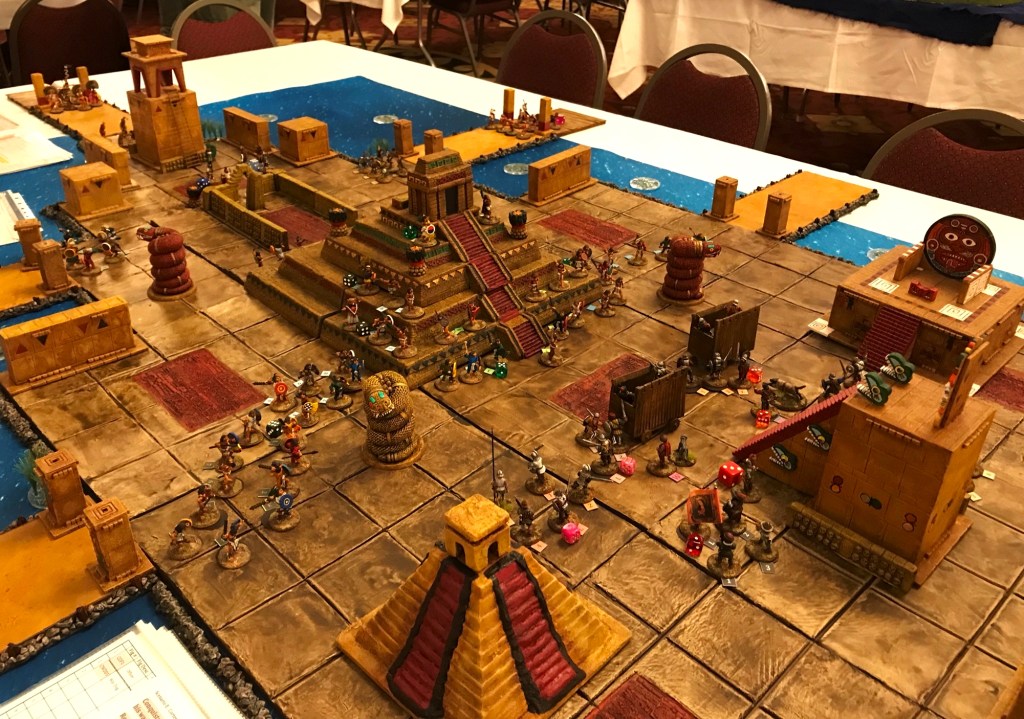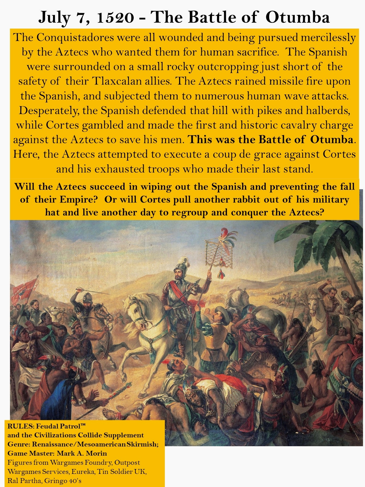 Background: For almost two weeks, the troops under Cortes retreated across central Mexico – hoping to reach the safety of Tlaxcalan territory. All of the Spanish were wounded to some degree – many died each day from the wounds suffered during La Noche Triste and the subsequent skirmishes that occurred as the Aztecs, under Cuitlahuac, pursued them mercilessly. The Conquistadores found themselves on a small rocky outcropping – and according to Diaz nearly surrounded on two sides. They were just short of the mountain pass that would bring them to safety of Tlaxcala. They took up a position bristling with pikes and halberds upon on the rocky outcropping overlooking plains. The Aztecs rained missile fire upon the Spanish, and subjected them to numerous human wave attacks. The brutal end was near when Cortes noticed that the attacks were being coordinated by the cihuacoatl, the High Priest of Tenochtitlan, the Cihuacoatl Matlatzincátzin. He was the one who was acting as the Aztec General. This High Priest was using signalers and bannermen to coordinate the attacks. Cortes personally rounded up what remained of his cavalry and with great personal courage led a mounted charge towards the High Priest and his retinue. The Aztecs had never before faced a massed cavalry attack. While the hooves of the Spanish cavalry were previously unable to make such a charge on the smooth pavements of Tenochtitlan – at Otumba, they were able to make a classic cavalry attack. The charge succeeded in killing the High Priest and many of his officers. It was reported that Cortes himself dispatched the High Priest with his lance. With the death of their leader and disruption of his communications system, the Aztec attack faltered. It quickly fell apart without the command and control that the signals had provided. Cortes and what was left of his troops were able to escape to fight another day, and eventually conquer the Aztec Empire – but this battle could have changed the course of history. This game will last 5 turns and can accommodate 4-12 players on a 6’ x 4’ tabletop.