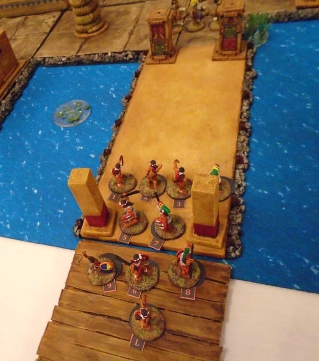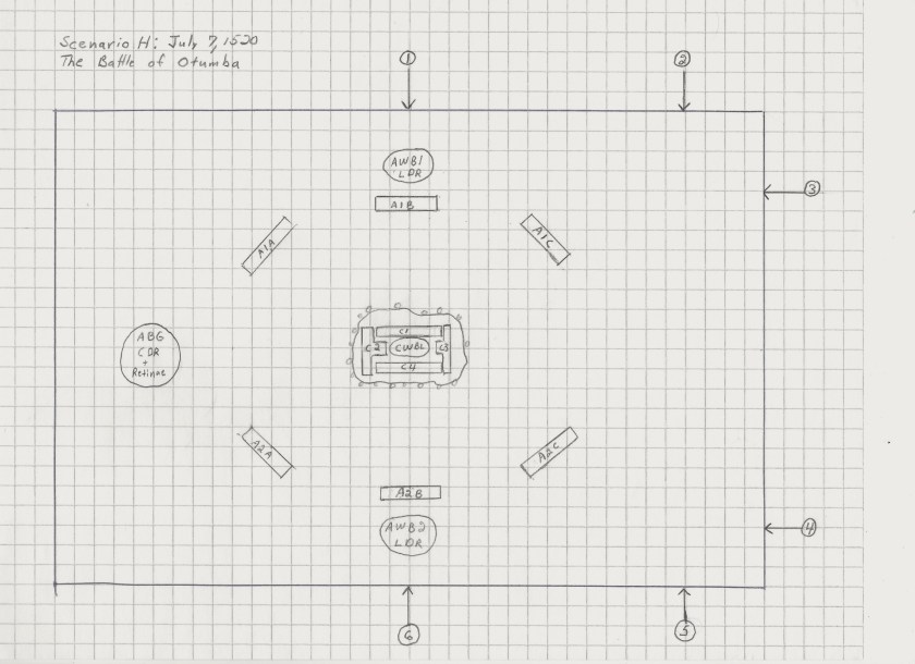 - The Spanish have taken up a “rectangular” infantry-type square defensive position on the rock outcropping as shown on the map. They should have pikemen and halberdiers facing out on each side. Their Warband Leader, Pedro de Alvarado, is in the center.