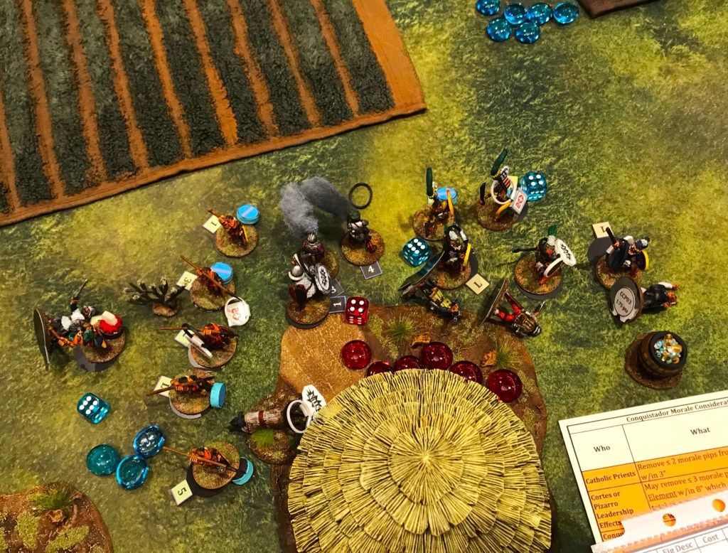 Meanwhile, Cortes deployed onto the table as well. Seeing what happened to his comrades fighting Matlatzincátzin, and not wanting a similar fate, he took a simpler route, and hit the Elite Warband Leader from behind, and killed him (not overly brave, but effective). This “pinned” all Elements of the Elite Warband. Then he killed The Elite Warband Leader’s Warrior Priest for good measure with a well-placed lance to the back. Then Turn 4 ended.