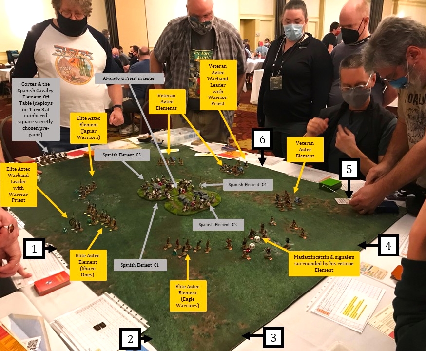 - The Aztecs must try to take the rock outcropping and incapacitate as many Spanish as possible until Turn 4 begins – the turn after the Spanish cavalry arrives. At that point, and no sooner, the Aztecs in Elements of Warband 1 and 2 may try to engage the cavalry. The Retinue Element may engage the cavalry without similar restrictions.