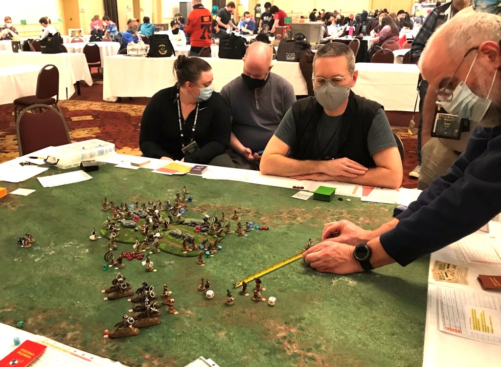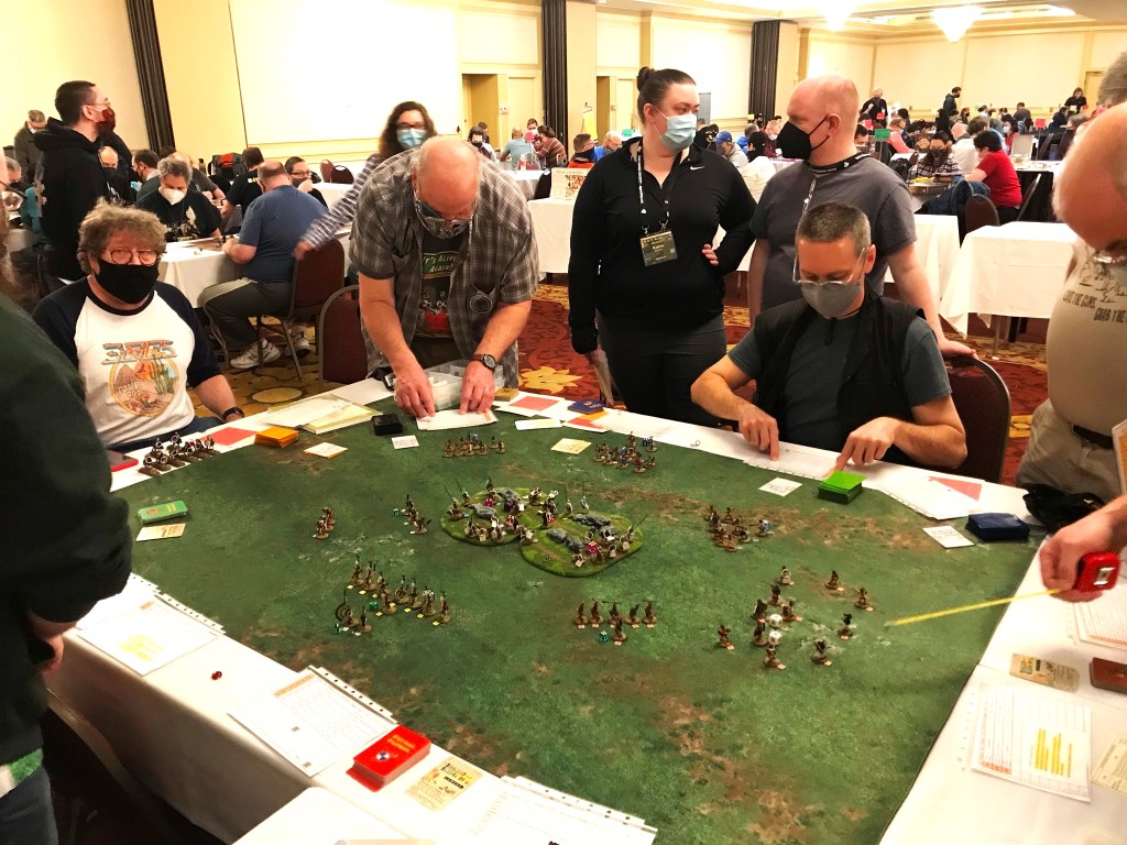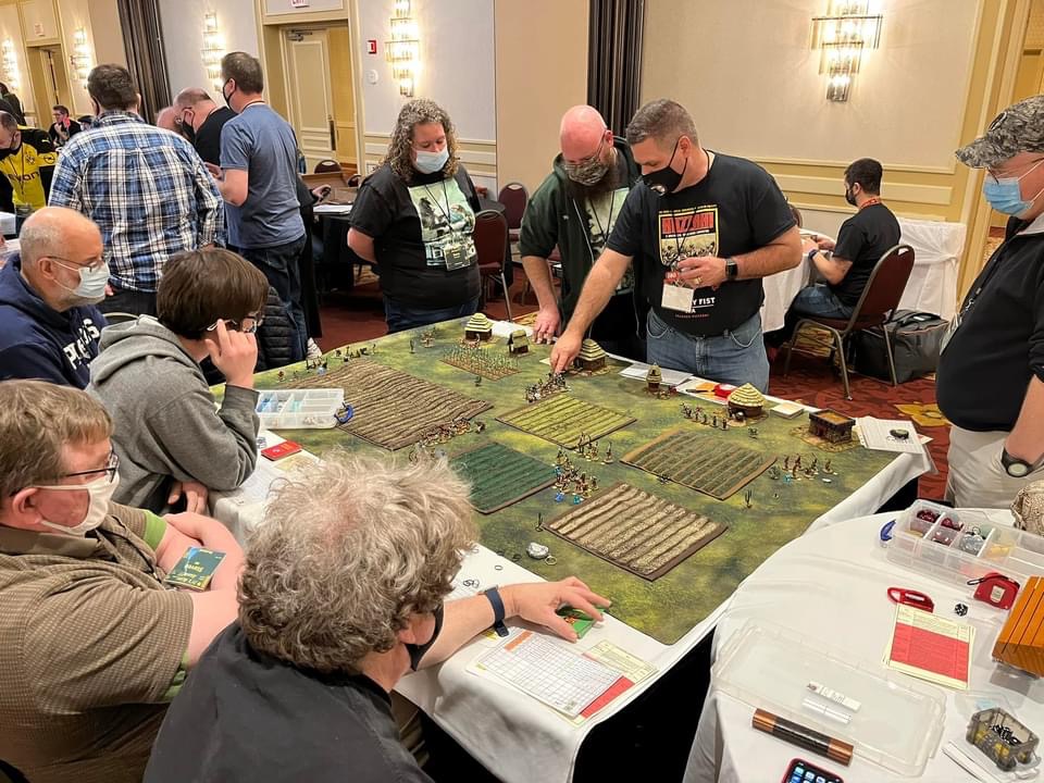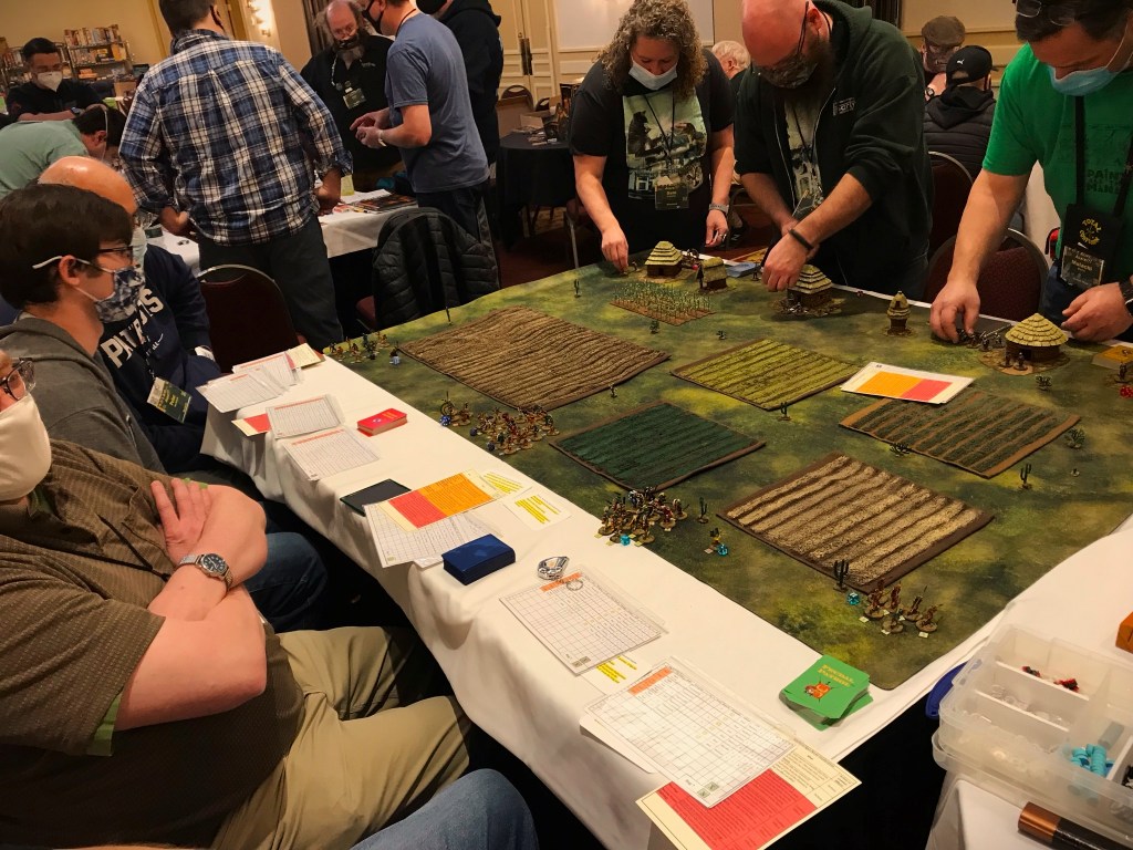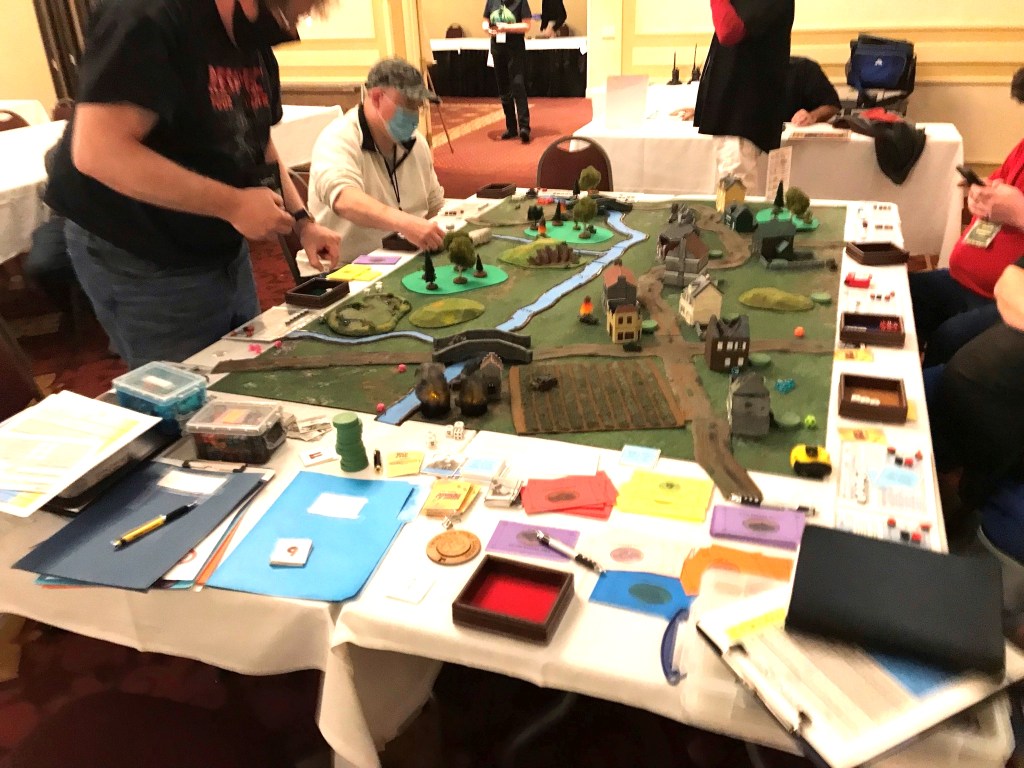 Let’s move on to the game! I was very happy to have my fullest table of the convention- 12 players! A little more than half (7) had at least half had played Feudal Patrol™ before (and most of those were previous players at my other two Feudal Patrol™ games at TotalCon 36 so that was nice to have enticed repeat players). I briefed the game and ran through some examples of play for the newbies, and we were off. As Feudal Patrol™ is extremely easy to learn, all were playing smoothly in no time.