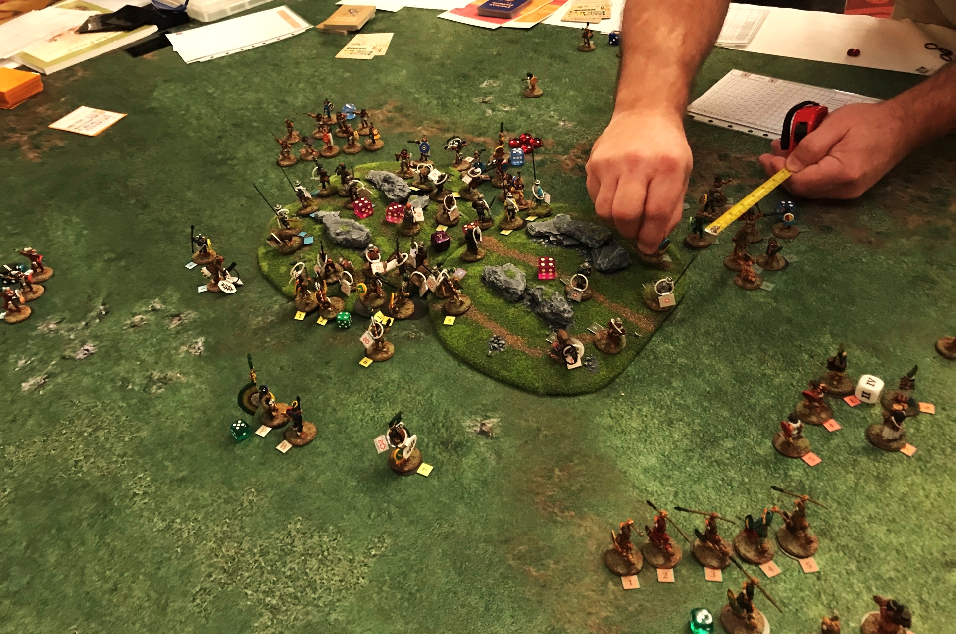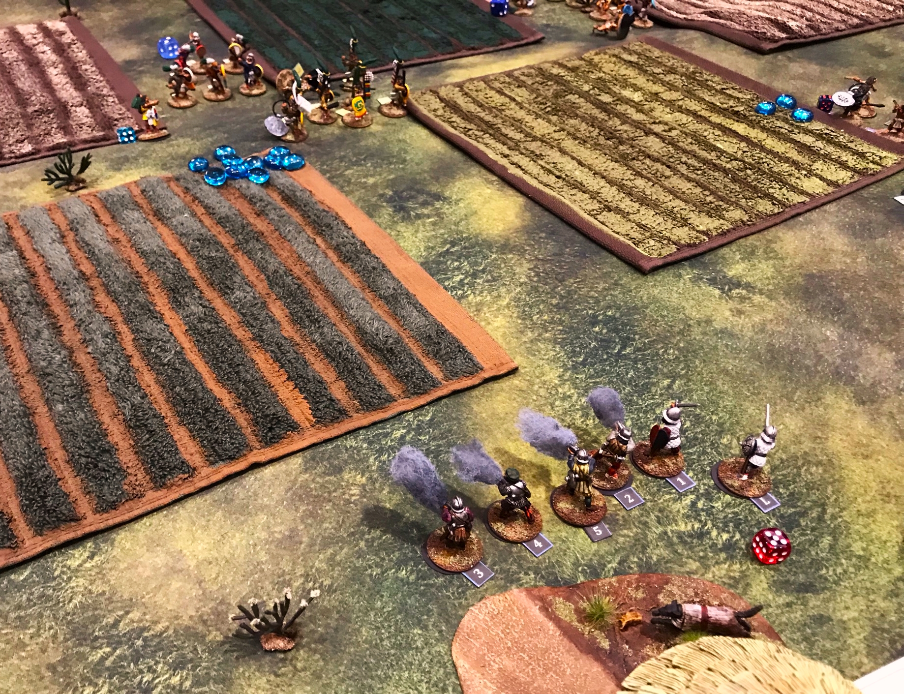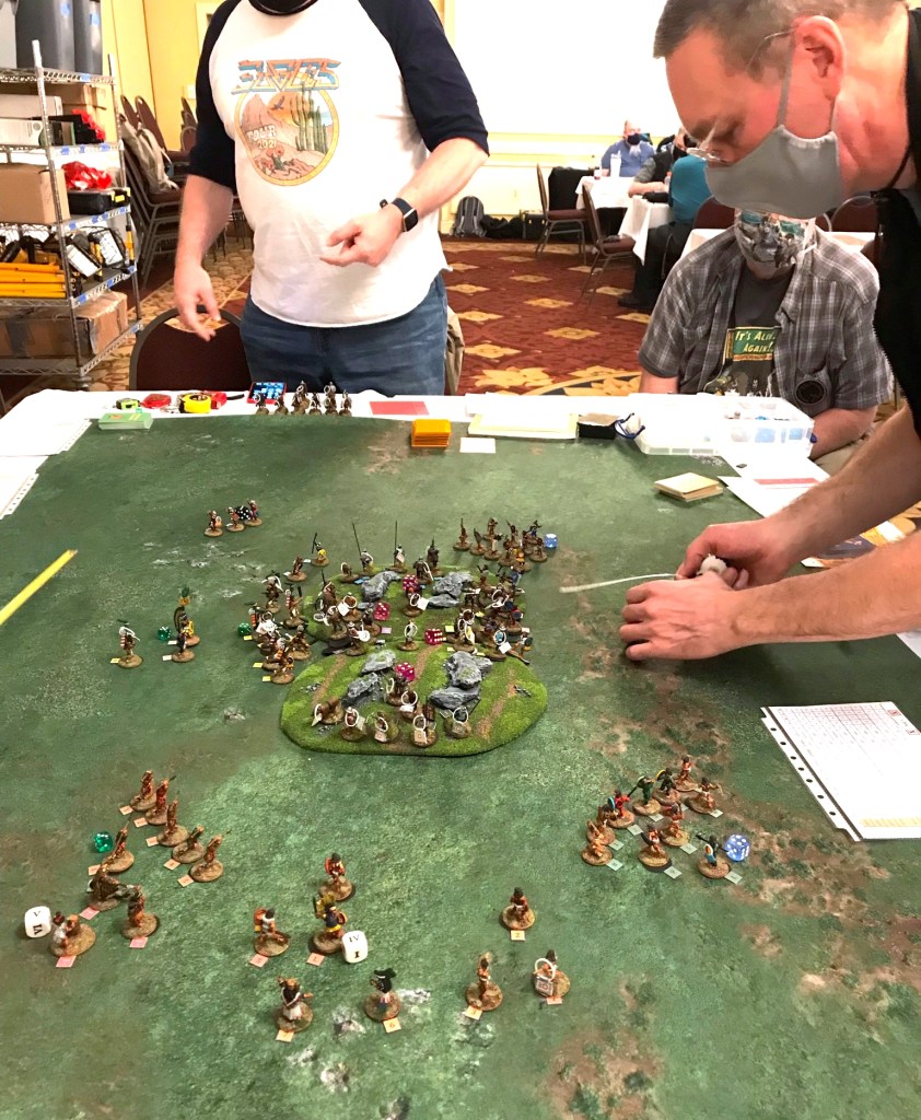 Let’s move on to the game! I was very happy to have my fullest table of the convention- 12 players! A little more than half (7) had at least half had played Feudal Patrol™ before (and most of those were previous players at my other two Feudal Patrol™ games at TotalCon 36 so that was nice to have enticed repeat players). I briefed the game and ran through some examples of play for the newbies, and we were off. As Feudal Patrol™ is extremely easy to learn, all were playing smoothly in no time.
