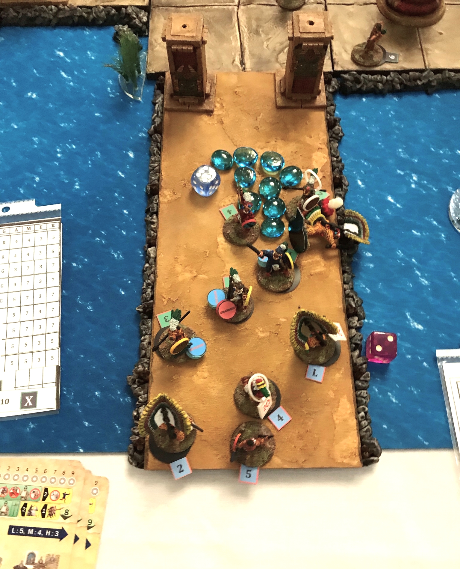 Next, the cavalry activated, and two of them bore down mercilessly on Matlatzincátzin, quickly taking him out – and that earned the Spanish 100 VP -and that pinned ALL of the Aztecs.