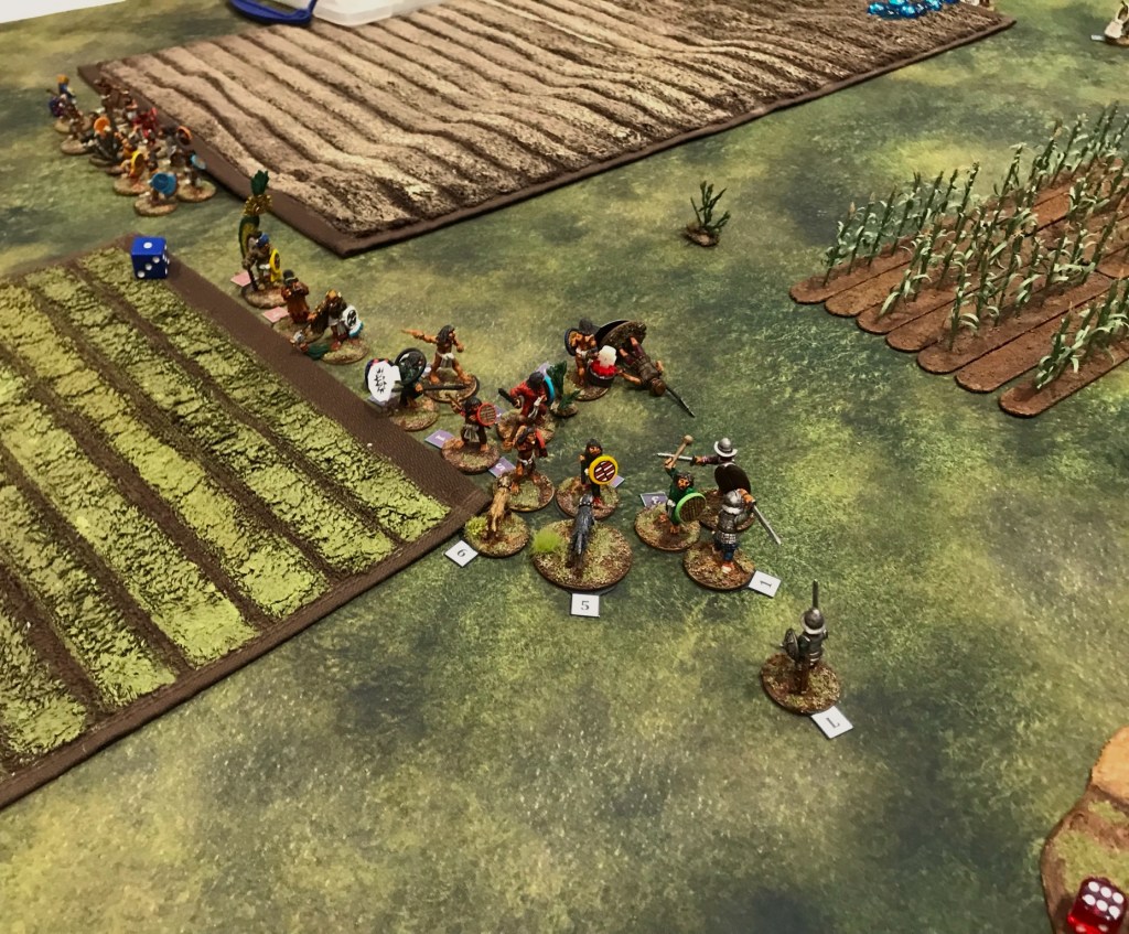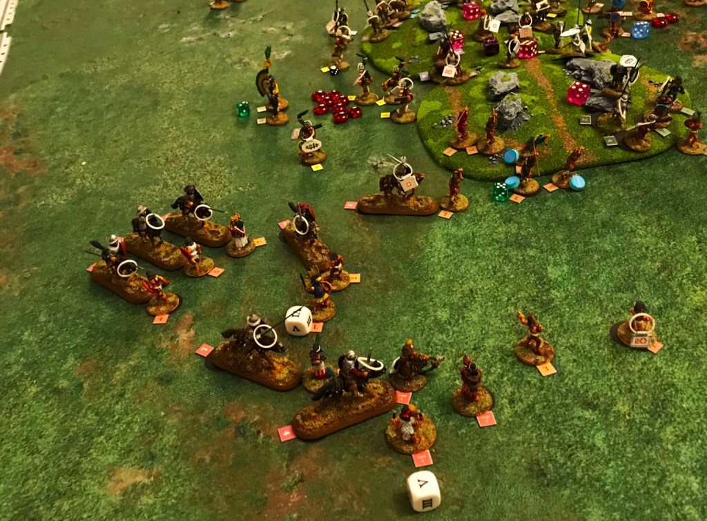 While the rules do not permit infantry to engage moving cavalry, in this tactic they succeeded a bit – as they denied most of the cavalry “impetus”. In the rules, cavalry gets impetus (and a much better attack strength) if it has a straight line of at least 4″ before it hits an enemy. Without impetus, cavalry can still attack, albeit less effectively. While the Retinue Element was activated, Matlatzincátzin and his signalers did not, and could not move.