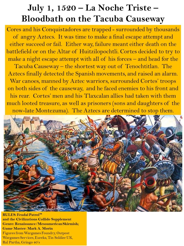 The first game scenario that I ran was “Cortes’ Causeway Escape Attempt”. This involves the Spanish trying to escape Tenochtitlan on June 28, 1520. For those who have not seen my HAVOC posts on the scenario – here is the game briefing:
