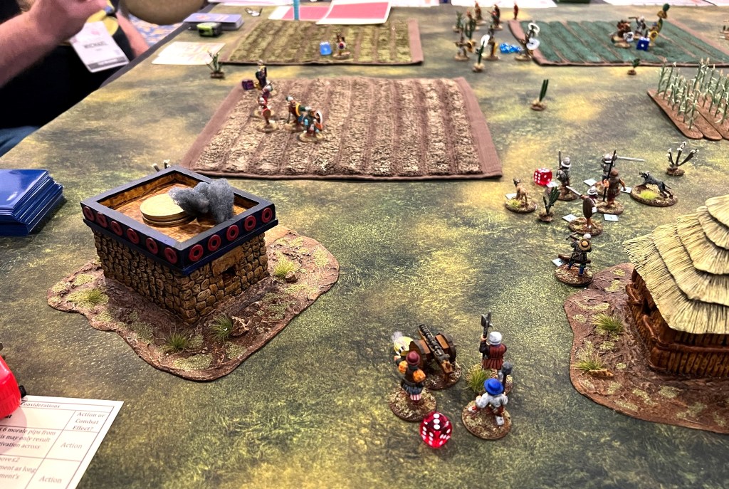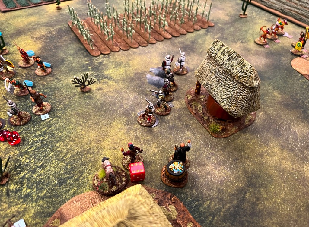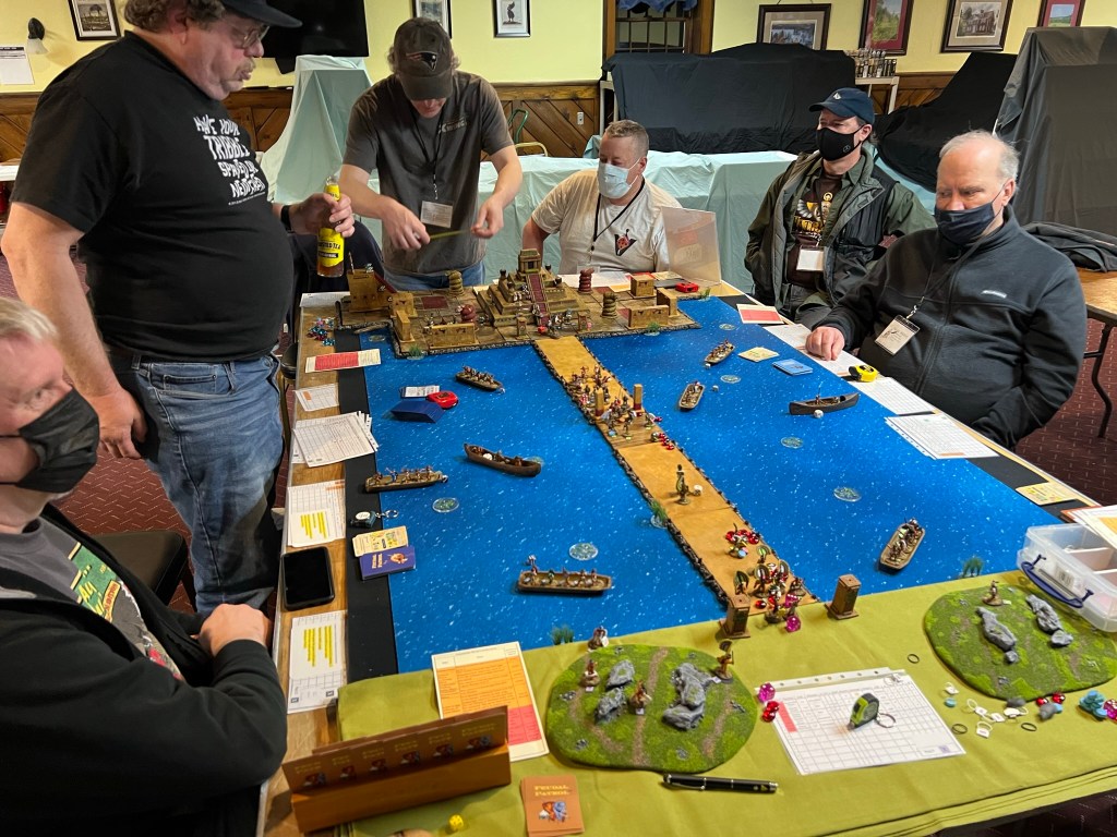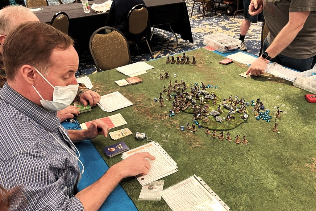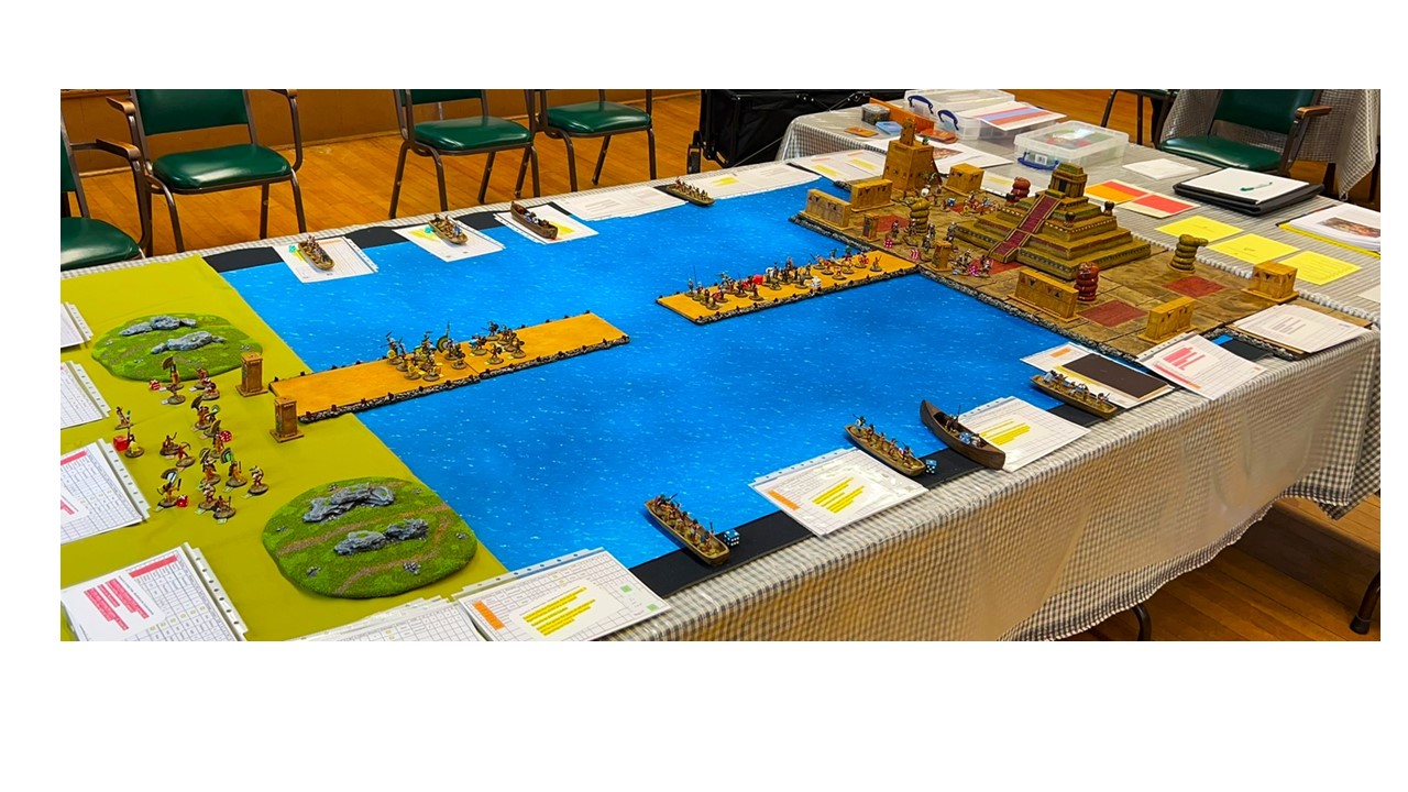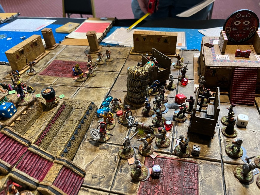 On Friday Morning, I had a full table for my “Surprise Aztec Raid on the Spanish Outpost” scenario. I also ran this game at HAVOC and at TOTALCON 2022. Here is the game briefing: