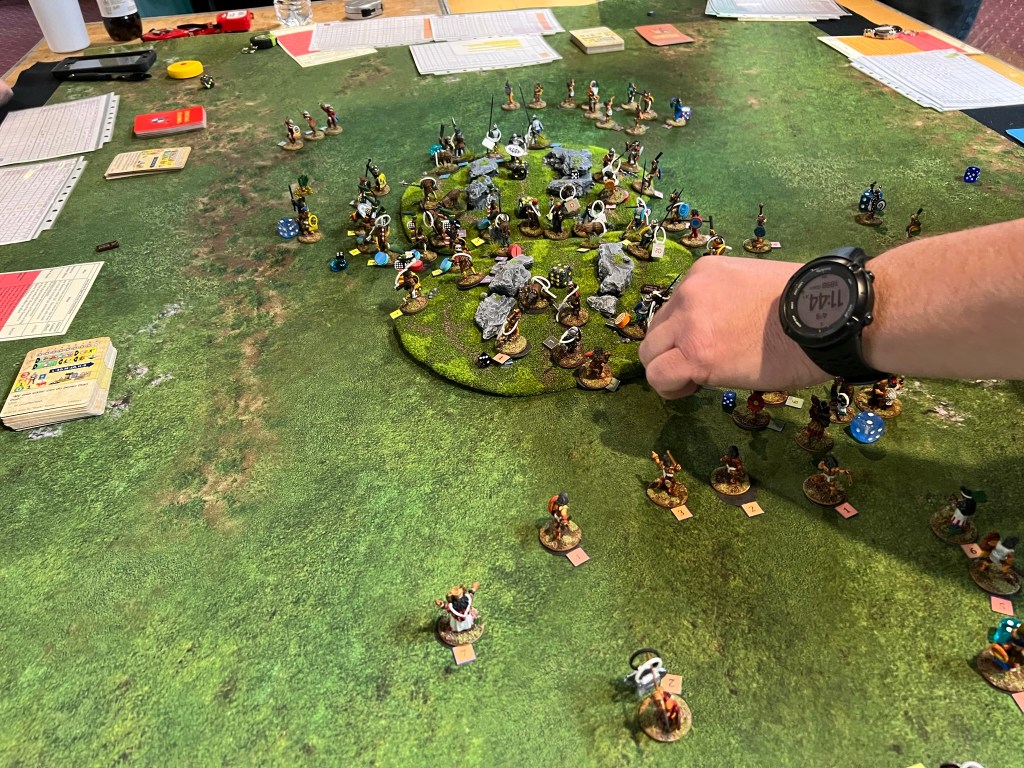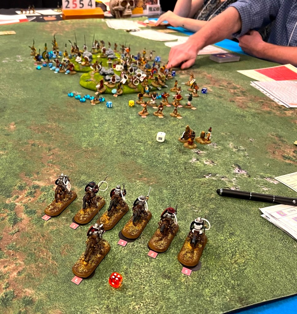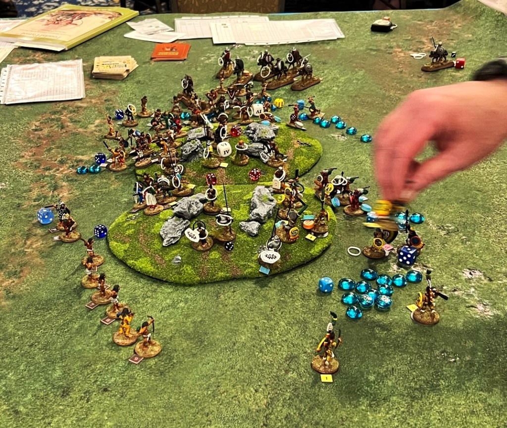 On Saturday morning I ran “The Battle of Otumba” scenario, where the conquistadores held out on a rocky hill against a massive Aztec onslaught while hoping that Cortes would arrive in time with the cavalry to save the day. The cavalry arrived, but were ineffective (just damn unlucky) and the Aztecs won an overwhelming victory with the casualties that they inflicted. I also ran this previously at TOTALCON and HAVOC, but with very different results (which I believe speaks to a balanced scenario).