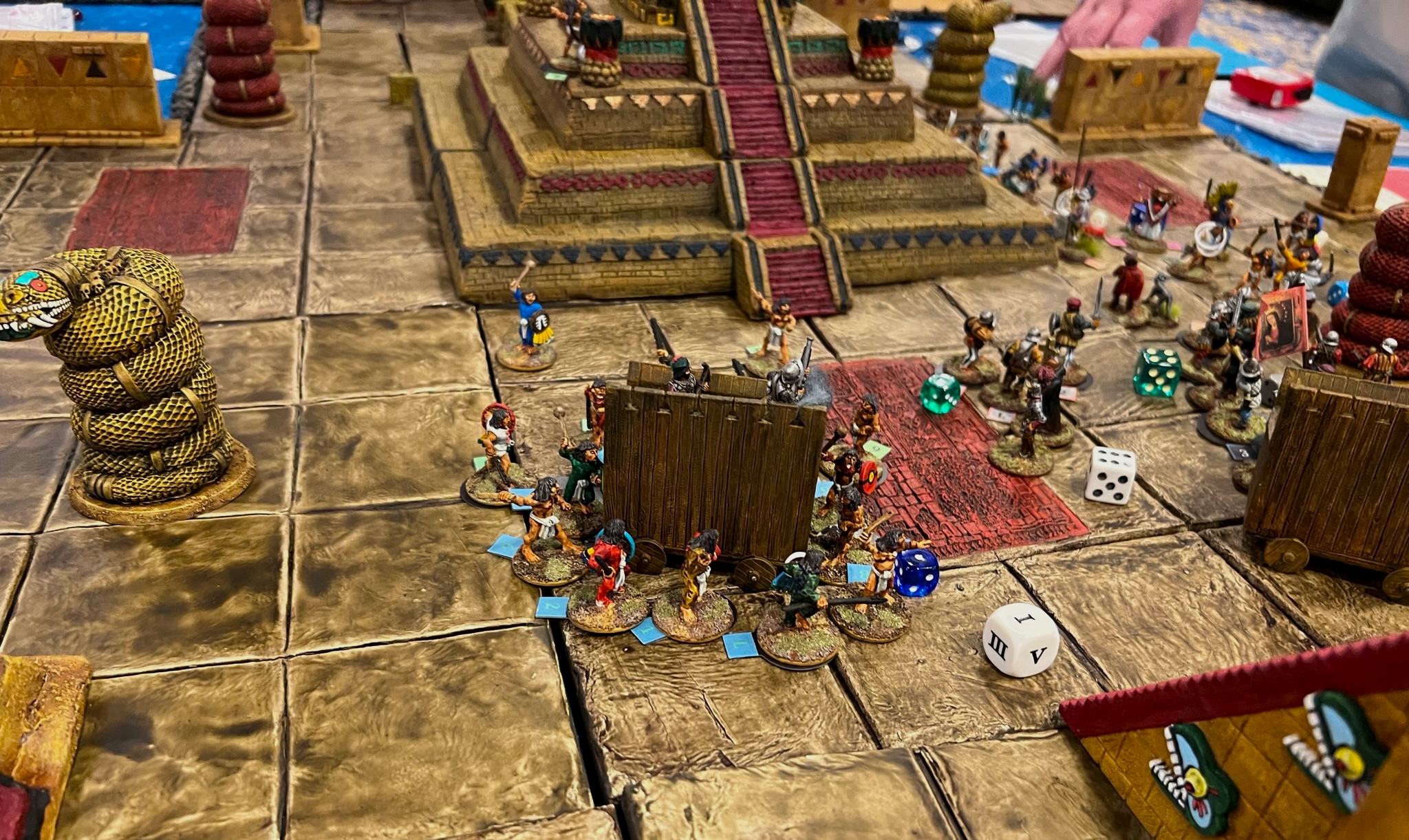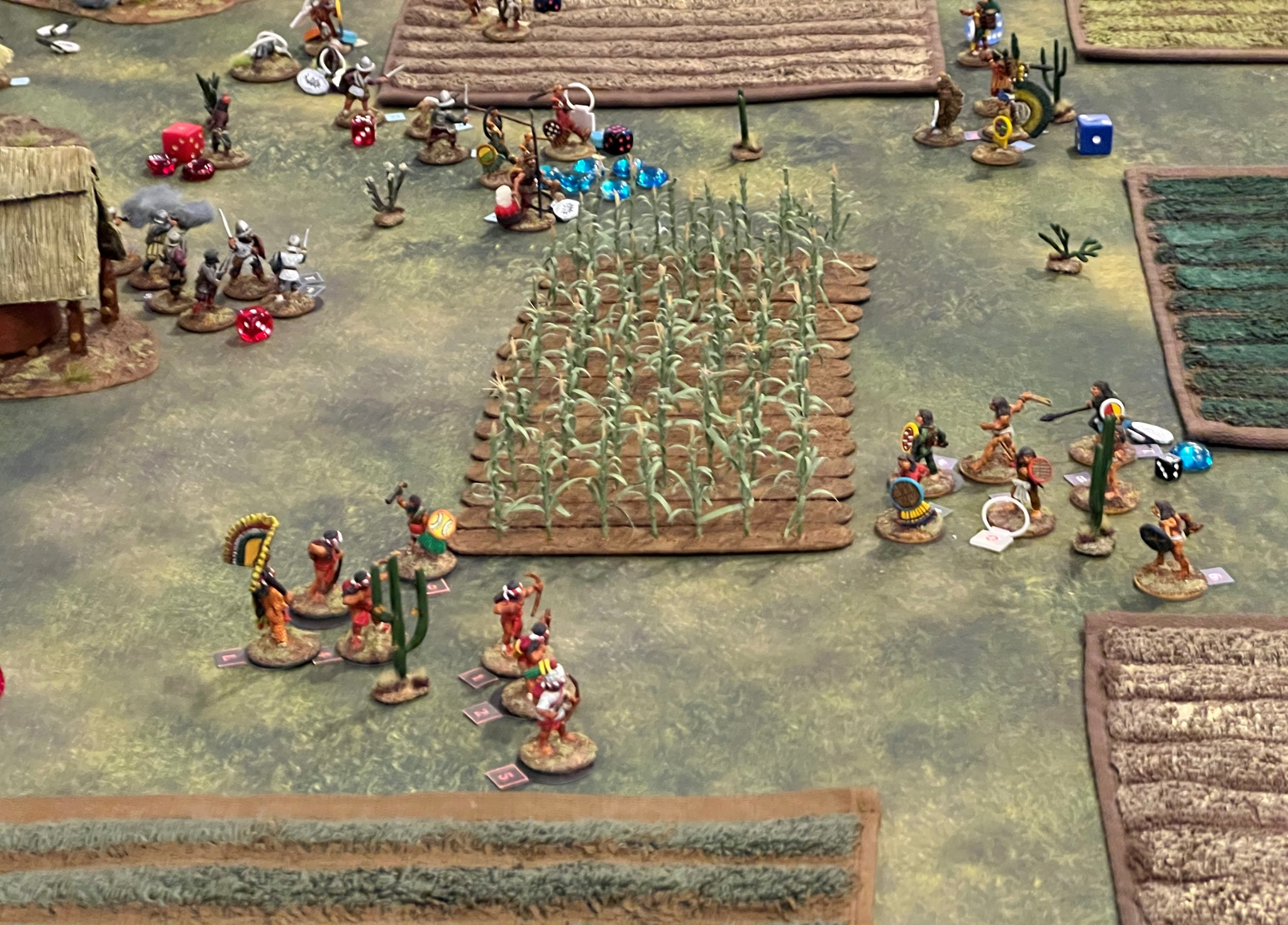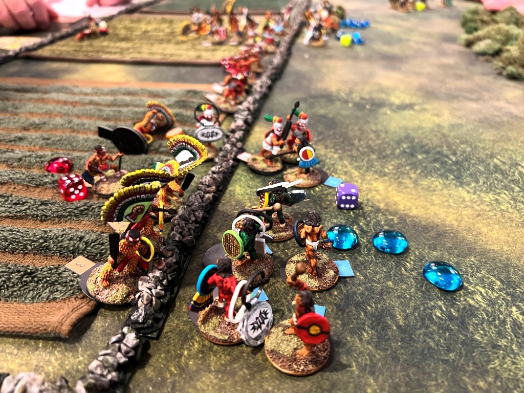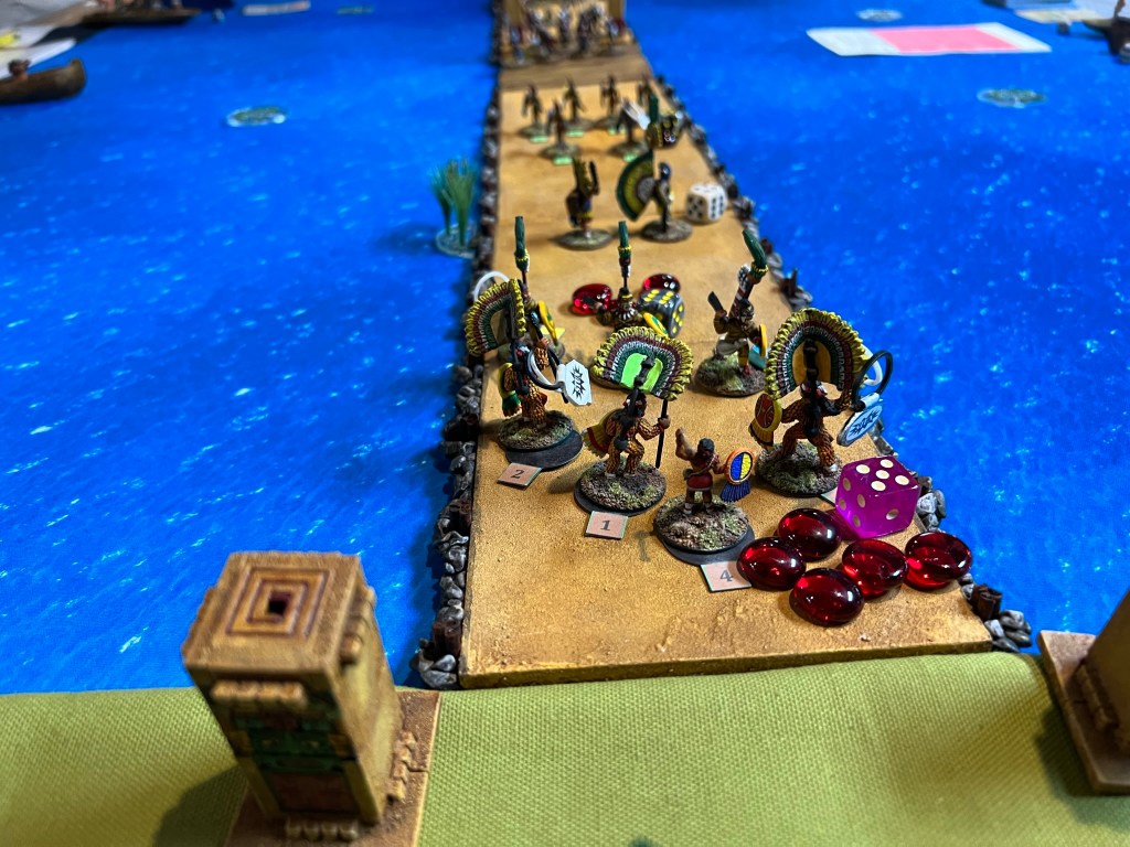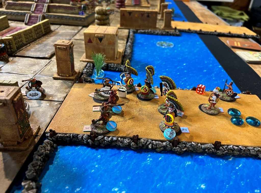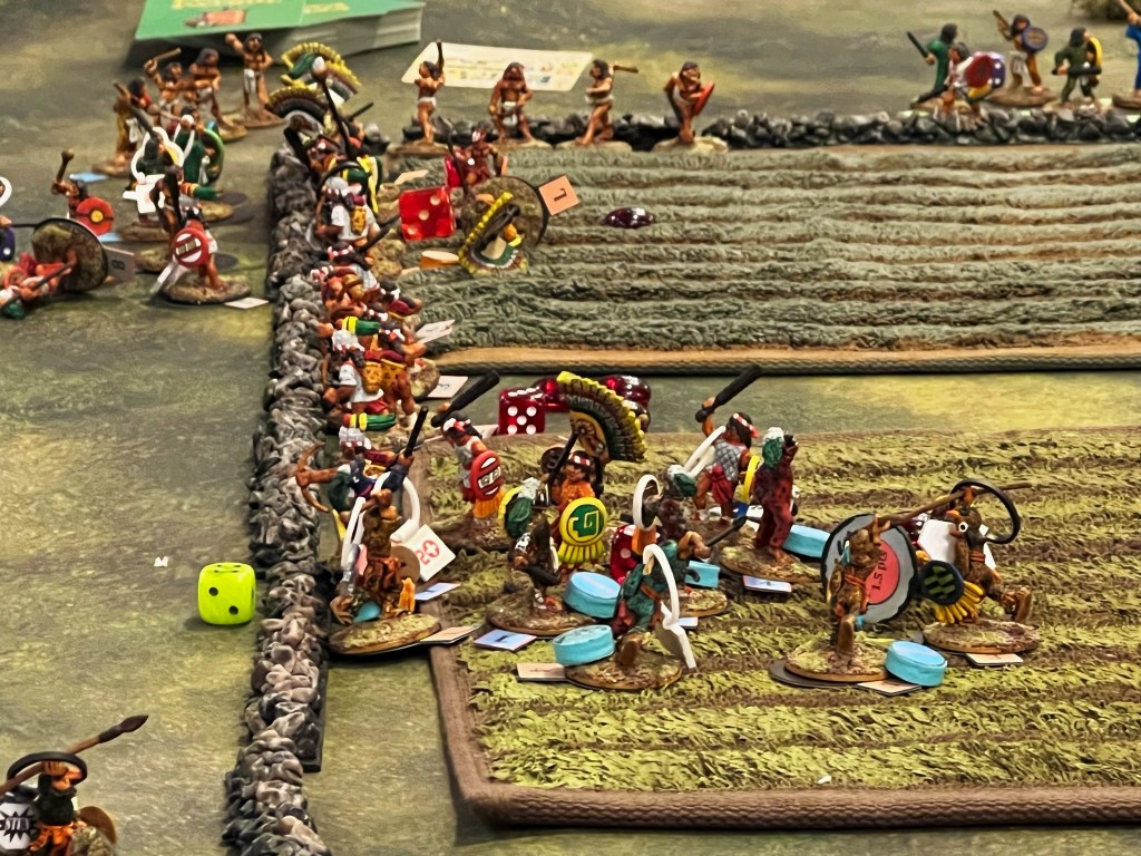 In the game. the Spanish broke through the Aztecs, though at significant cost. The Aztec commander was taken out by the Tlaxcalans (Conquistador allies). This was effective at reducing the Aztecs command and control, allowing Cortes to live for another day…again. Below are some game pics with a few descriptions.