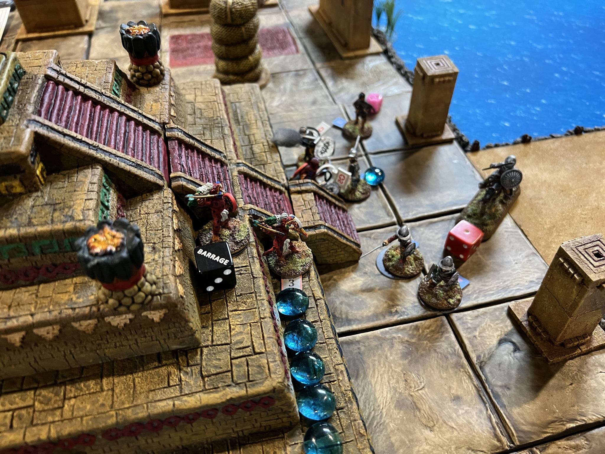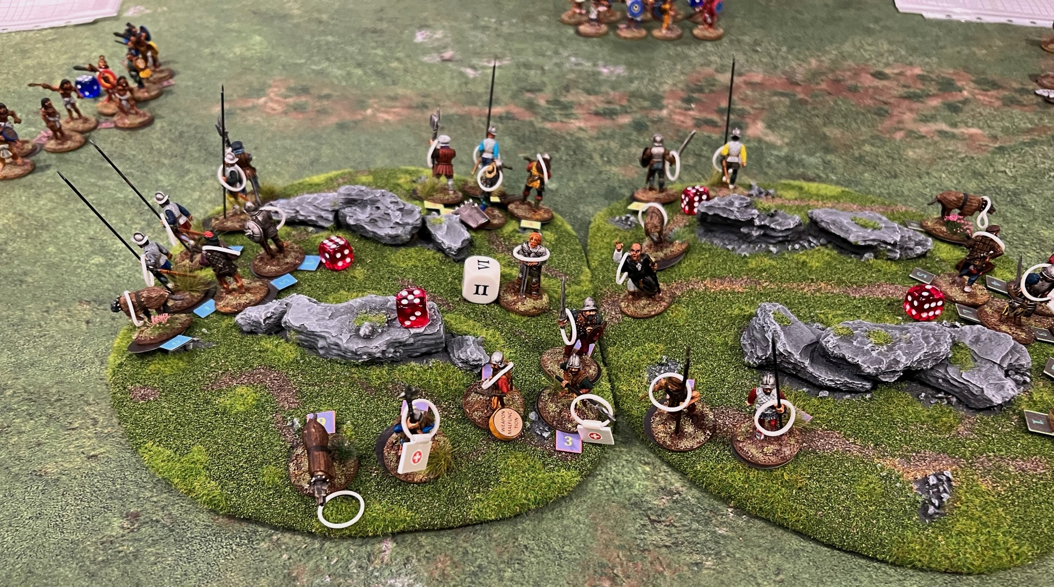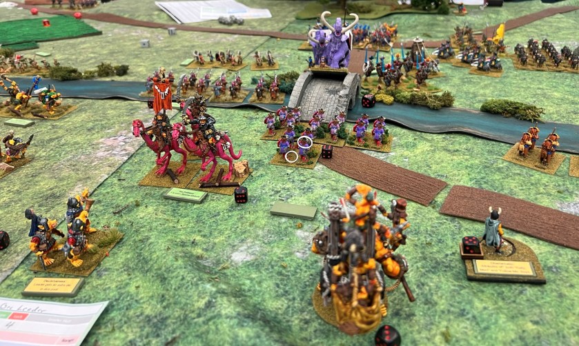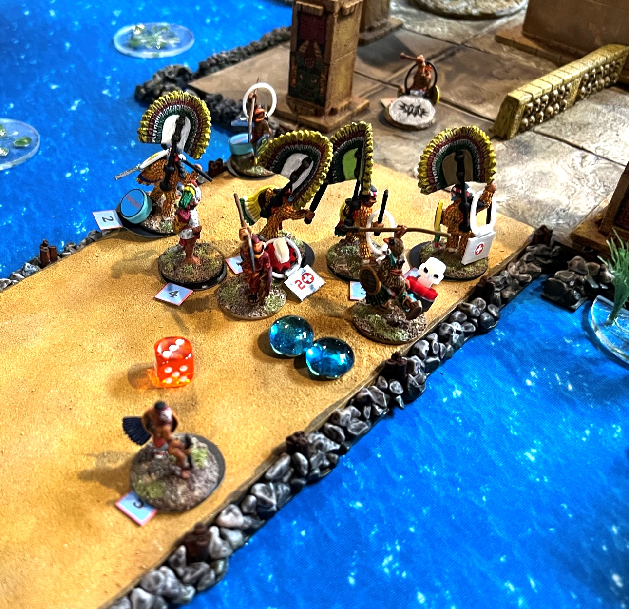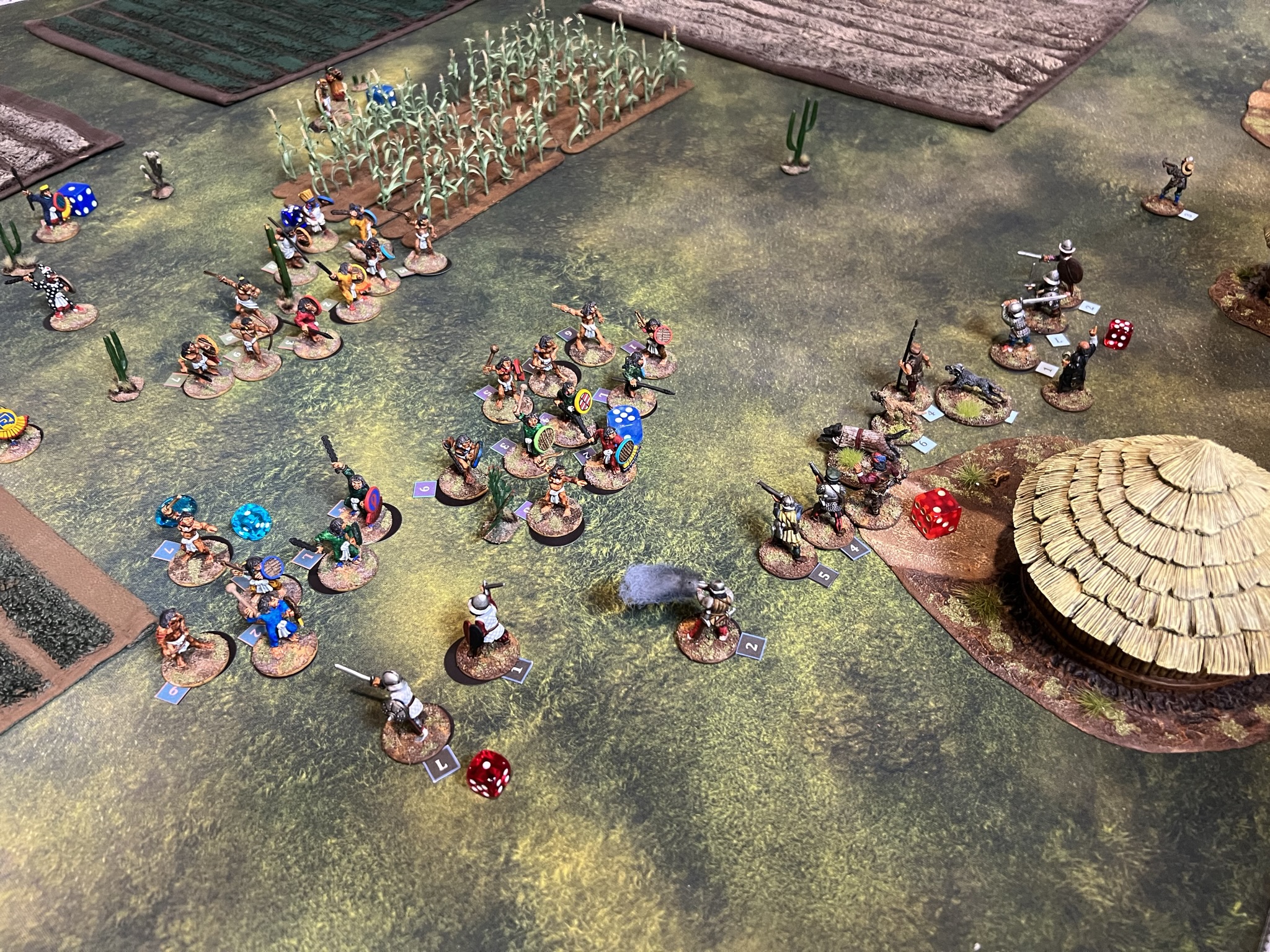 In the game. the Spanish broke through the Aztecs, though at significant cost. The Aztec commander was taken out by the Tlaxcalans (Conquistador allies). This was effective at reducing the Aztecs command and control, allowing Cortes to live for another day…again. Below are some game pics with a few descriptions.