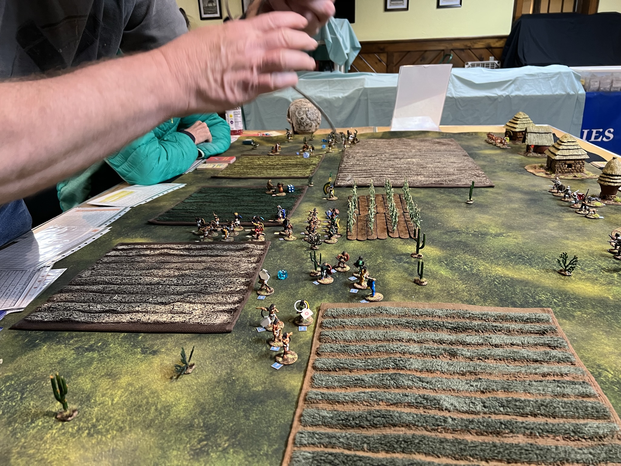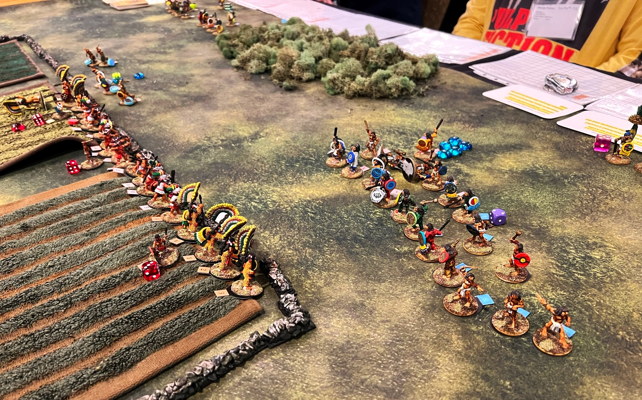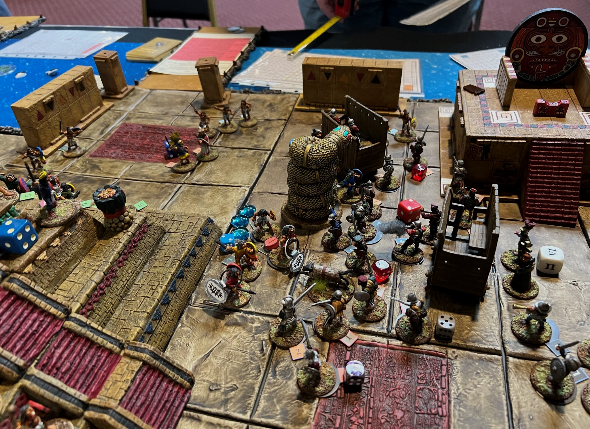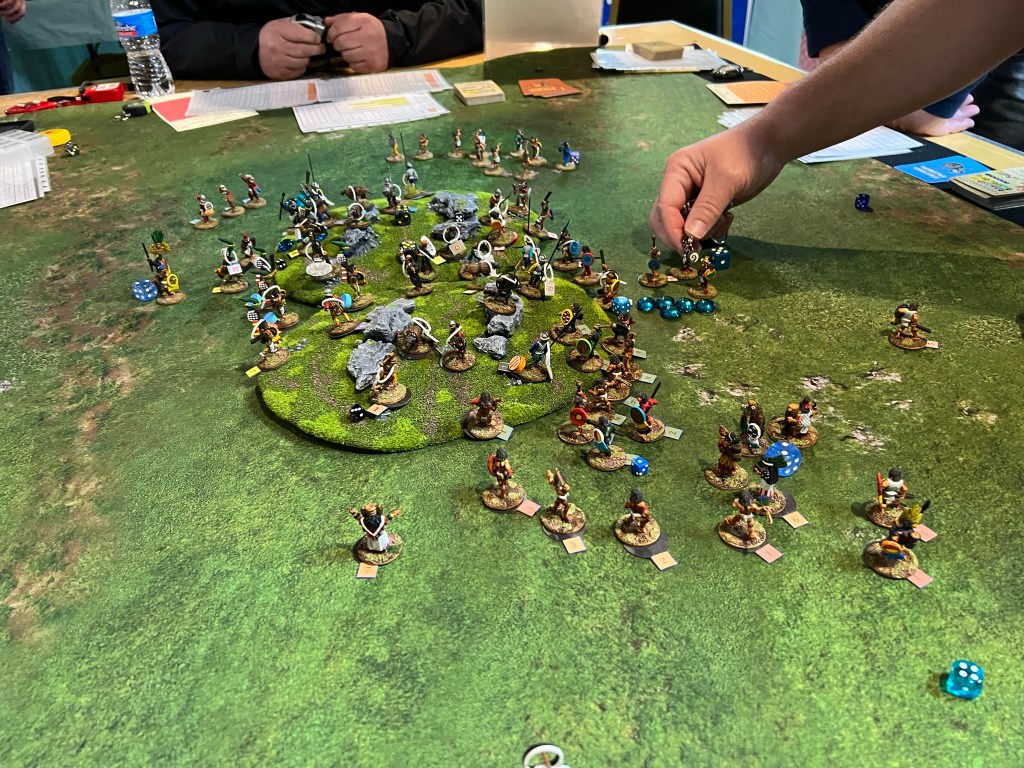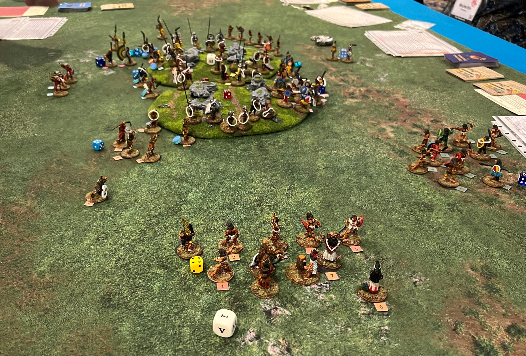 Here, the Aztecs outnumbered the Tlaxcalans and used maneuver effectively, and inflicted a good number of casualties . Meanwhile the Tlaxcalans made good use of terrain and made the Aztecs pay for their assault. In the end, the defenders got more points than the Aztecs and eked out a victory. 32.5 to 22. It was a really nice way to end the con with a good group of players!