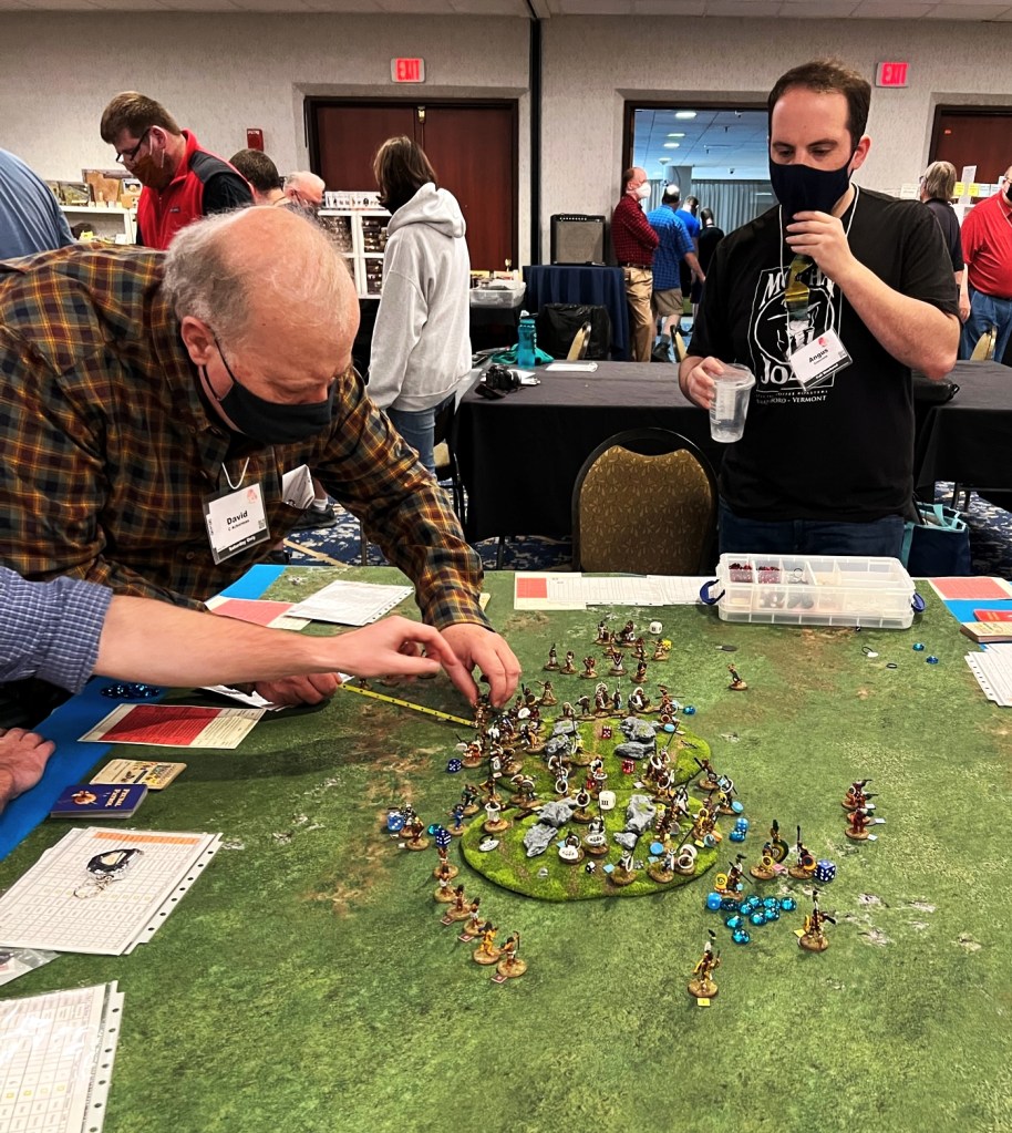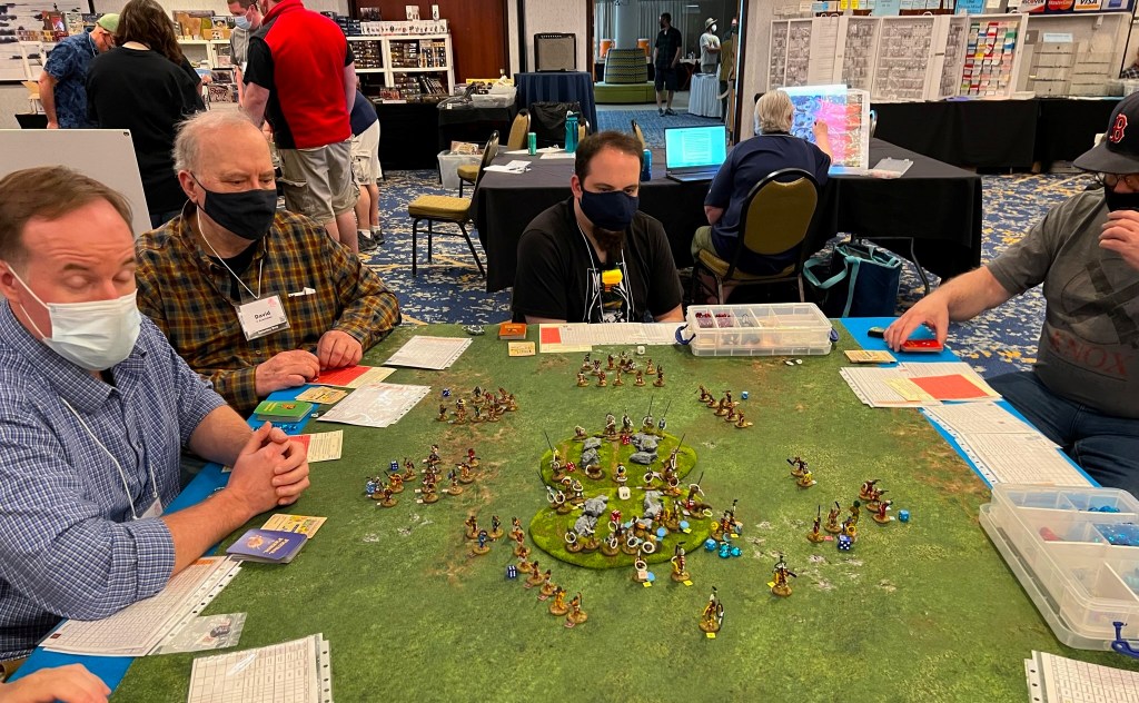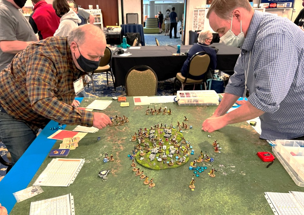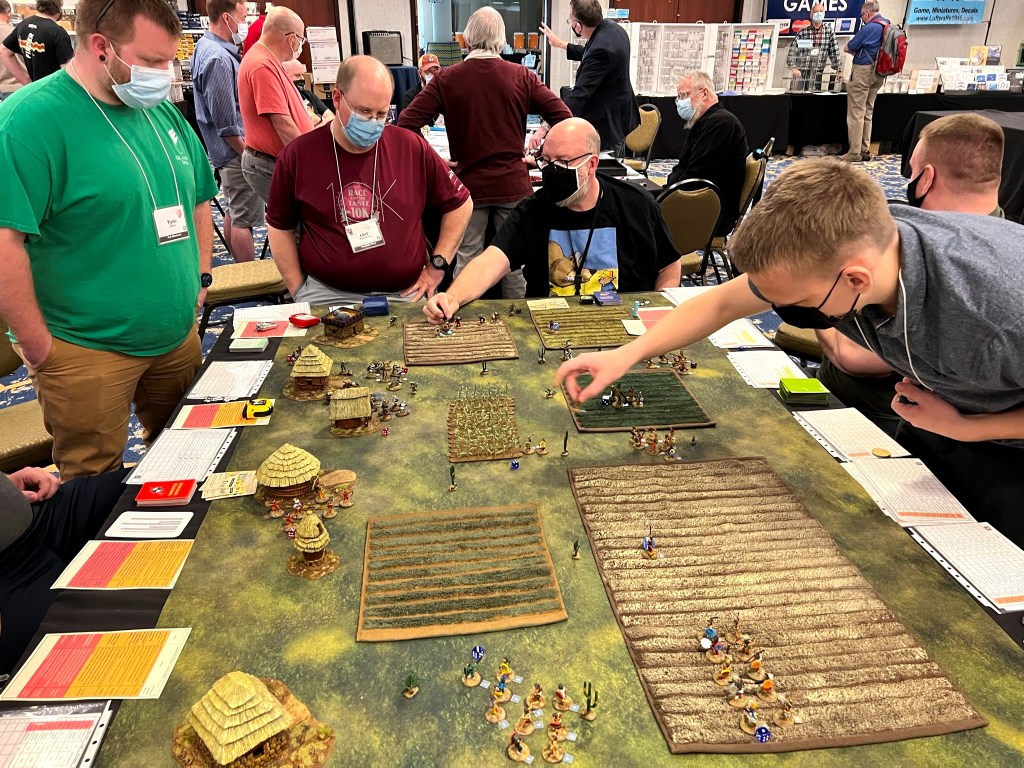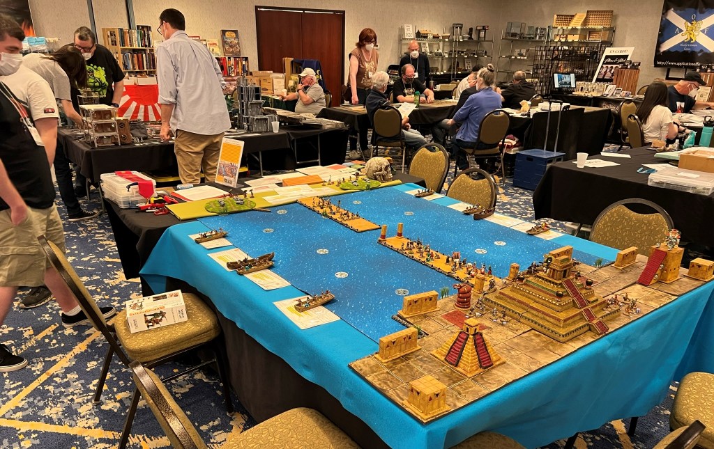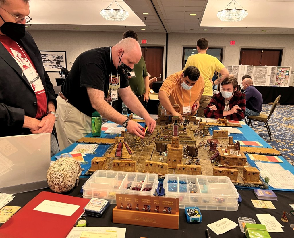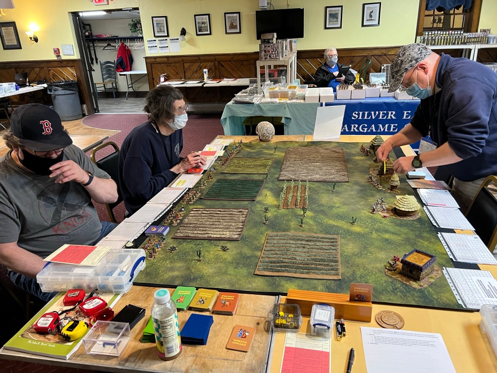 And that became 2022 – which was the return of HUZZAH! By this time I had a LOT of games that I had build for Mesoamerica and the Spanish Conquest. There were 8 four-hour game slots available at the convention – one on Thursday evening, three on Friday and Saturday, and one on Sunday morning. Of course – I had just ran 4 four-hour games at HAVOC in Massachusetts in April. So, I thought, why not push myself and run 6 Feudal PatrolTM games in four days? Hell, it would be fun my using my supplement for Civilizations Collide for so many games to a brand new audience.