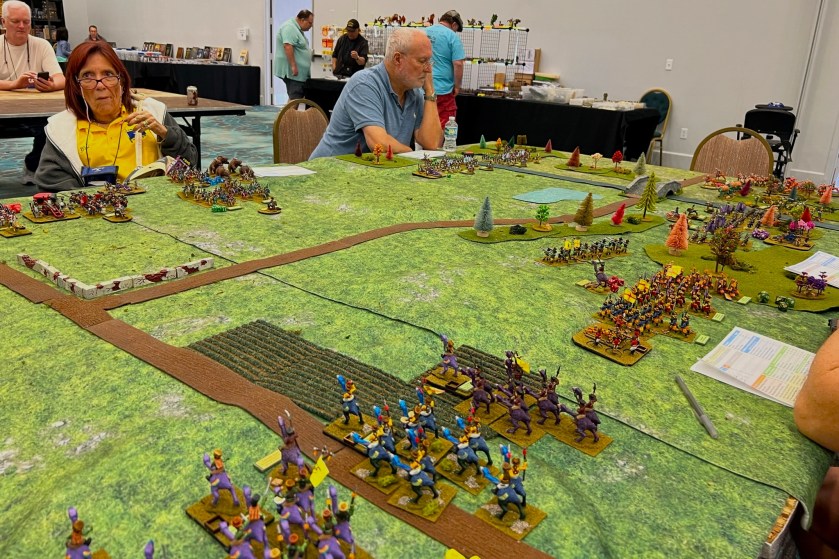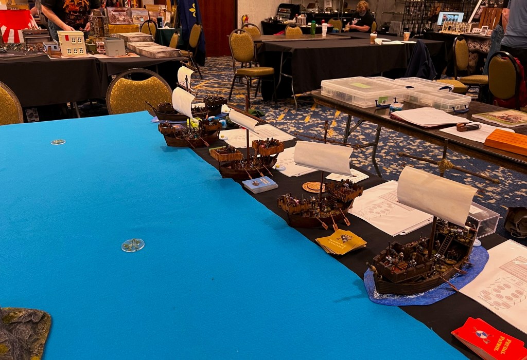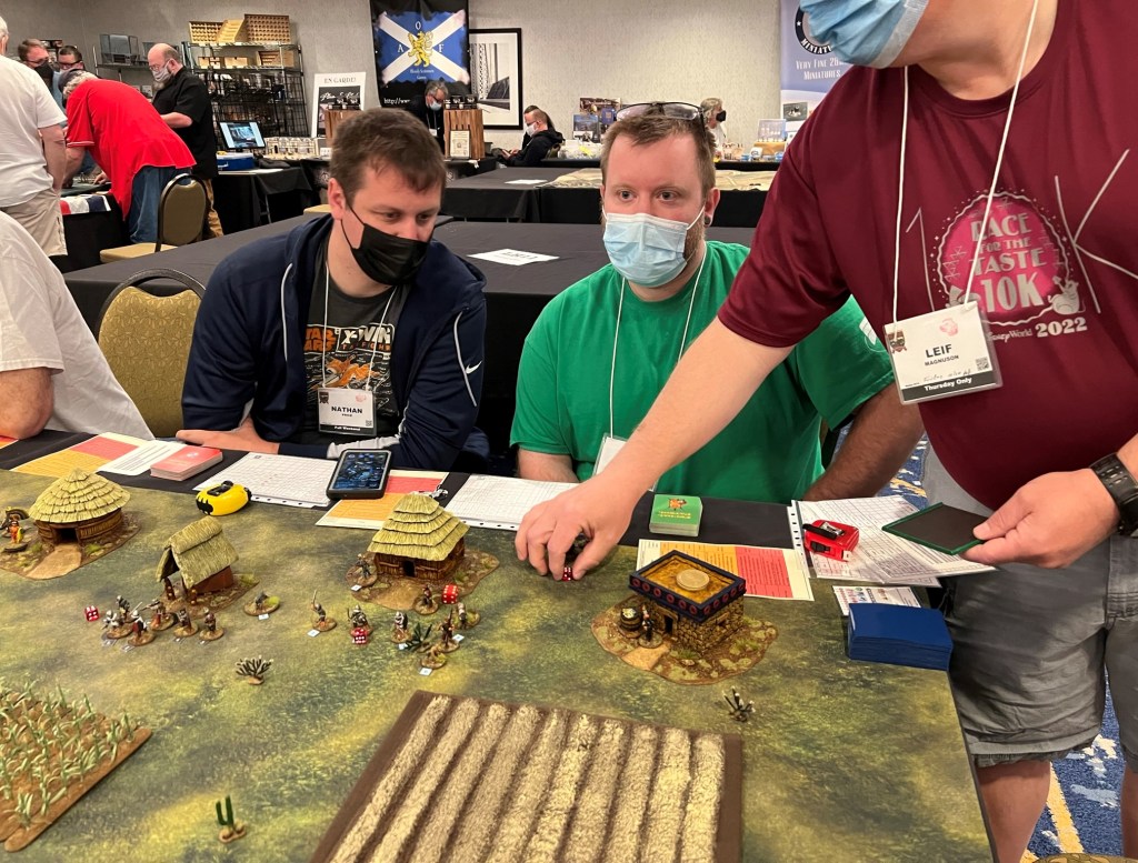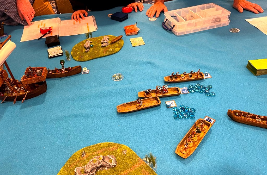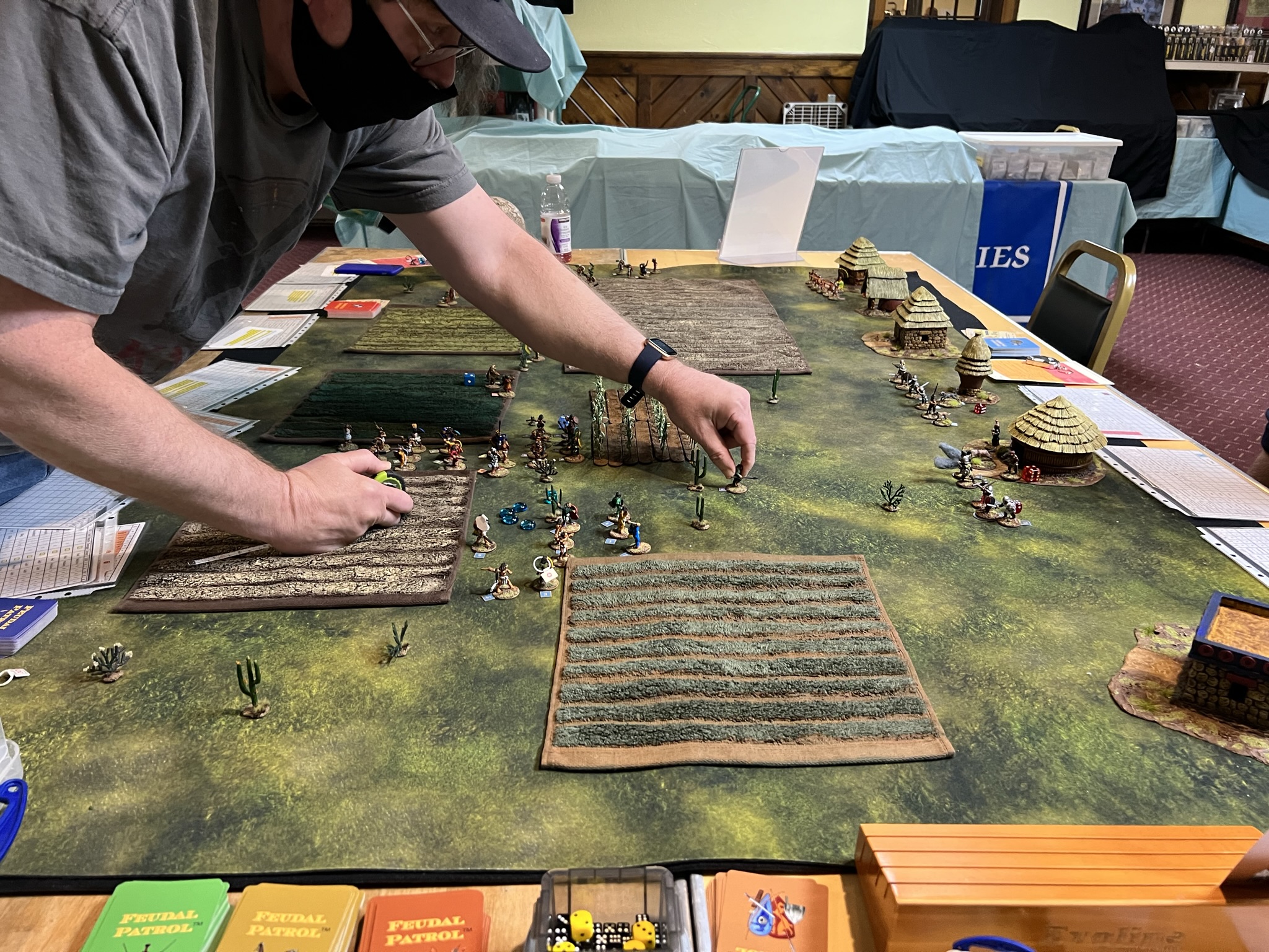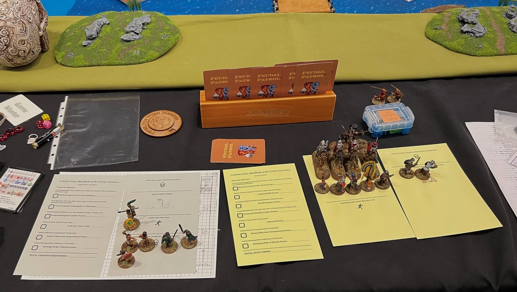 And that became 2022 – which was the return of HUZZAH! By this time I had a LOT of games that I had build for Mesoamerica and the Spanish Conquest. There were 8 four-hour game slots available at the convention – one on Thursday evening, three on Friday and Saturday, and one on Sunday morning. Of course – I had just ran 4 four-hour games at HAVOC in Massachusetts in April. So, I thought, why not push myself and run 6 Feudal PatrolTM games in four days? Hell, it would be fun my using my supplement for Civilizations Collide for so many games to a brand new audience.