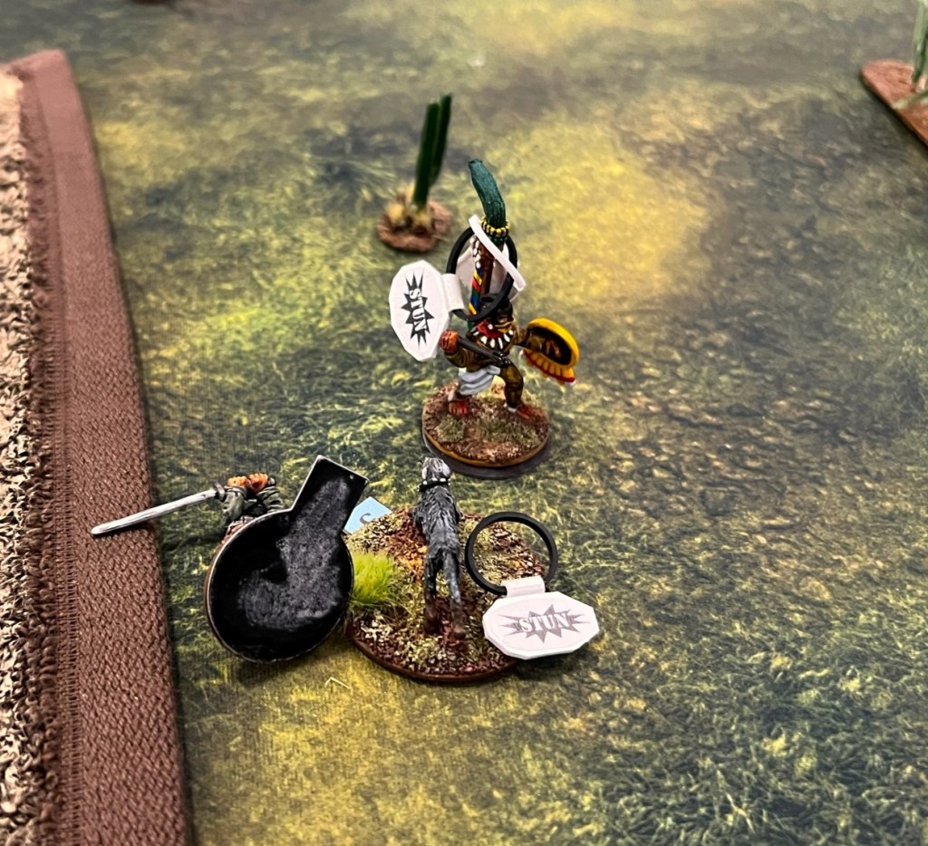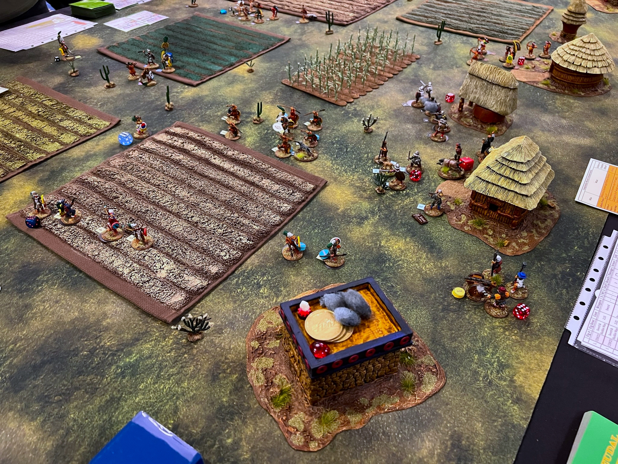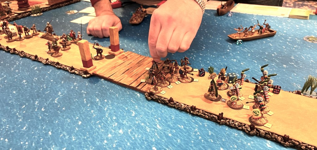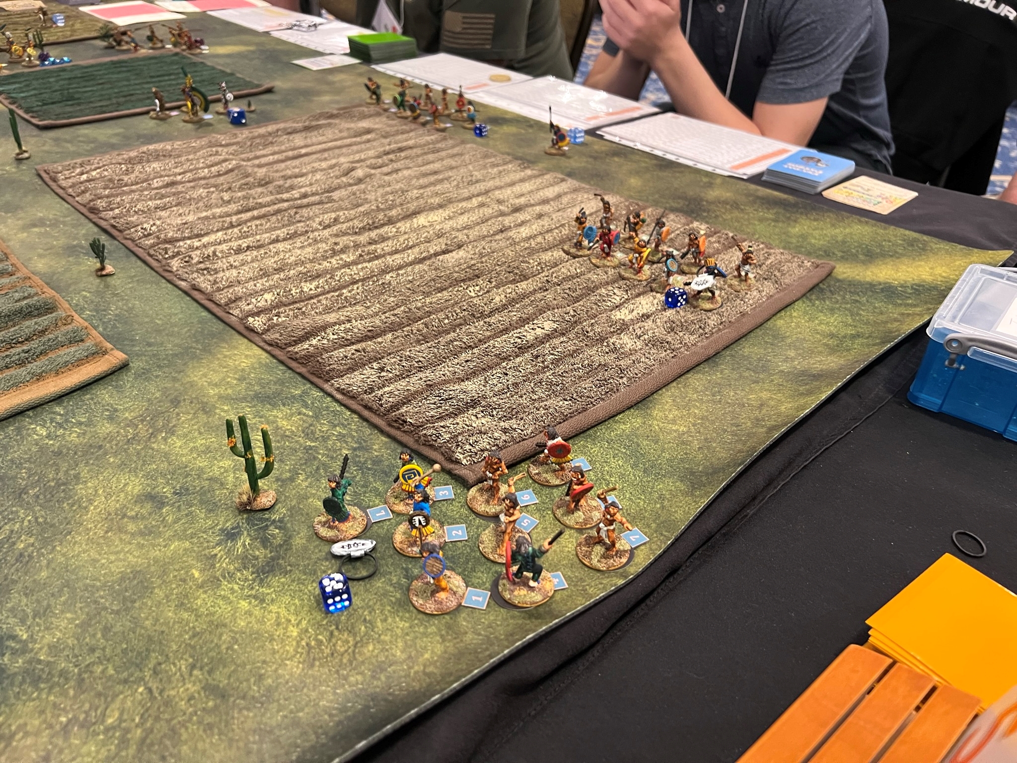 On the final day of the con, I an my 6th (!) Feudal Patrol game in 4 calendar days, “Raid to Satisfy Huitzilopochtli”. This is set pre-Spanish Conquest and simulates a “Flower War” that the Aztecs historically used to seize food, wealth, and people from their unlucky neighbors like the Tlaxcalans. This was the first scenario that I had designed for Civilizations Collide, but I had not run it in a while – so it was nice to see how it played out.