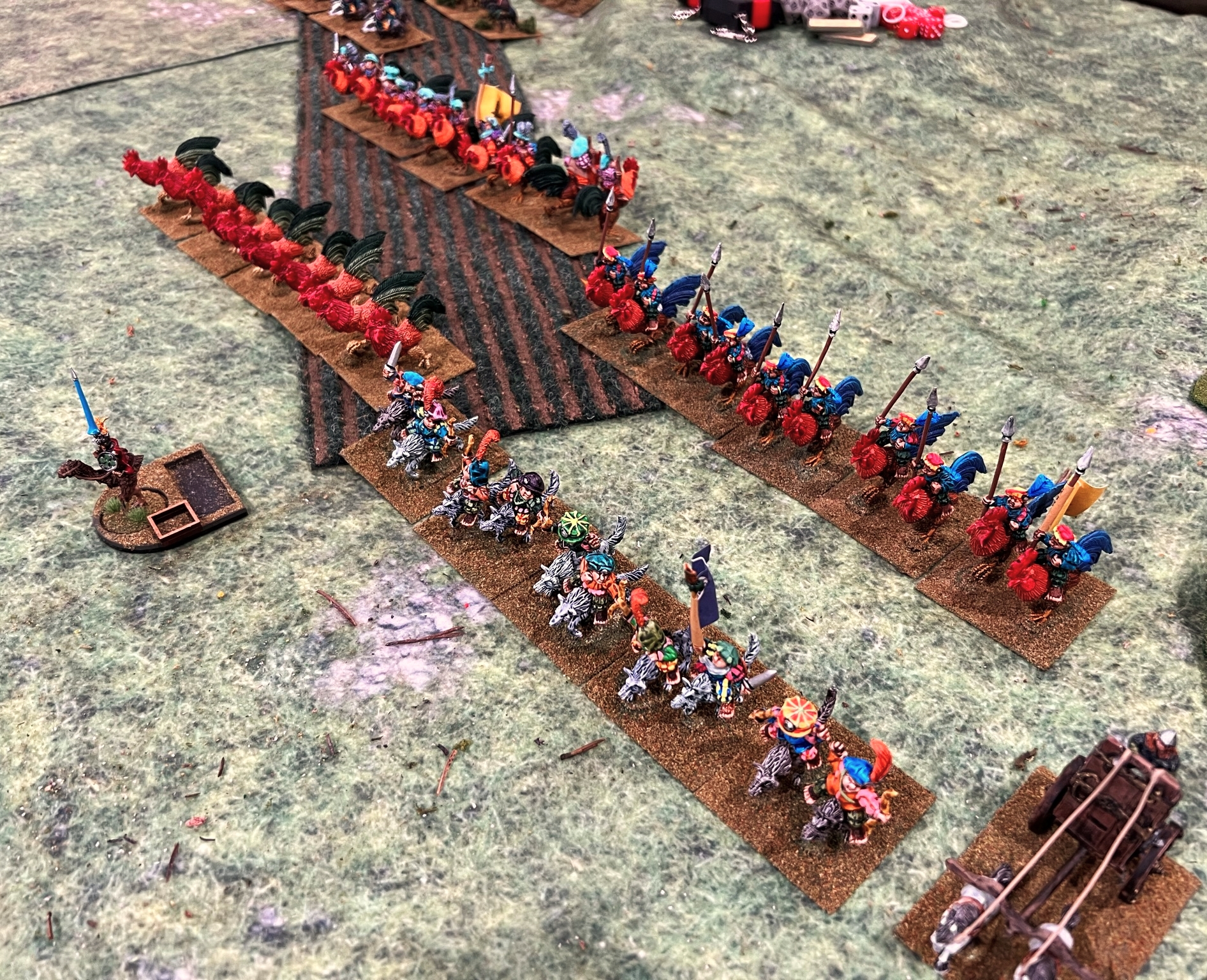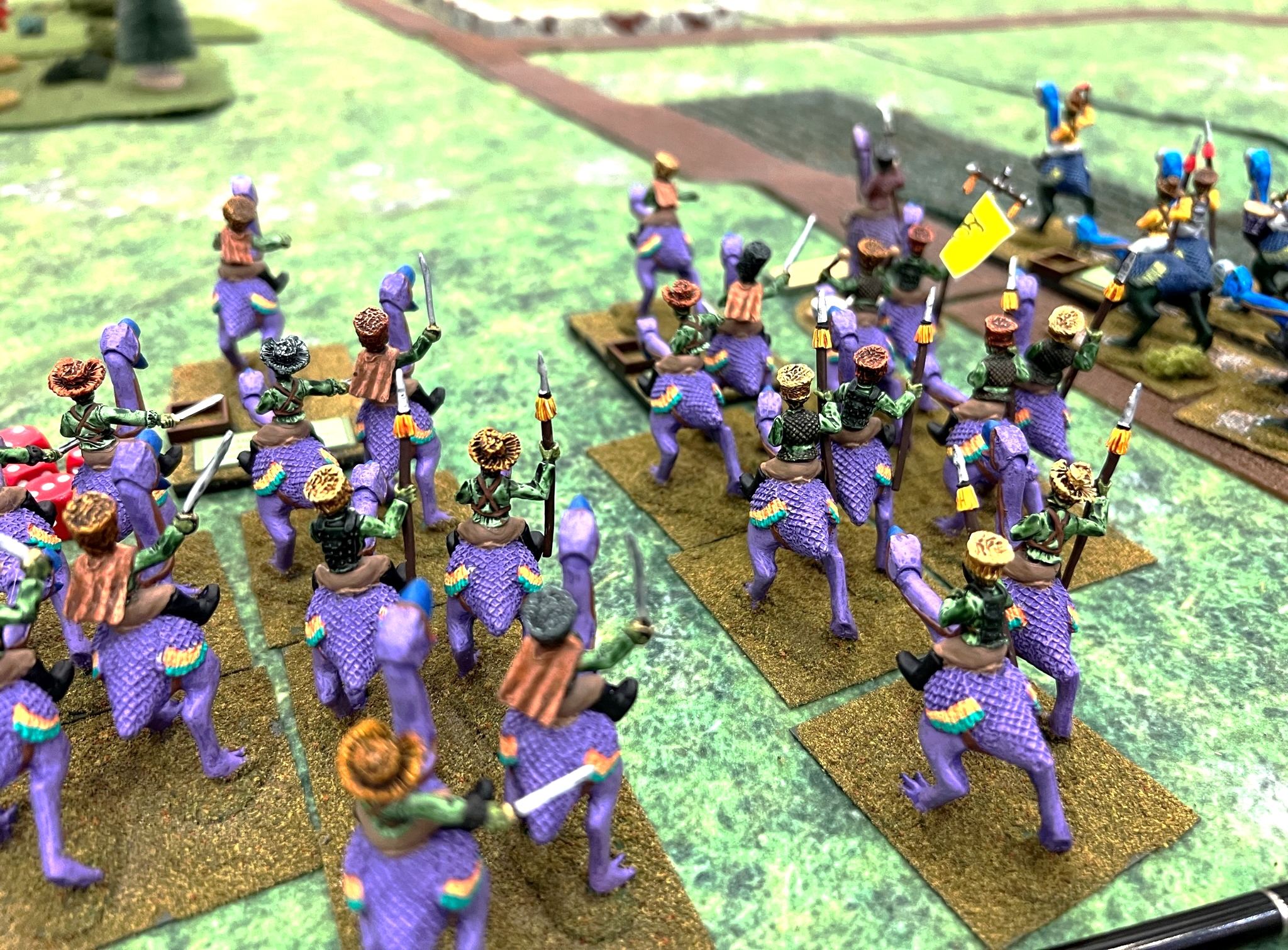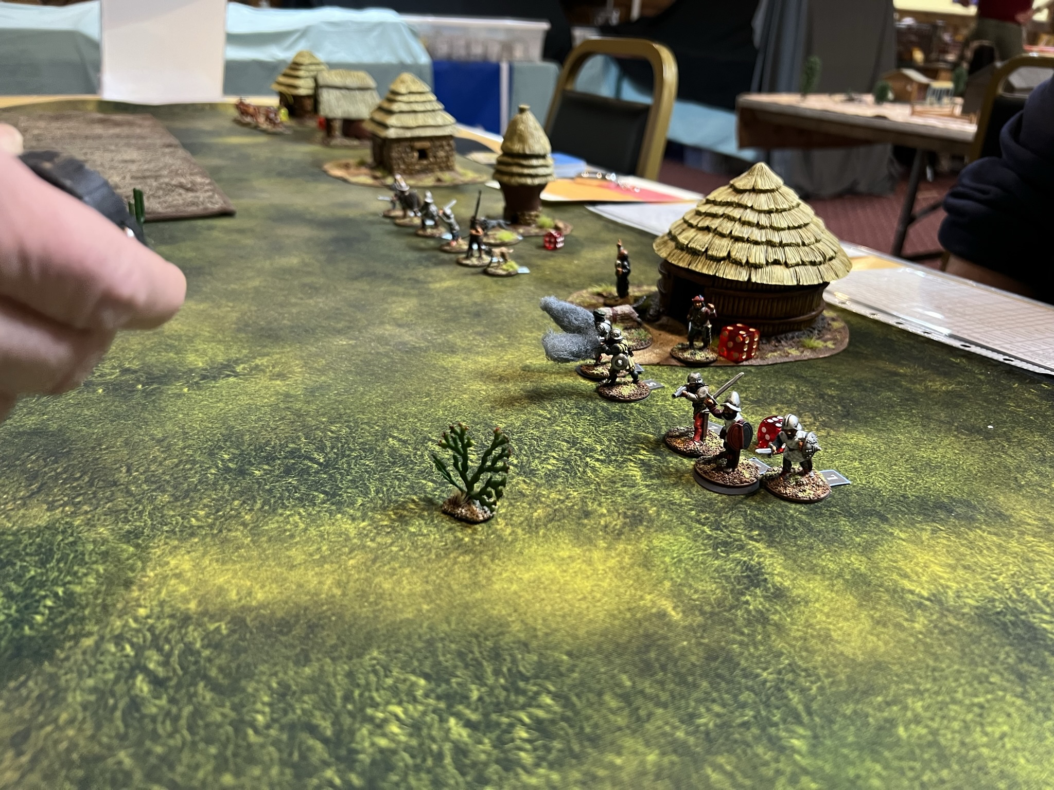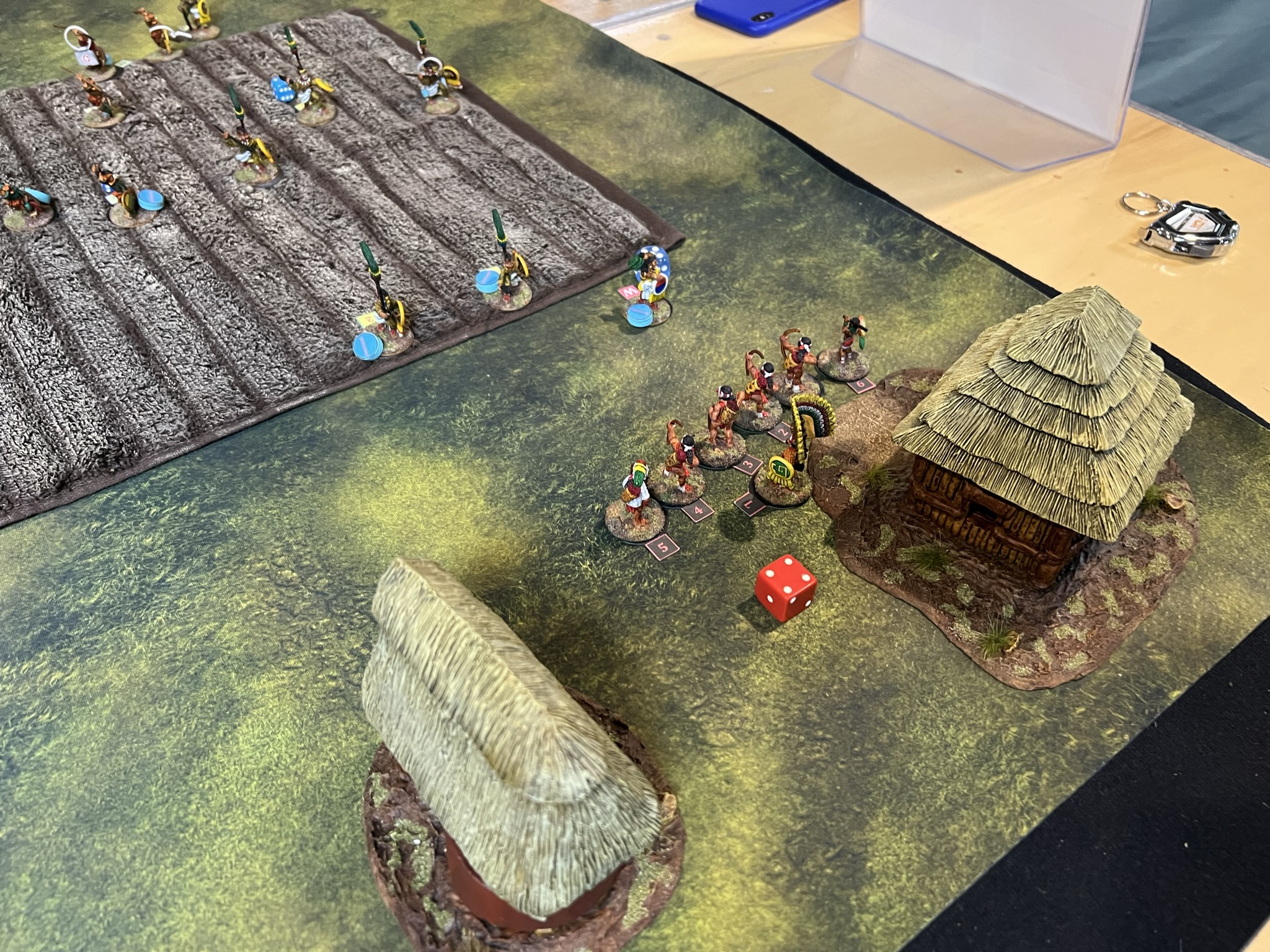 On the final day of the con, I an my 6th (!) Feudal Patrol game in 4 calendar days, “Raid to Satisfy Huitzilopochtli”. This is set pre-Spanish Conquest and simulates a “Flower War” that the Aztecs historically used to seize food, wealth, and people from their unlucky neighbors like the Tlaxcalans. This was the first scenario that I had designed for Civilizations Collide, but I had not run it in a while – so it was nice to see how it played out.