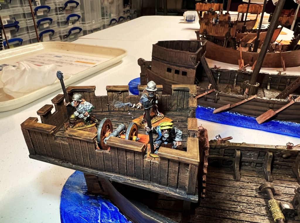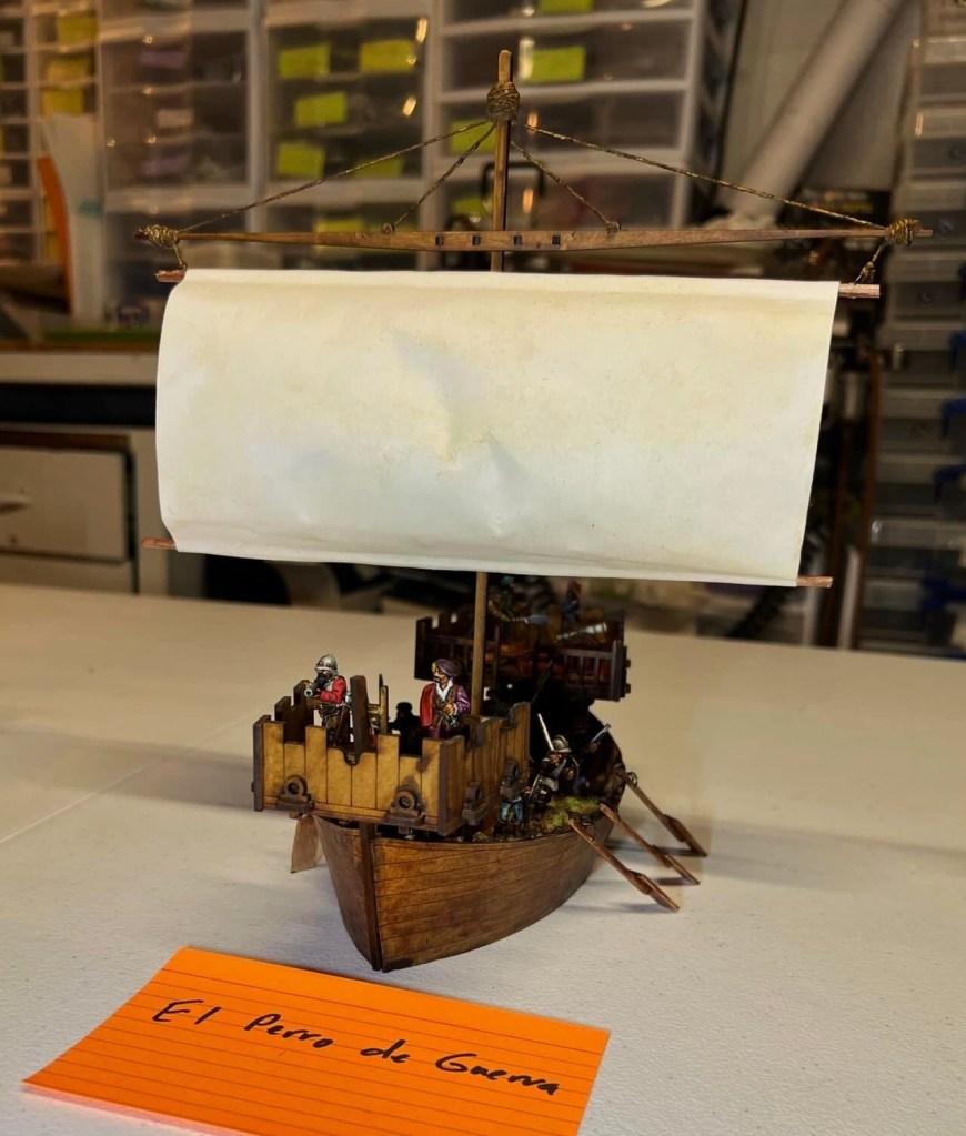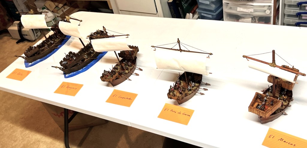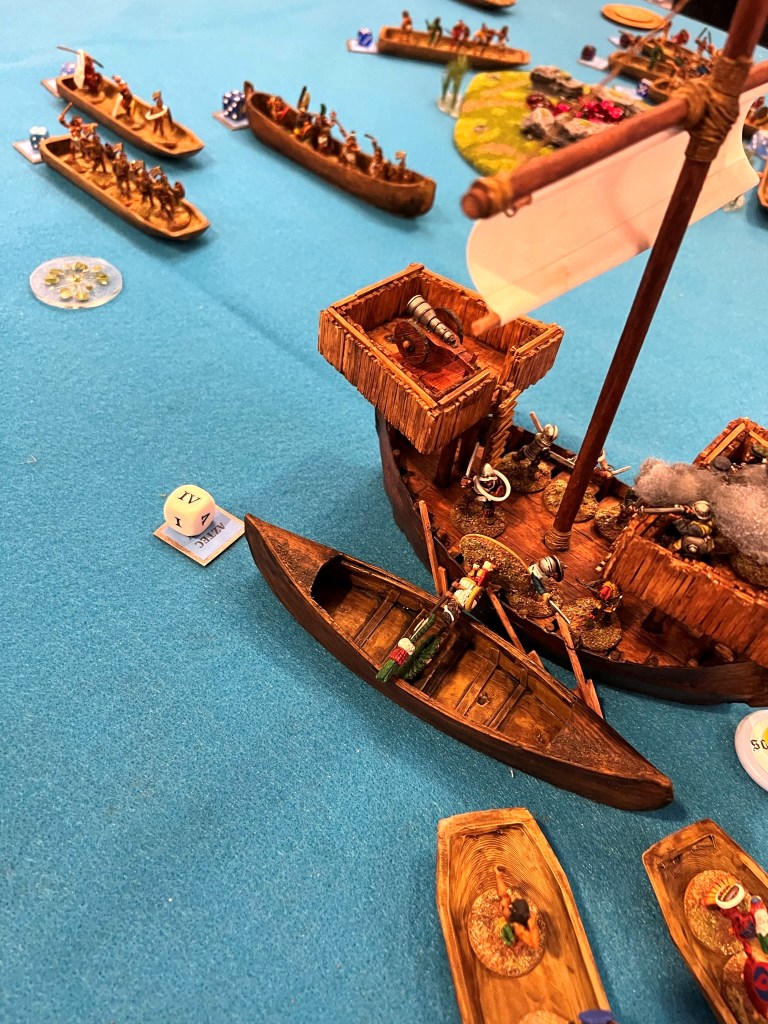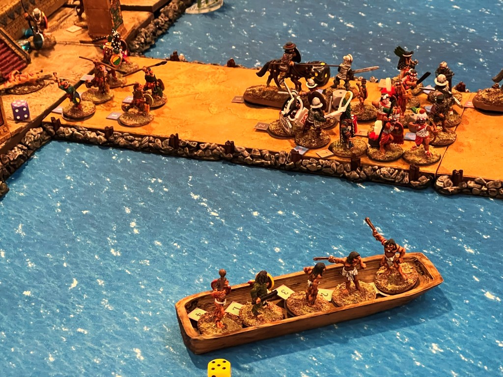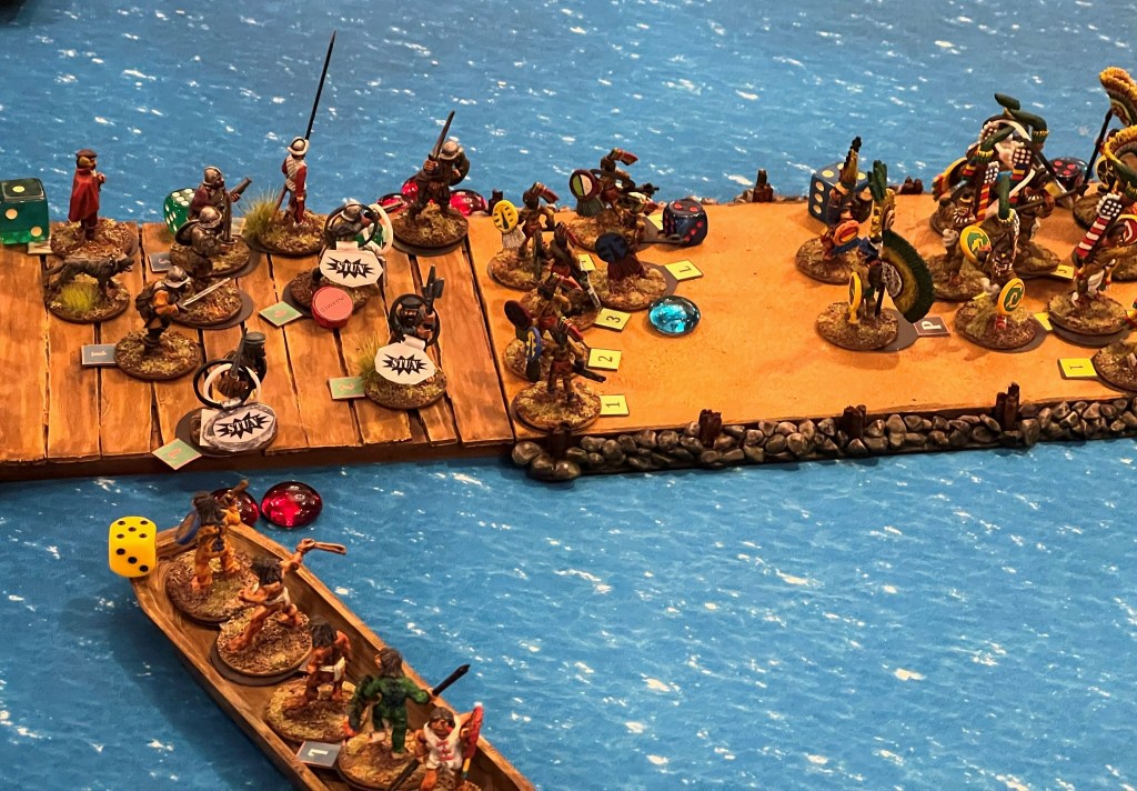 I was really thrilled at the response. What fun it was – an Aztec vs. Conquistadores naval game! It was total mayhem! How? Collisions, ramming of canoes, brigantines getting boarded, canoes getting sunk by arquebuses, ship cannons firing and wiping out whole canoe crews, Aztecs avenging their comrades by wiping out the same cannon crew, and the overall Aztec commander personally boarding a conquistador brigantine to make an assault that cost him his life and the game.