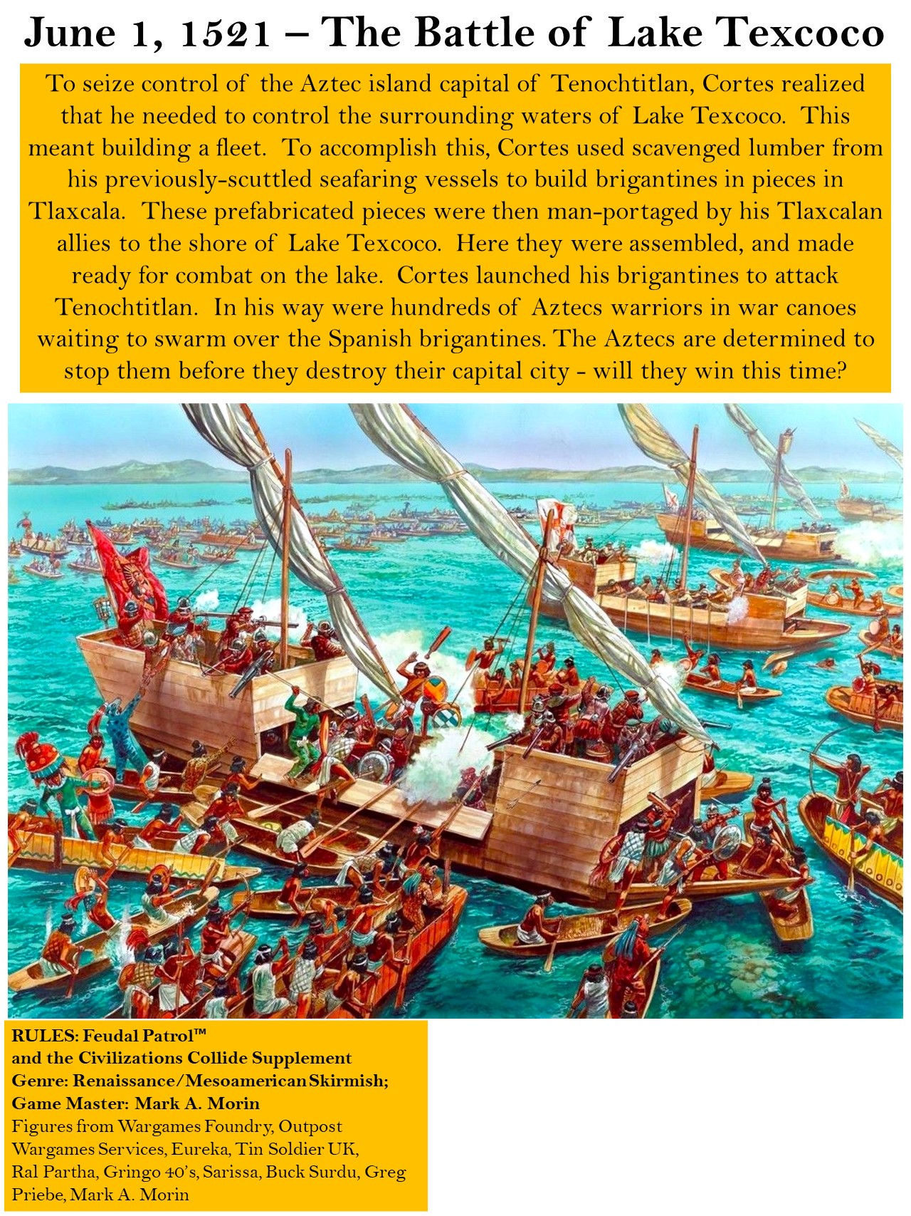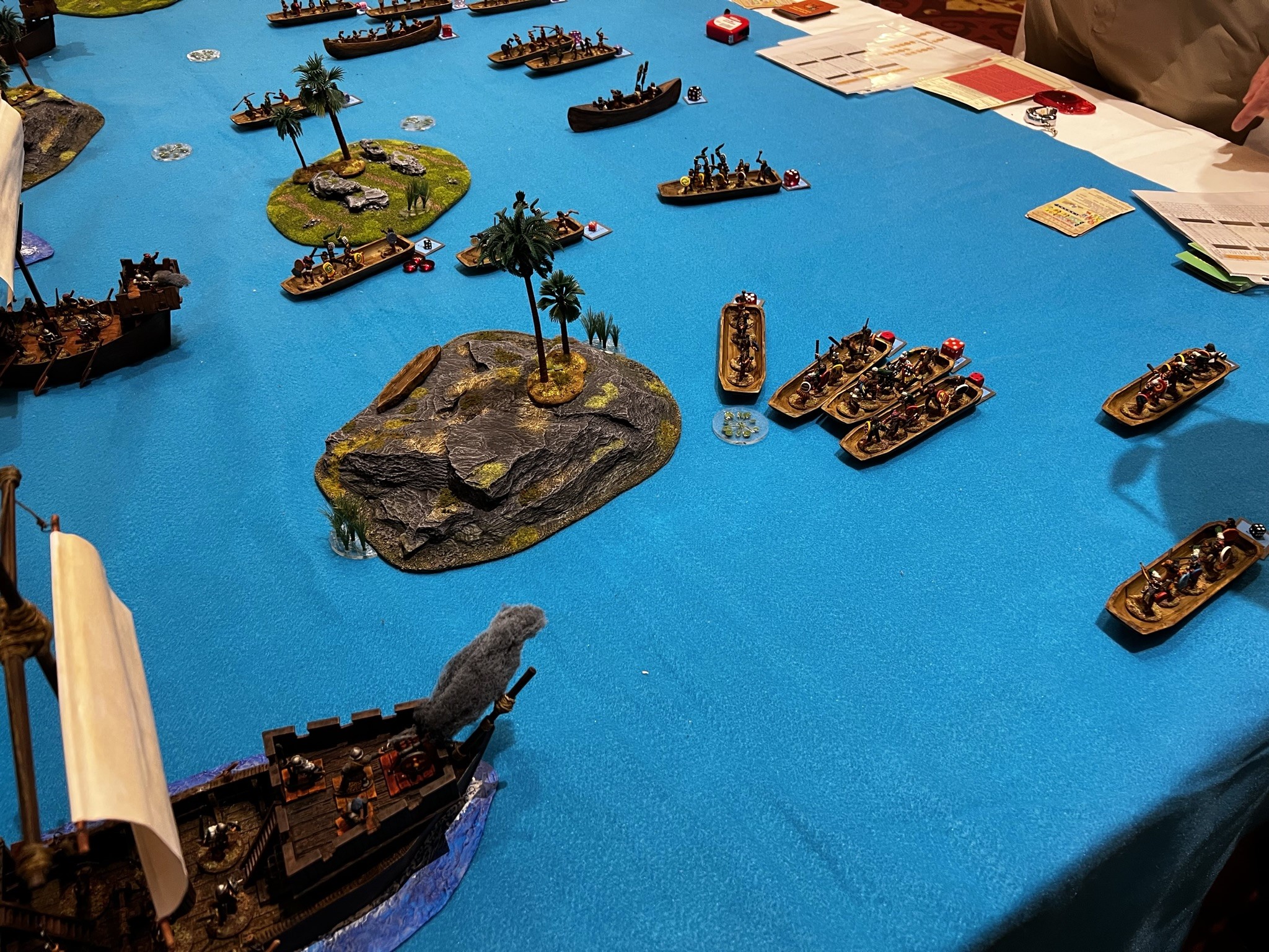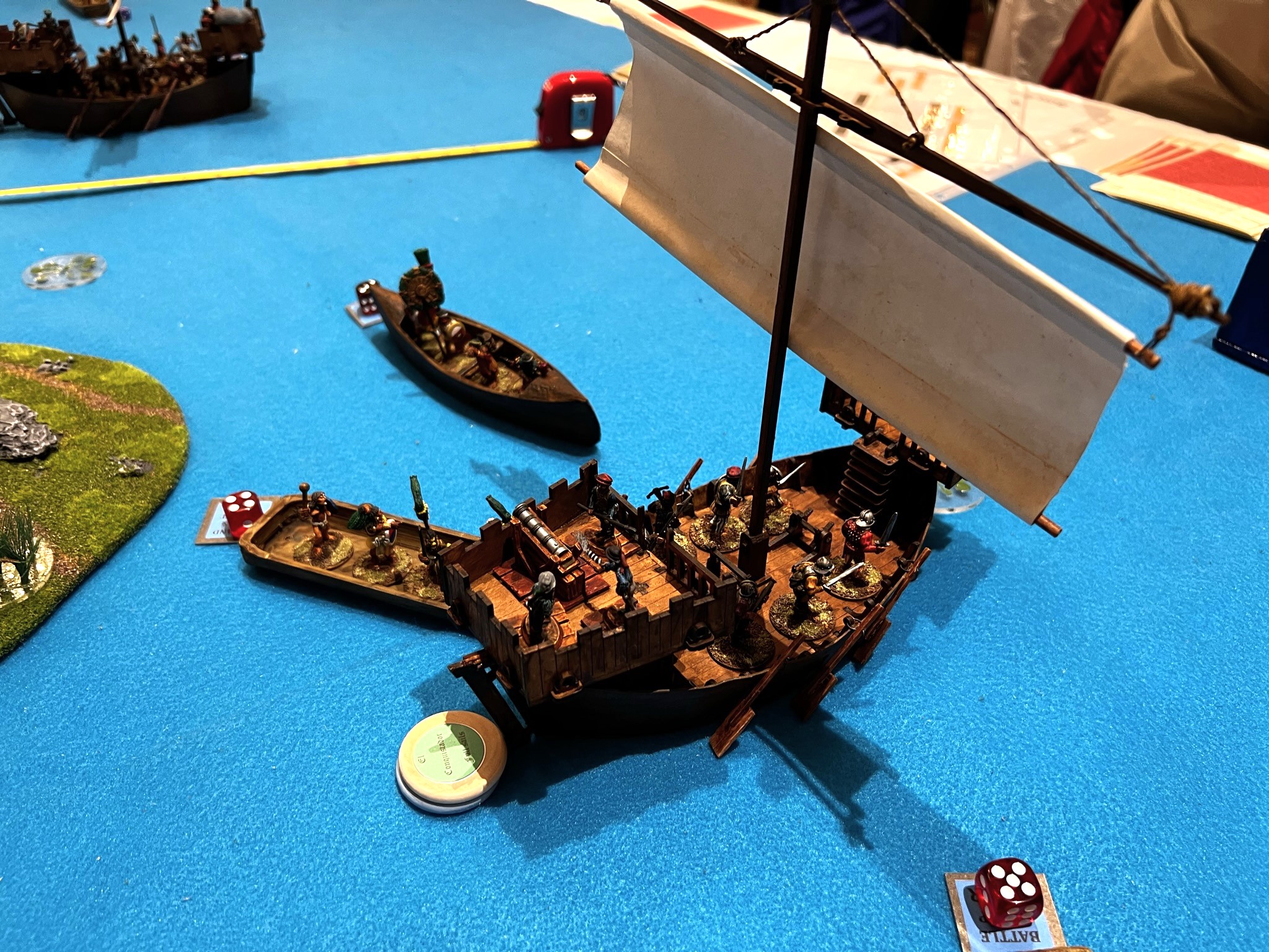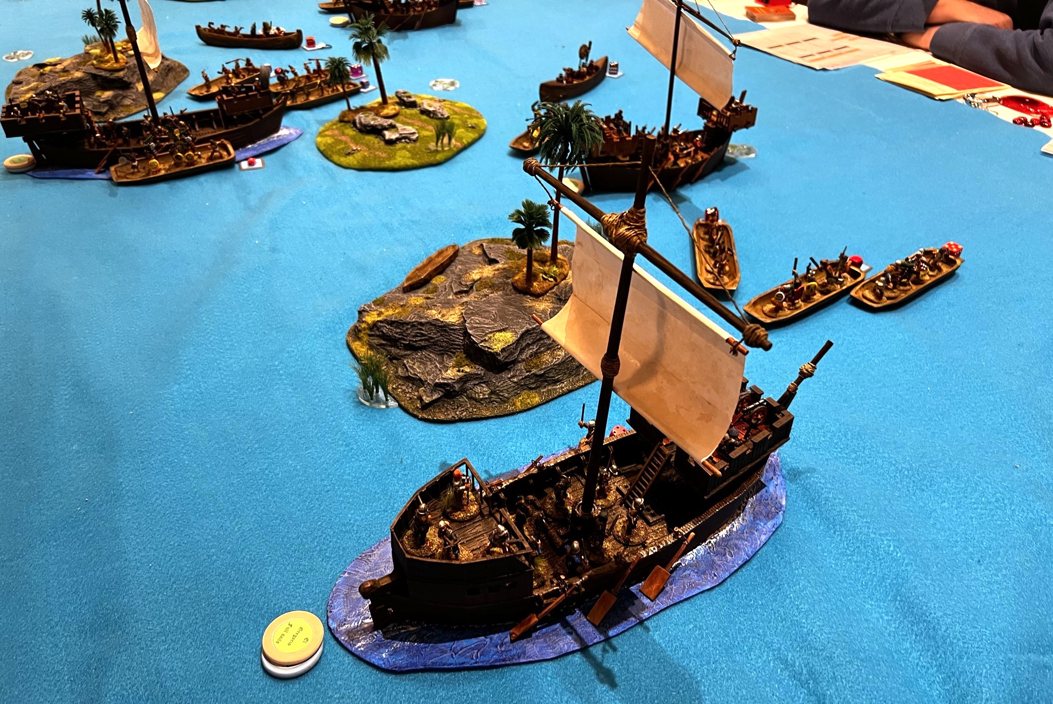 I always look forward to running this game – yes it’s massive but more importantly a lot of fun. Basically there are 5 brigantines loaded with conquistadores and primitive cannon (lombards or falconets) that need to cross the tabletop and shell the other side of the table – where the Aztec capital of Tenochtitlan is located. Opposing them are 21 war canoes filled with Aztecs hell-bent on boarding the invaders’ ships and stopping them. VP are awarded for shelling the city, boarding a brigantine, sinking canoes, and for casualties on both sides. The Spanish have to try to navigate the uncharted waters to do this too.