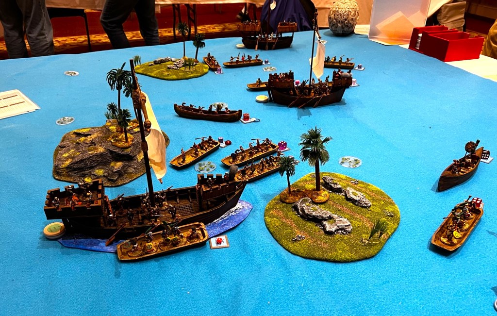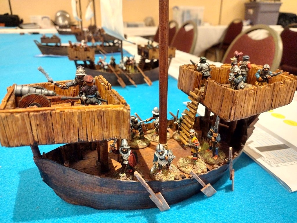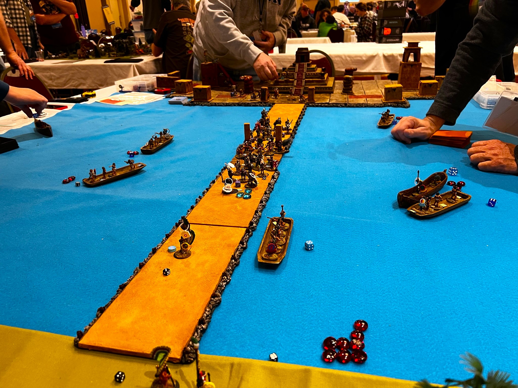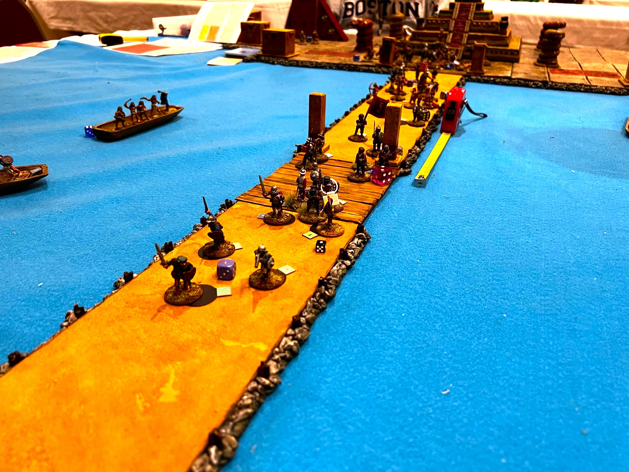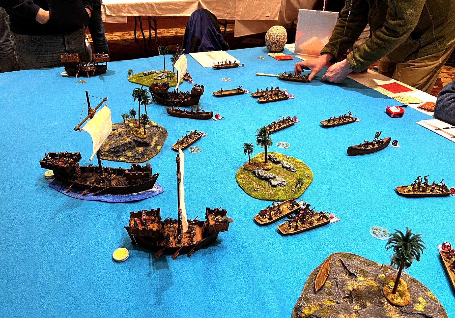 I always look forward to running this game – yes it’s massive but more importantly a lot of fun. Basically there are 5 brigantines loaded with conquistadores and primitive cannon (lombards or falconets) that need to cross the tabletop and shell the other side of the table – where the Aztec capital of Tenochtitlan is located. Opposing them are 21 war canoes filled with Aztecs hell-bent on boarding the invaders’ ships and stopping them. VP are awarded for shelling the city, boarding a brigantine, sinking canoes, and for casualties on both sides. The Spanish have to try to navigate the uncharted waters to do this too.