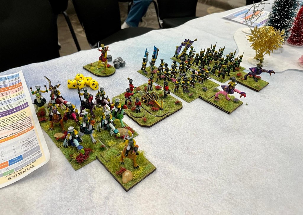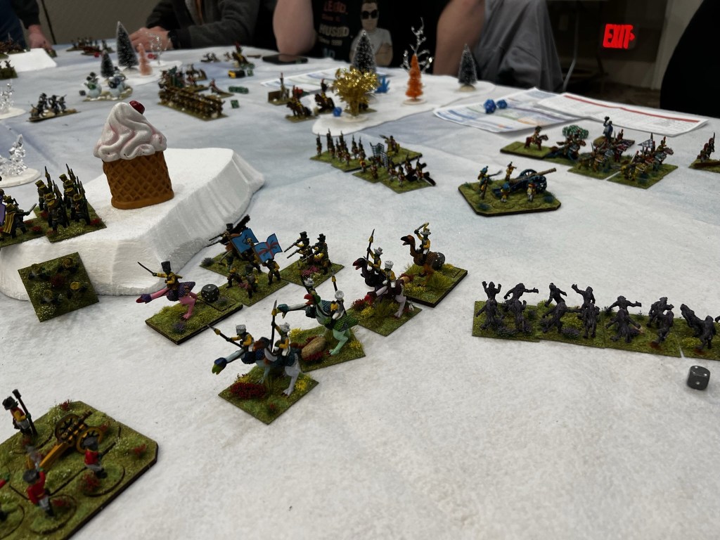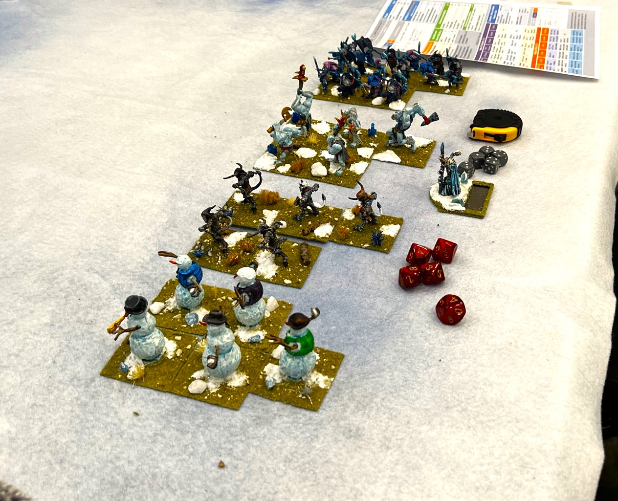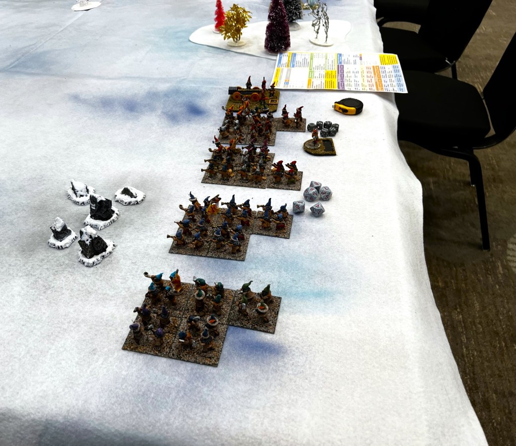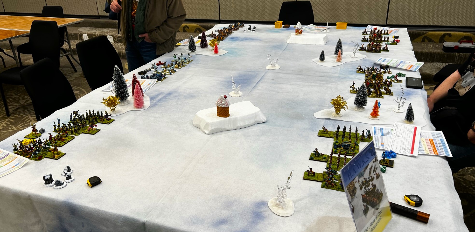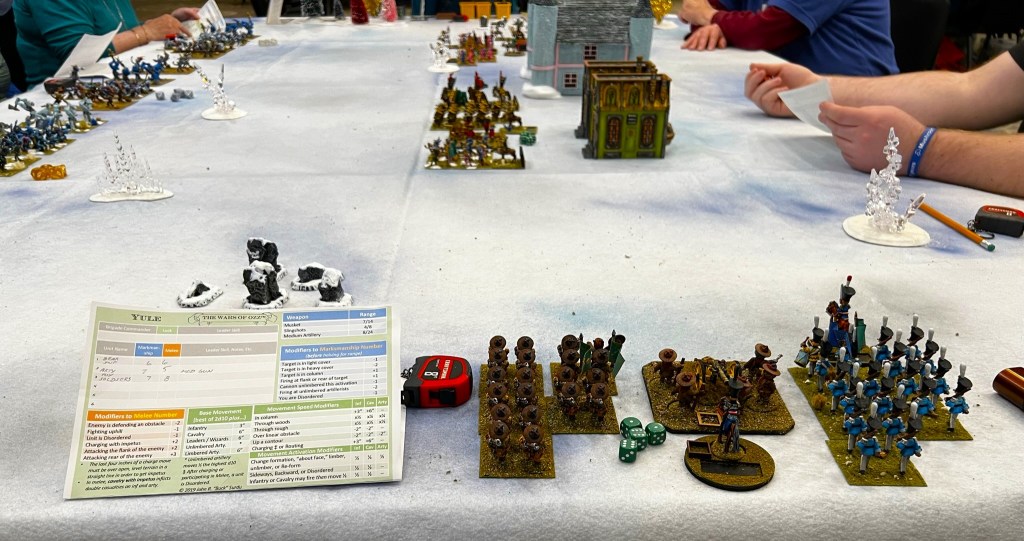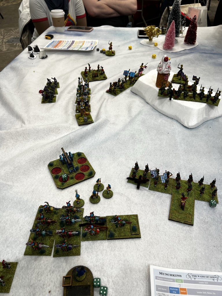 This was the third Ozz linked game run by Buck Surdu. In the second game, the forces of Yule held on to the Bauble of Time. Here, the Ice Queen’s forces are ambushing a convoy of Babbo Natale who is trying to get the Bauble to a safe place. I did not get as many pictures of this game – but I played on the side of the Ice Queen this time. We ended up taking the Bauble (Giant Evil Snowmen charged the convoy and stole it). It was a lot of fun.