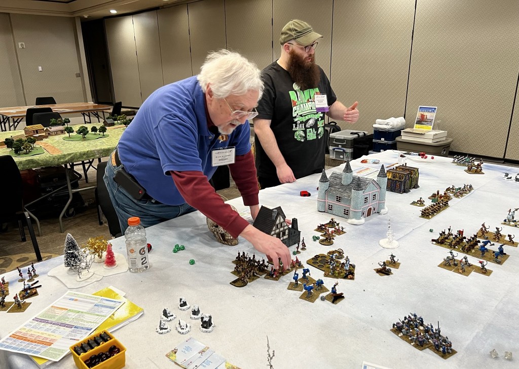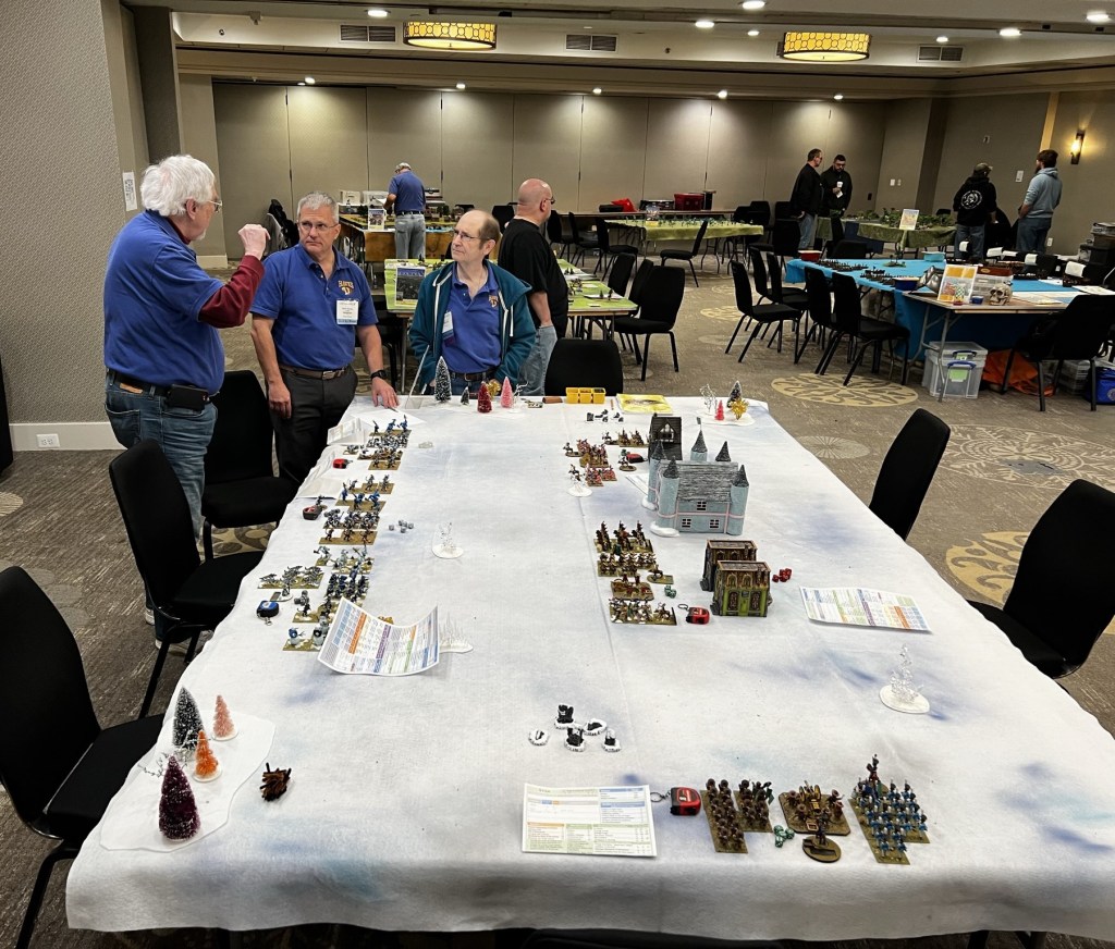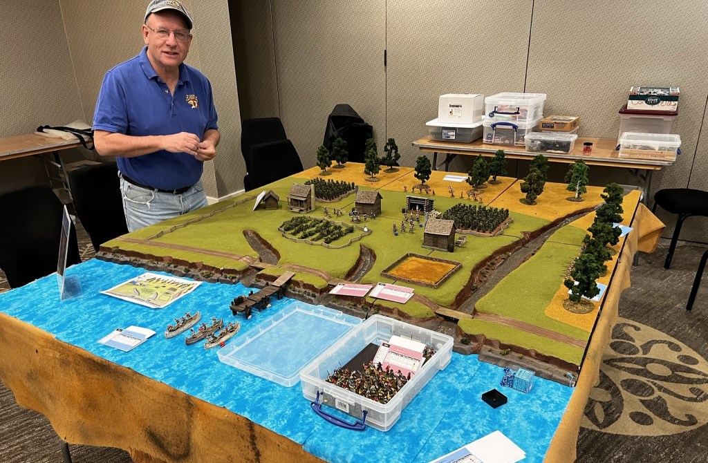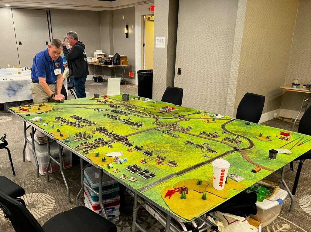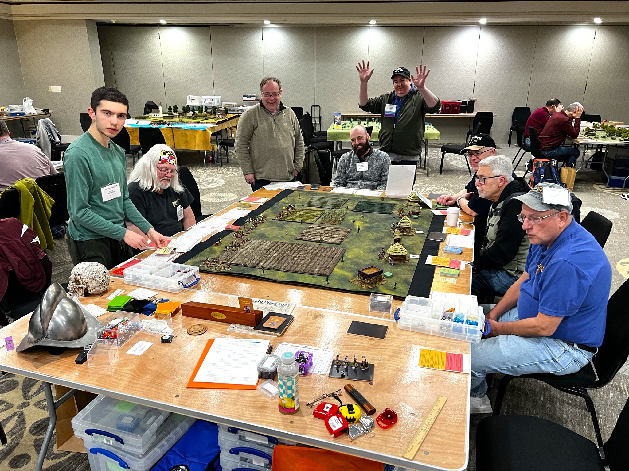 Last weekend the Cold Wars 2023 gaming convention was held in Valley Forge, PA at the Valley Forge Casino Resort. I participated as a game master and as a player. I ran three games of Feudal Patrol, played in two games of Wars of Ozz, and participated as a player in an American War of Independence (AWI) game. I really enjoyed the convention – and personally had some special moments as you will soon see in this post. I, a Massachusetts “carpetbagger”, am grateful once again for the welcome, hospitality, and friendship of the HAWKS club, especially Buck Surdu, Greg Priebe, Chris Palmer, Dave Wood, and Eric Schlegel – who all contributed to making my experience a memorable one. I also want to thank the players who chose to play in my games. I also must thank the HMGS staff and volunteers for making the convention work so well.
