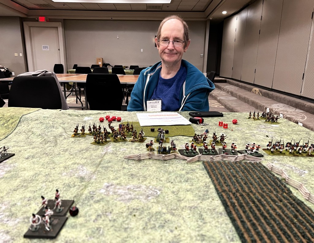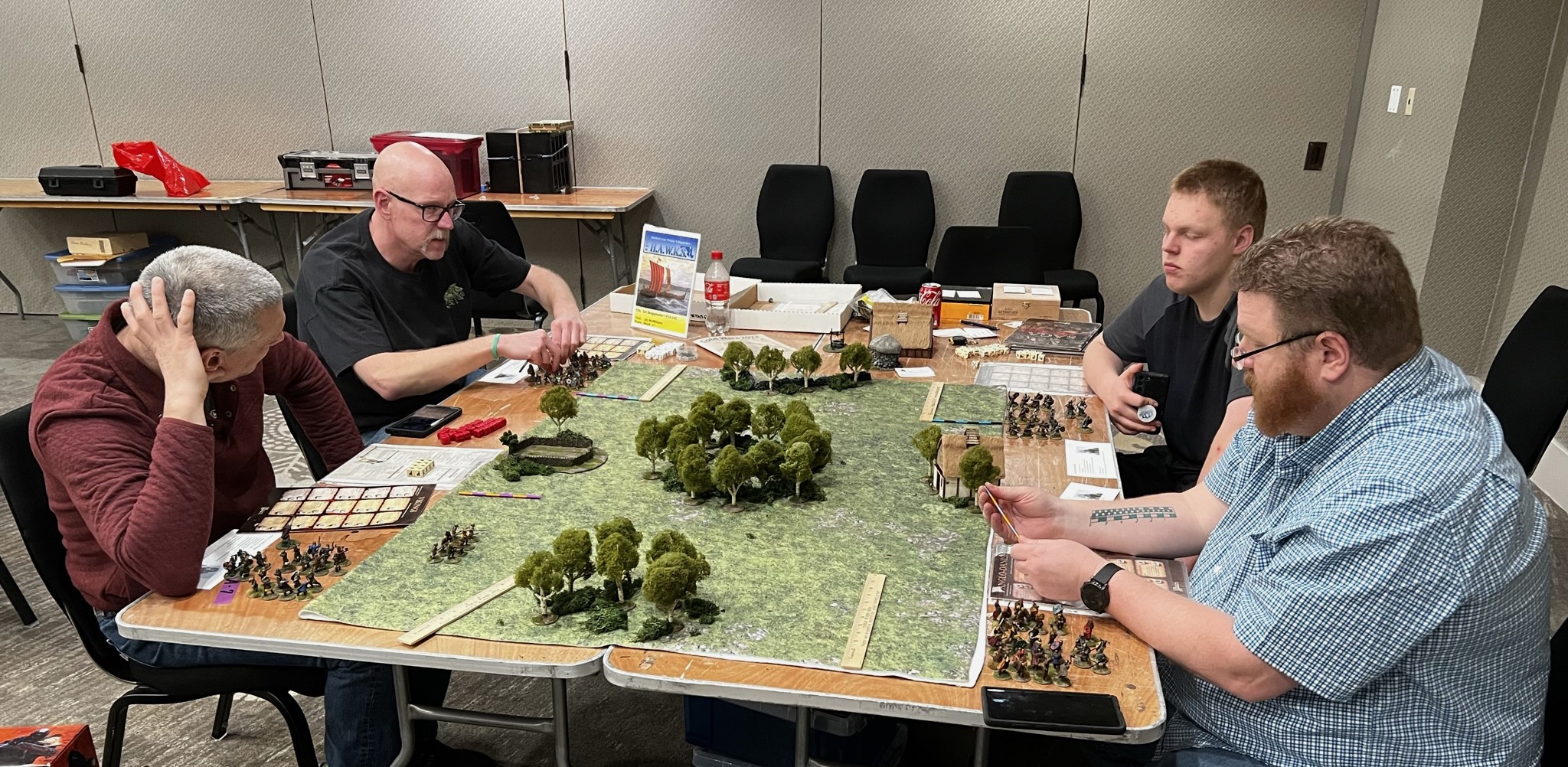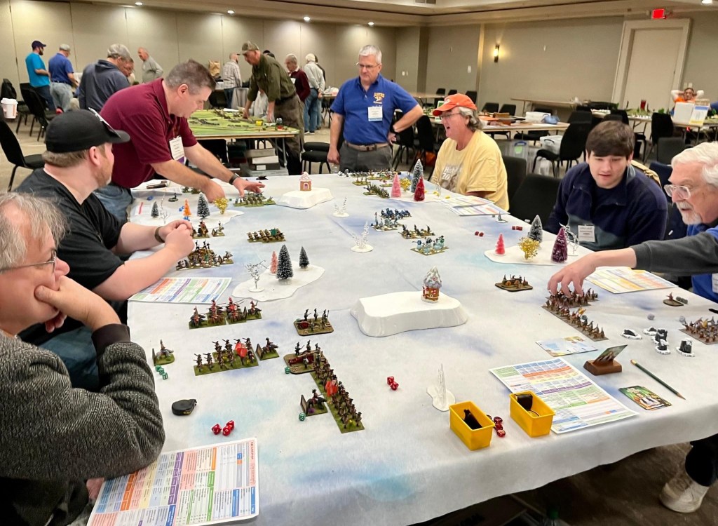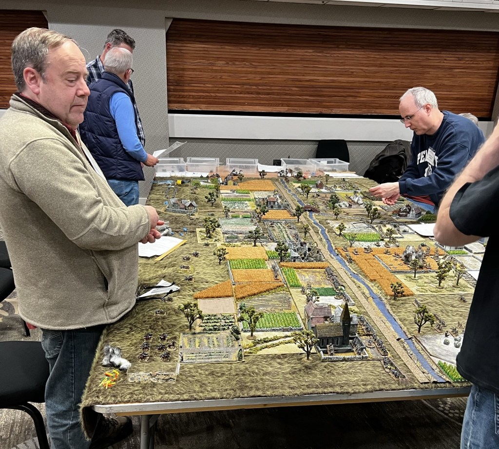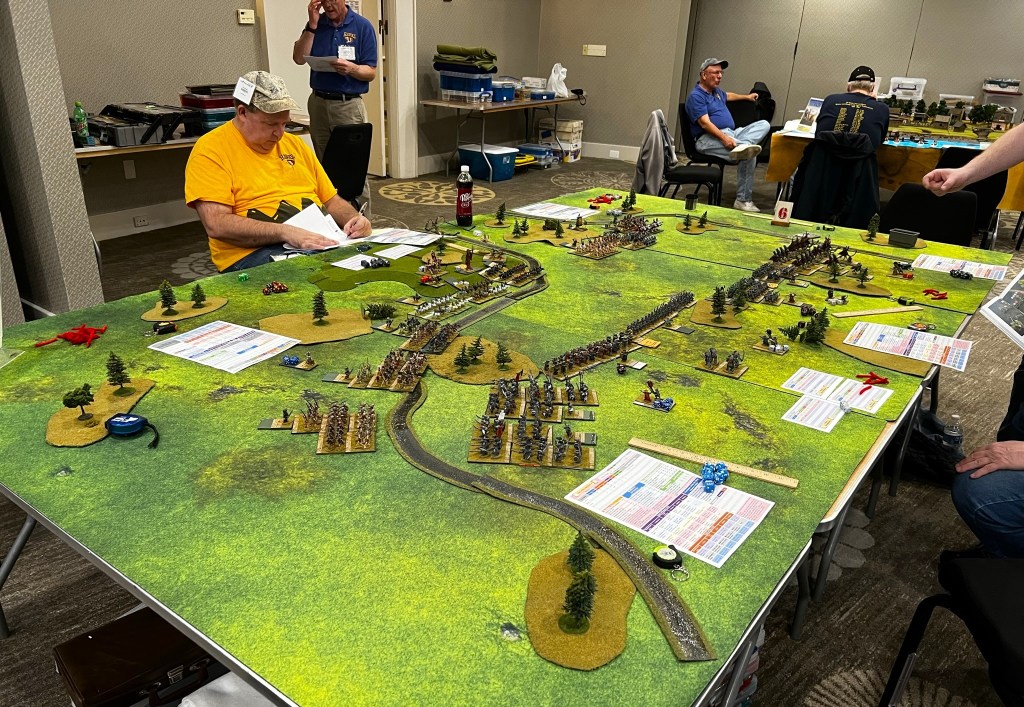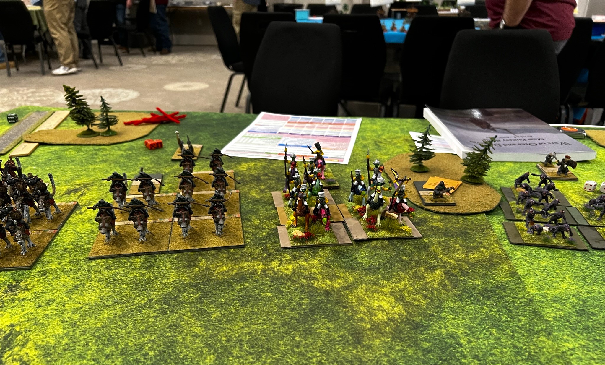 Last weekend the Cold Wars 2023 gaming convention was held in Valley Forge, PA at the Valley Forge Casino Resort. I participated as a game master and as a player. I ran three games of Feudal Patrol, played in two games of Wars of Ozz, and participated as a player in an American War of Independence (AWI) game. I really enjoyed the convention – and personally had some special moments as you will soon see in this post. I, a Massachusetts “carpetbagger”, am grateful once again for the welcome, hospitality, and friendship of the HAWKS club, especially Buck Surdu, Greg Priebe, Chris Palmer, Dave Wood, and Eric Schlegel – who all contributed to making my experience a memorable one. I also want to thank the players who chose to play in my games. I also must thank the HMGS staff and volunteers for making the convention work so well.