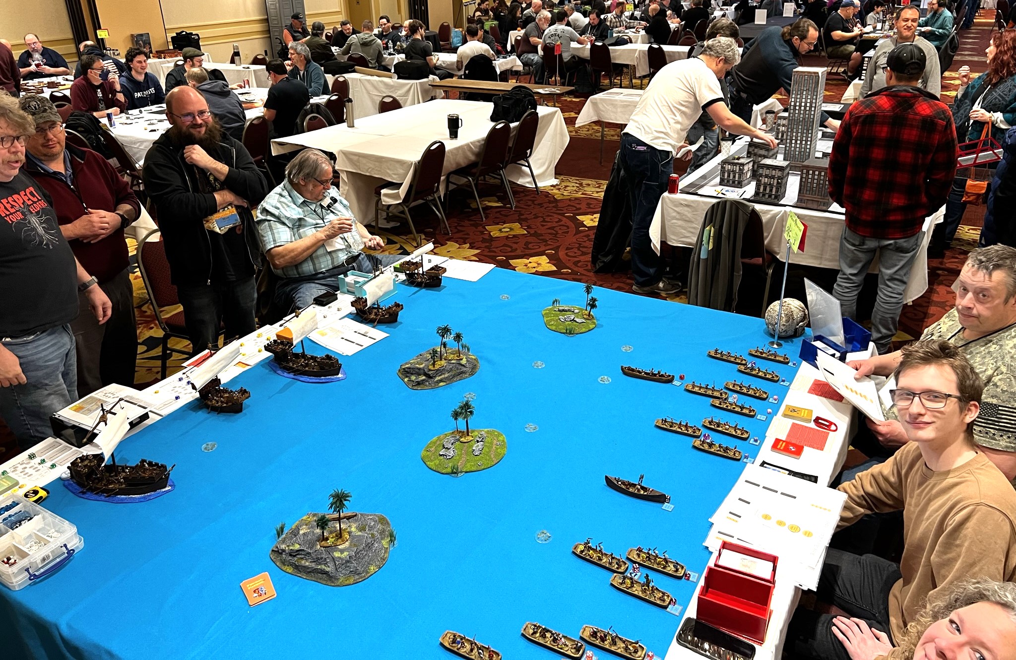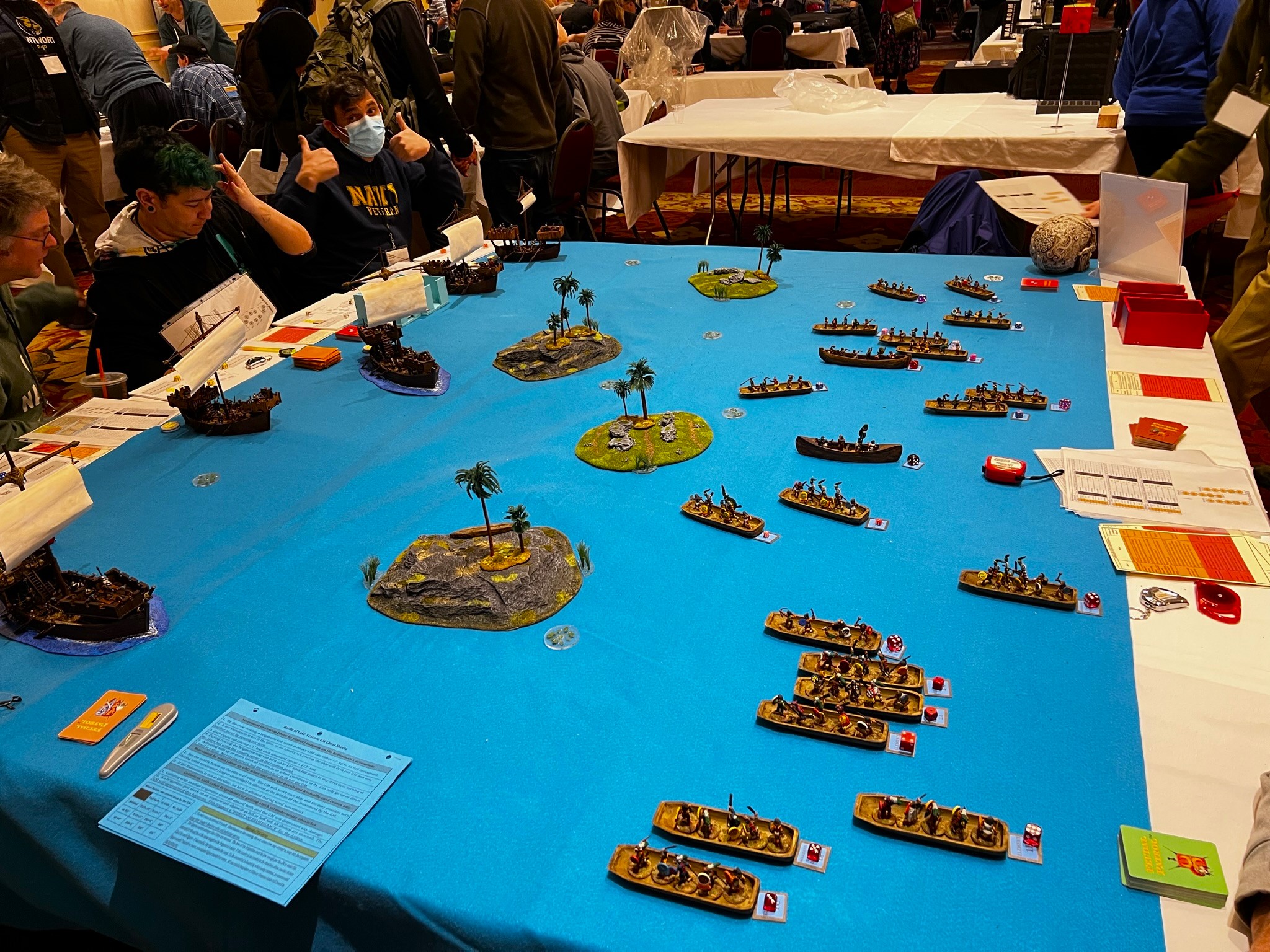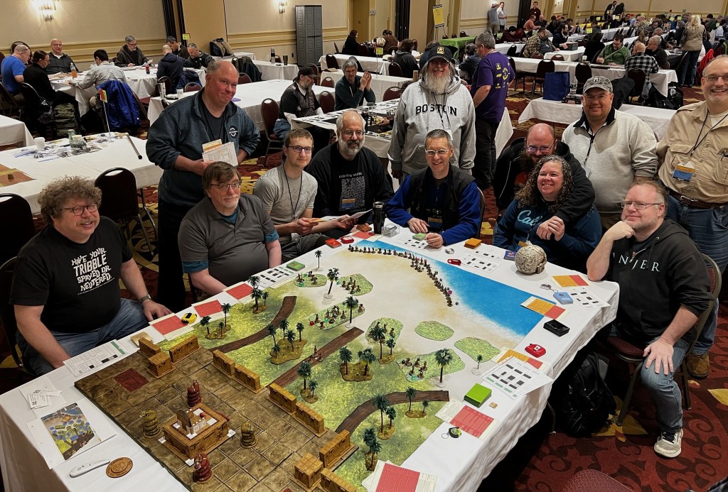 The game was pleasantly and briefly interrupted at this point by the HMGS staff. As it turned out, my game was selected to be honored with a “PELA” award for the time slot. PELA stands for “Pour Encourager Les Autres” which in English translates to “For Encouraging the Others”. These awards are defined by HMGS as going: