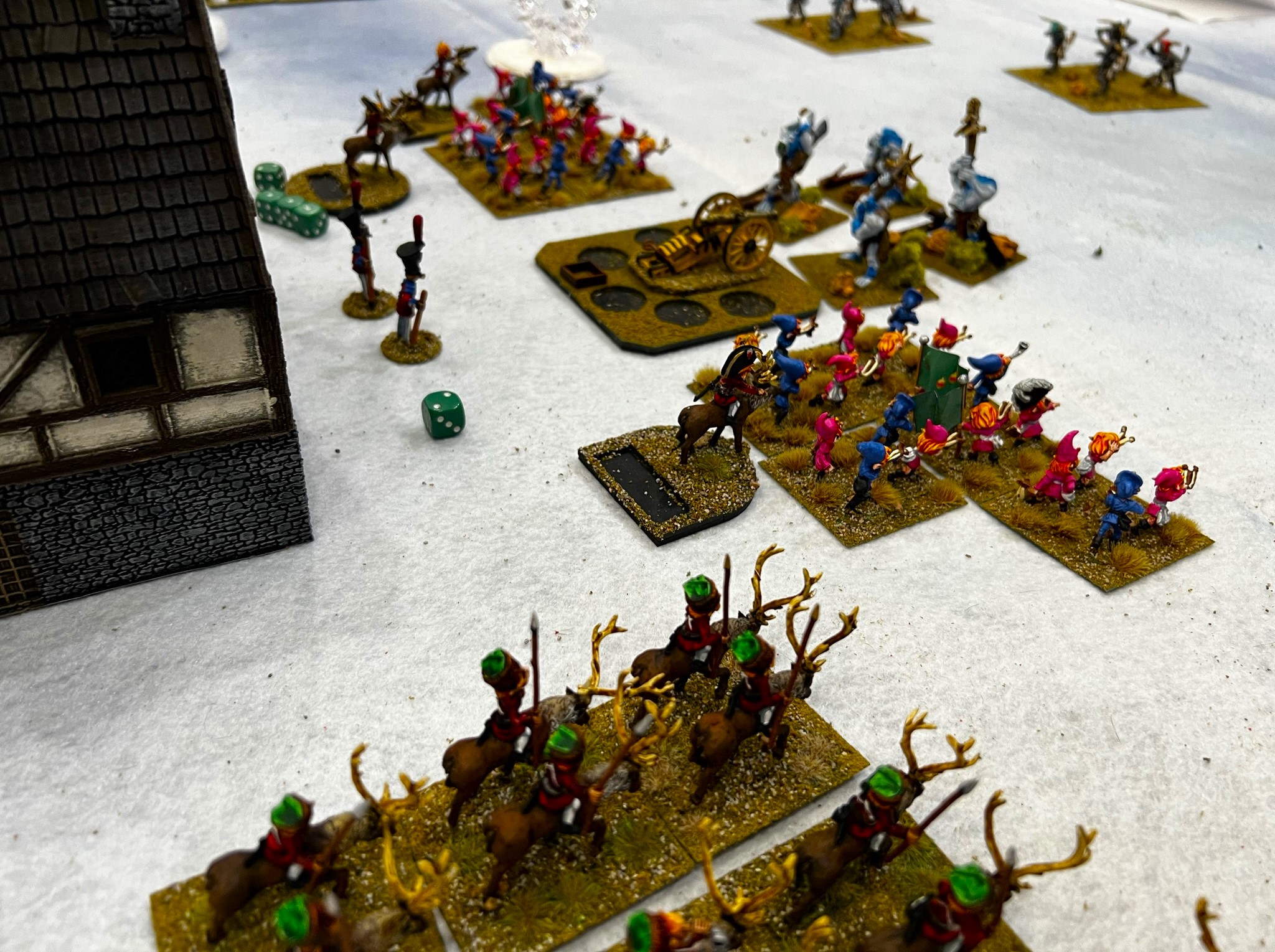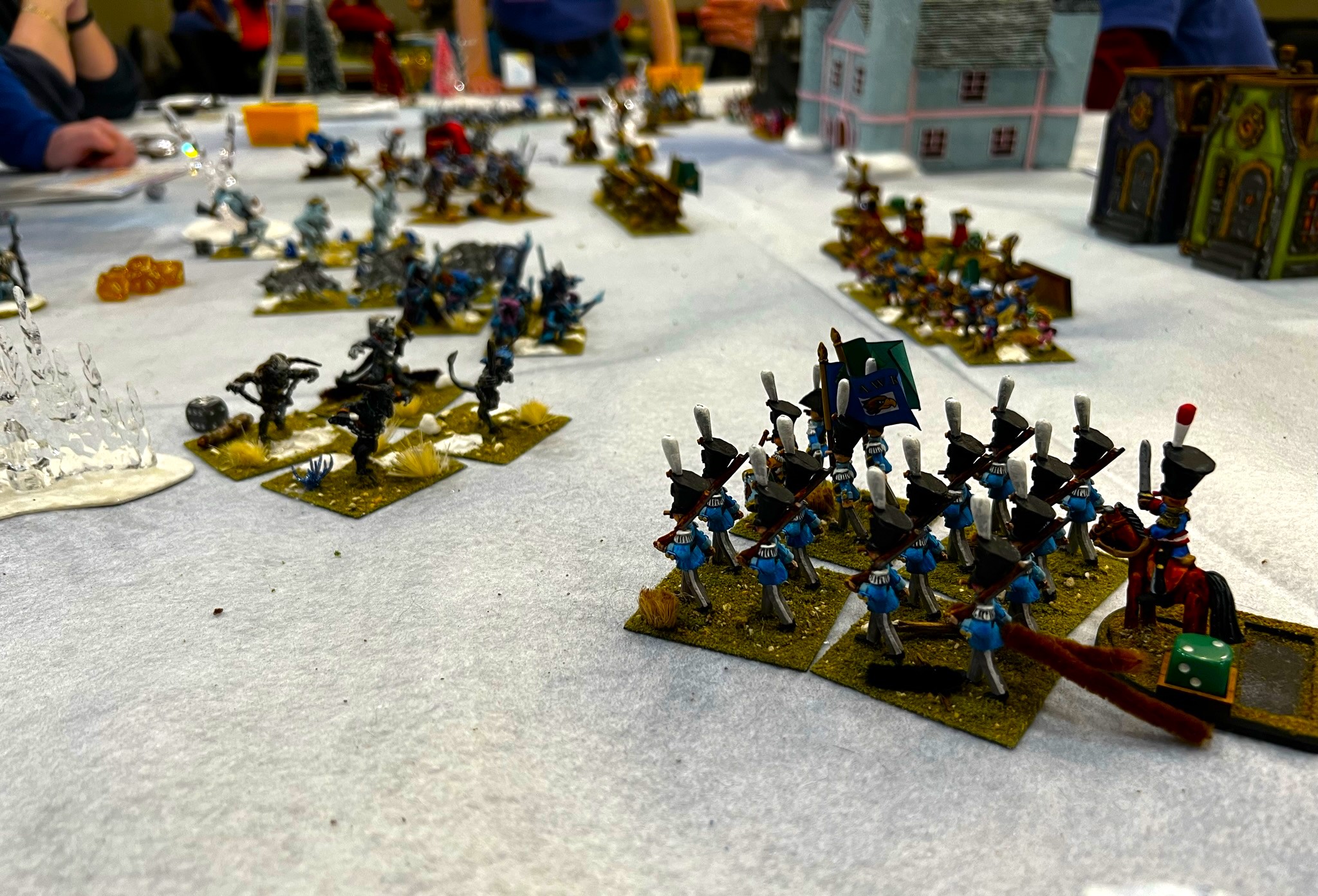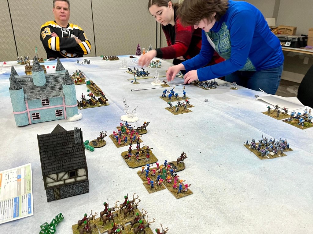 In the middle of the game was a big scrum between the brigade of Ice Trolls, Elves, Dark Elves, and that of the Teddy Bear Infantry, Teddy Bear Artillery, and the Toy Soldier Cavalry.