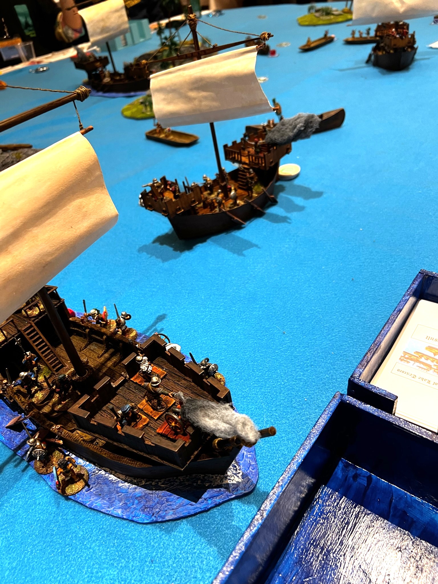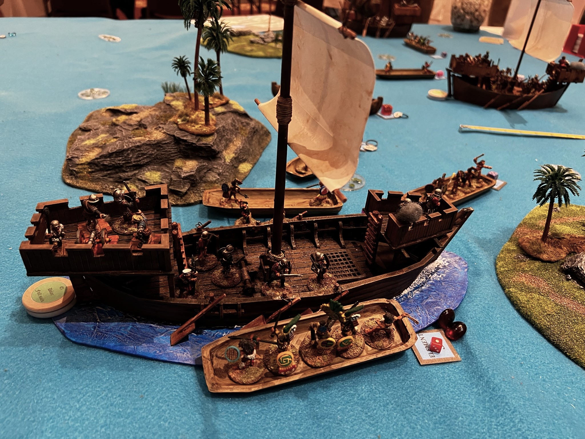 The Spanish moved out and avoided collisions with each other or the islands. Only one got stuck on an underwater obstacle (El Gregorio) – resulting in the Aztecs getting a “Burst of Exuberance” which allowed it to be boarded first. Eventually, all of the brigantines would be boarded to greater or lesser extent.