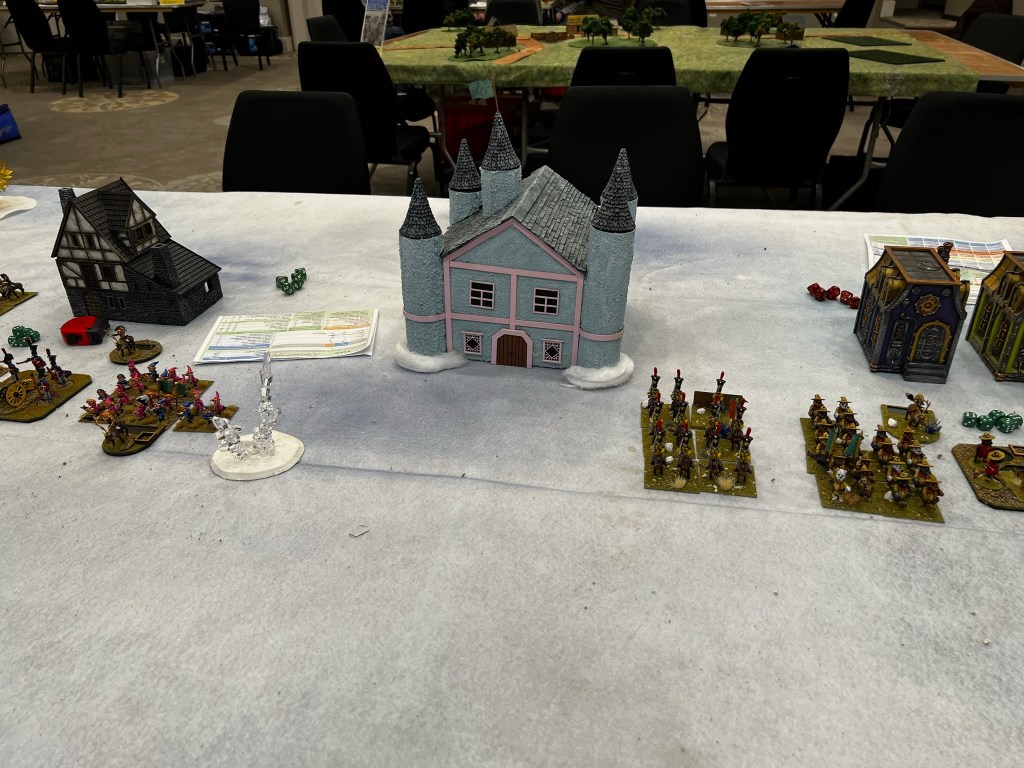 After a short sleep, I played in another Ozz game on Saturday morning. This one was the second of three linked Wars of Ozz scenarios that Chris Palmer and Buck Surdu ran pitting the forces of the Ice Queen, Aurora, versus those of Babbo Natale (really Santa). Aurora wants to seize the Bauble of Time – a magic item that can bend time and lets Babbo deliver all his toys in one night. Of course, Aurora wants it for her own evil purposes. The Bauble was hidden in one of three buildings – and the neither the forces of Yule or Aurora knew which one. The goal of the attacking Ice Queen was to search each of the three areas – which meant that her forces needed to clear defenders from them first. I played on the Yule side in this game, on the Yule’s far left flank.