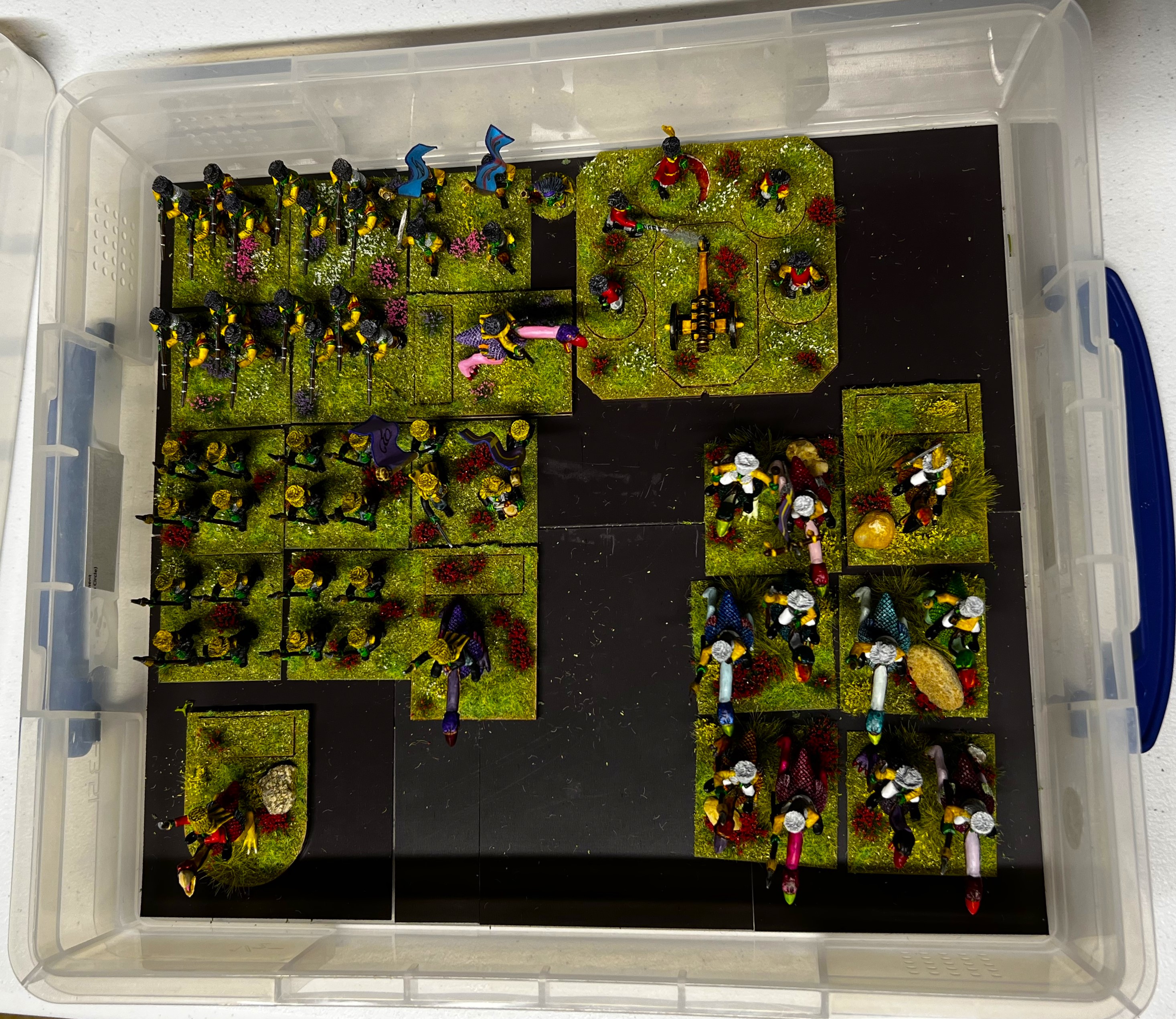 I was on the far left flank of the Ice Queen’s forces – and I after the Toy soldier cavalry and the Teddy Bear artillery beat up my Ice Trolls and Krampus, I was able to flank the Teddy Bear battery with Dark Elves. This attack sent them fleeing and the rear middle of the battlefield became congested with forces. Meanwhile, Chris Palmer valiantly pursued the Snowmen with the Toy Soldier cavalry. Luckily for our side, the Snowmen escaped into woods where the cavalry would not move as quickly – with the Bauble. Victory!