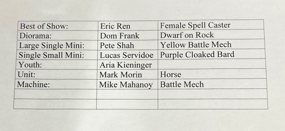 This was something as a GM that you can really appreciate! I was really honored – and it was nice to get applause from the room and my table too. I think that there were about 30+ games in my time slot – so this was tough to get. The award was a lovely knight figure on a plinth and a voucher for the vendor hall. Thanks HMGS, it has a place of honor at home! Thanks players!