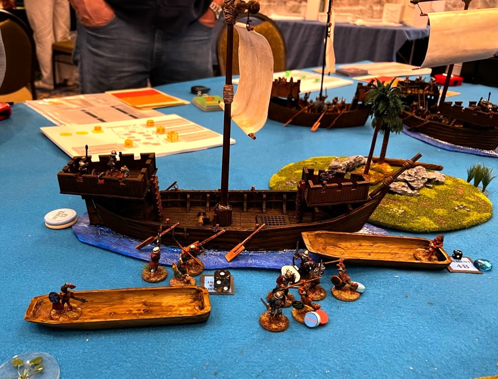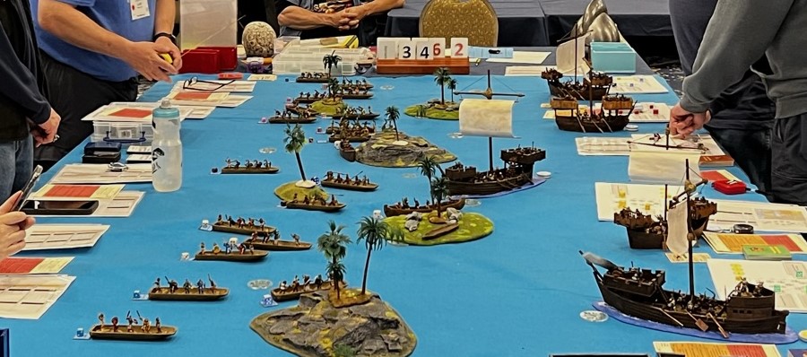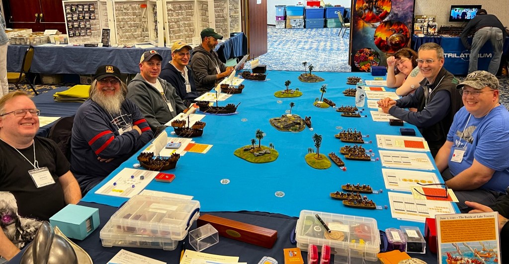 Thankfully, I was able to get this game dismantled (with a lot of help especially from Leif and Brad) and put away and moved to my final table of the weekend. Fortunately, this was going to be a BIG table – five 6′ x 3′ tables of watery battlefield – Lake Texcoco – where the Aztec capital used to be.