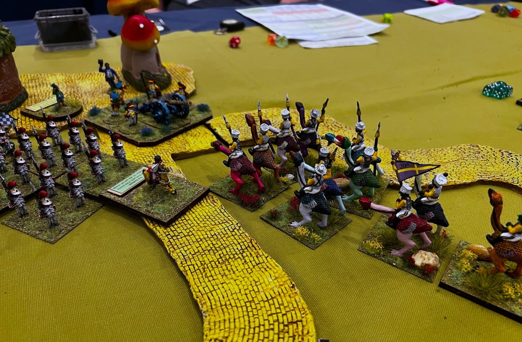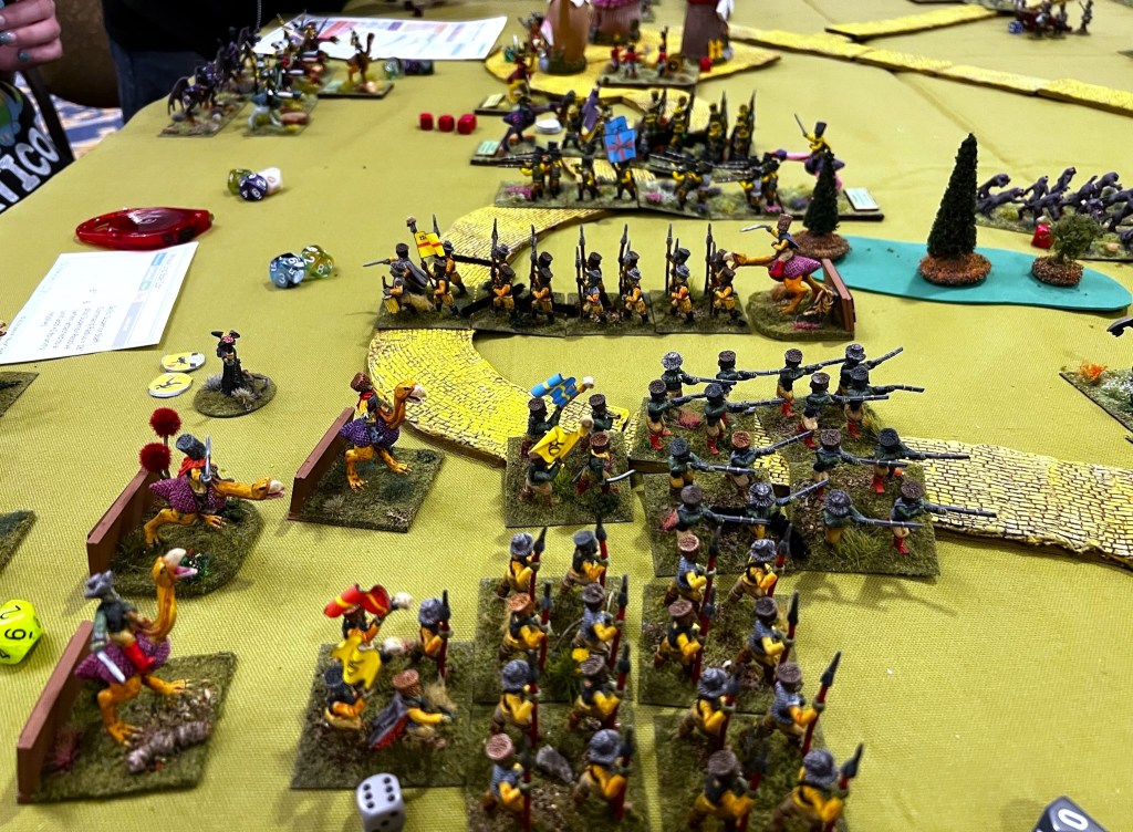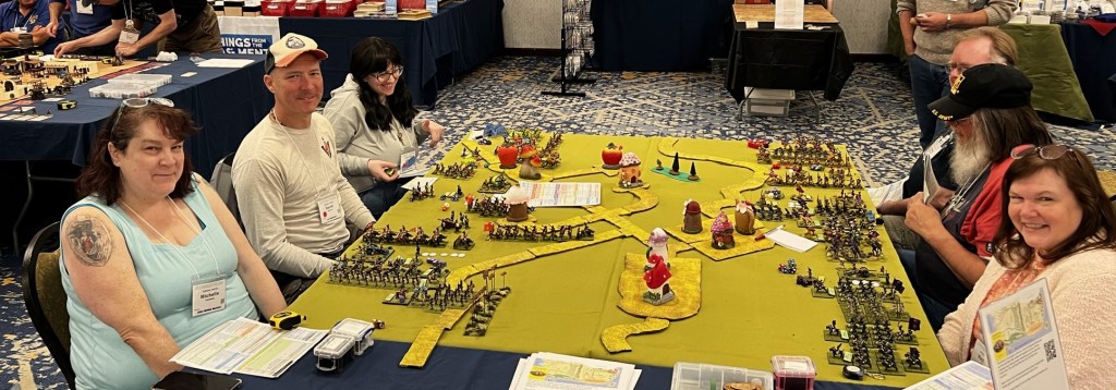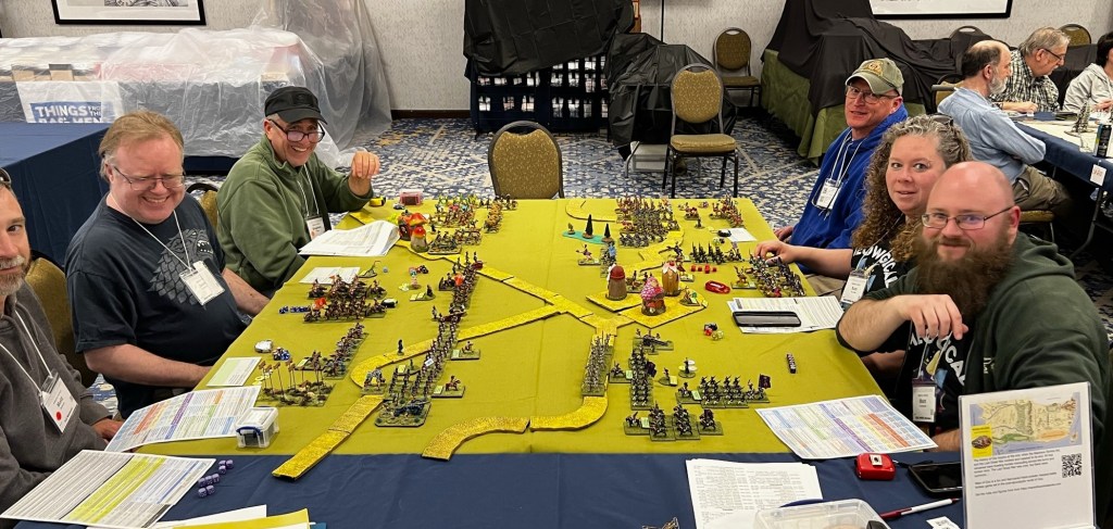 As I wind down from Memorial Day weekend activities, I wanted to share some of my photos from the Huzzah! 2023 gaming convention. I ran 5 games there – two Wars of Ozz games on Friday, two Feudal Patrol games based on the Spanish Conquest in Mesoamerica games on Saturday, and a final Wars of Ozz game on Sunday. Each game slot was 4 hours long.