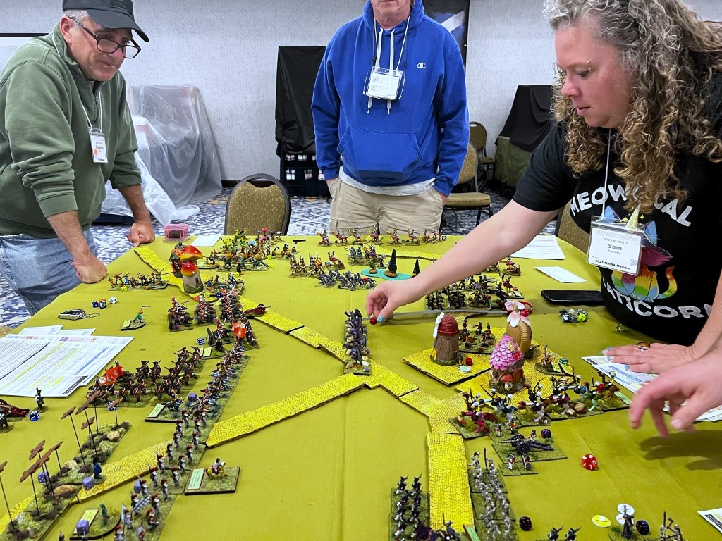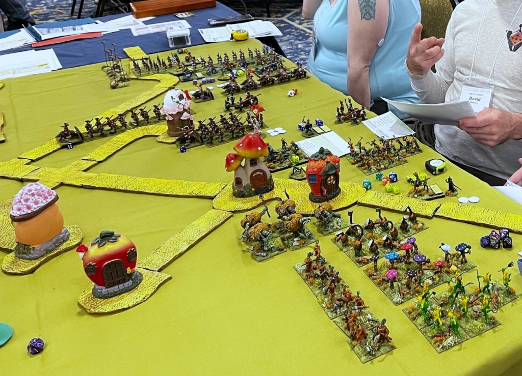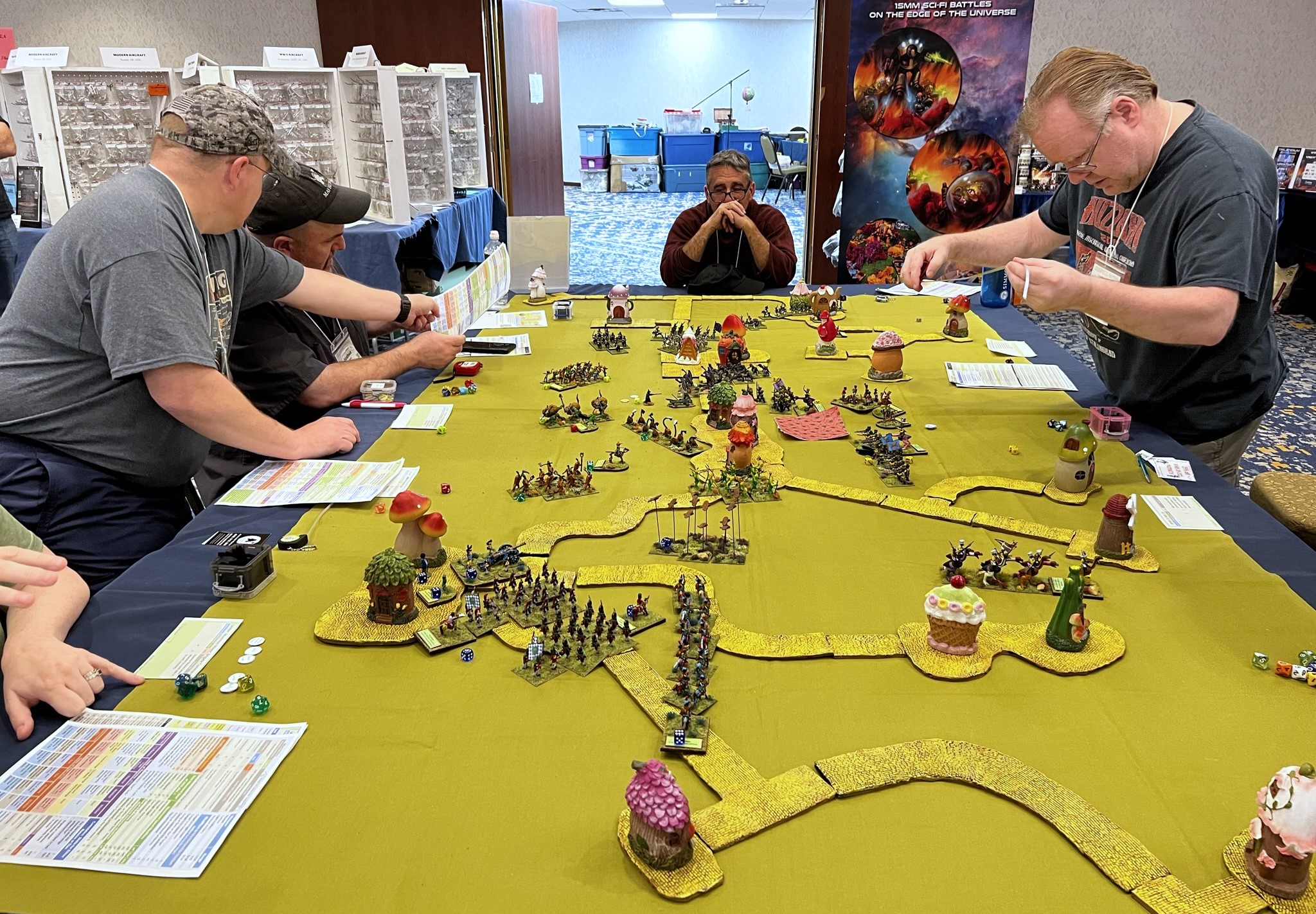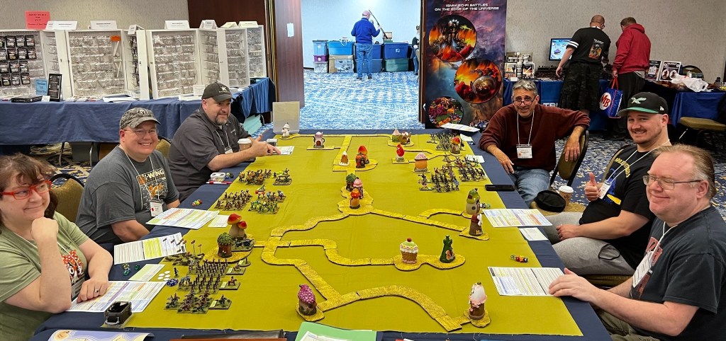 I arrived early Friday the 19th – around 11 AM – so that I could check into my hotel and move all my stuff from my very full car into my room and get my first game set up for 2 PM. Unfortunately, the hotel would not let ANYONE check in before 3 PM – and yes, that was during my game slot. The staff of the hotel claimed that they needed to keep rooms free for flight crews (not the fault of MWHA btw). In any case, my car was not packed such that I could just grab stuff and go – and after a bit of transloading in the parking lot I got my stuff into the convention space and set up my first 6-player Wars of Ozz game. The table was smaller than I had planned – and had a lot of figures on it, but with all of the scrambling, I made it work.