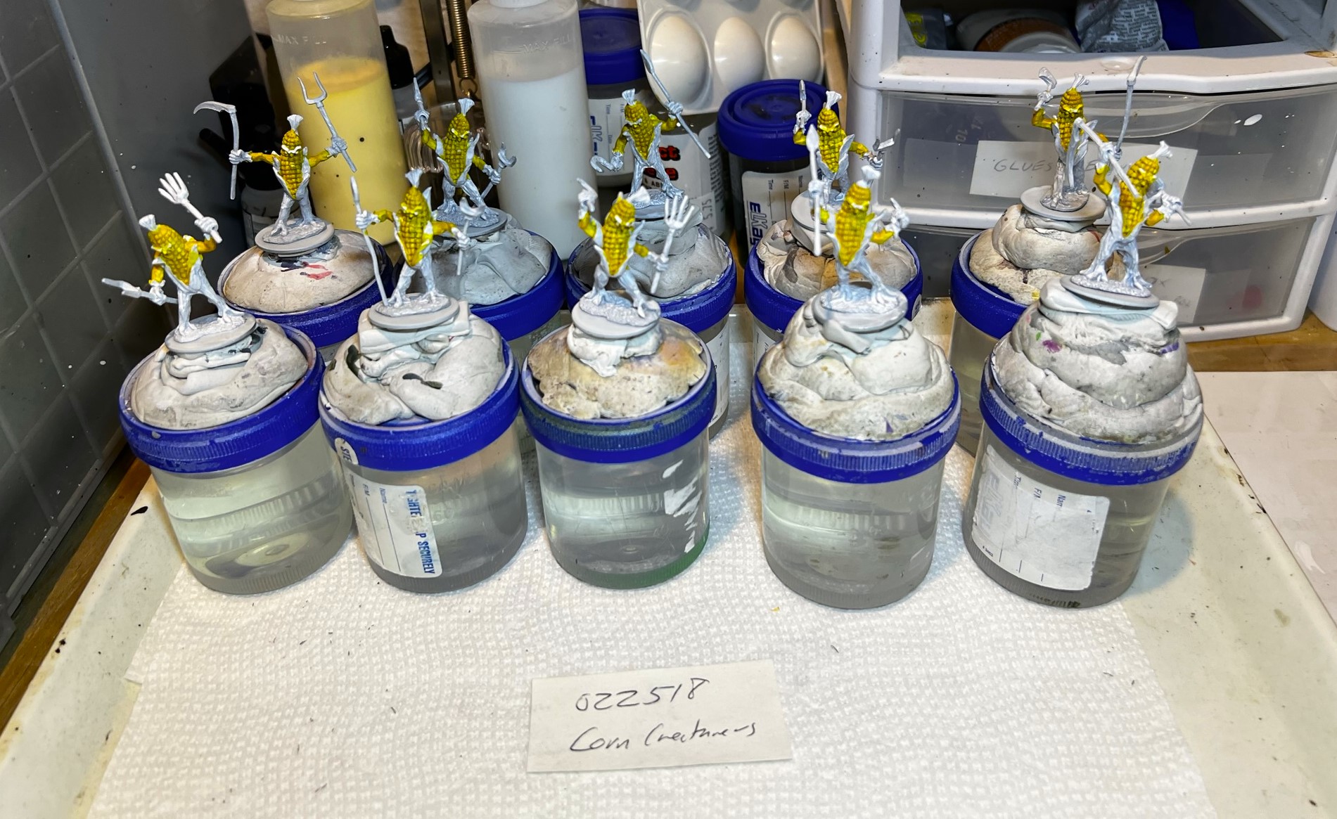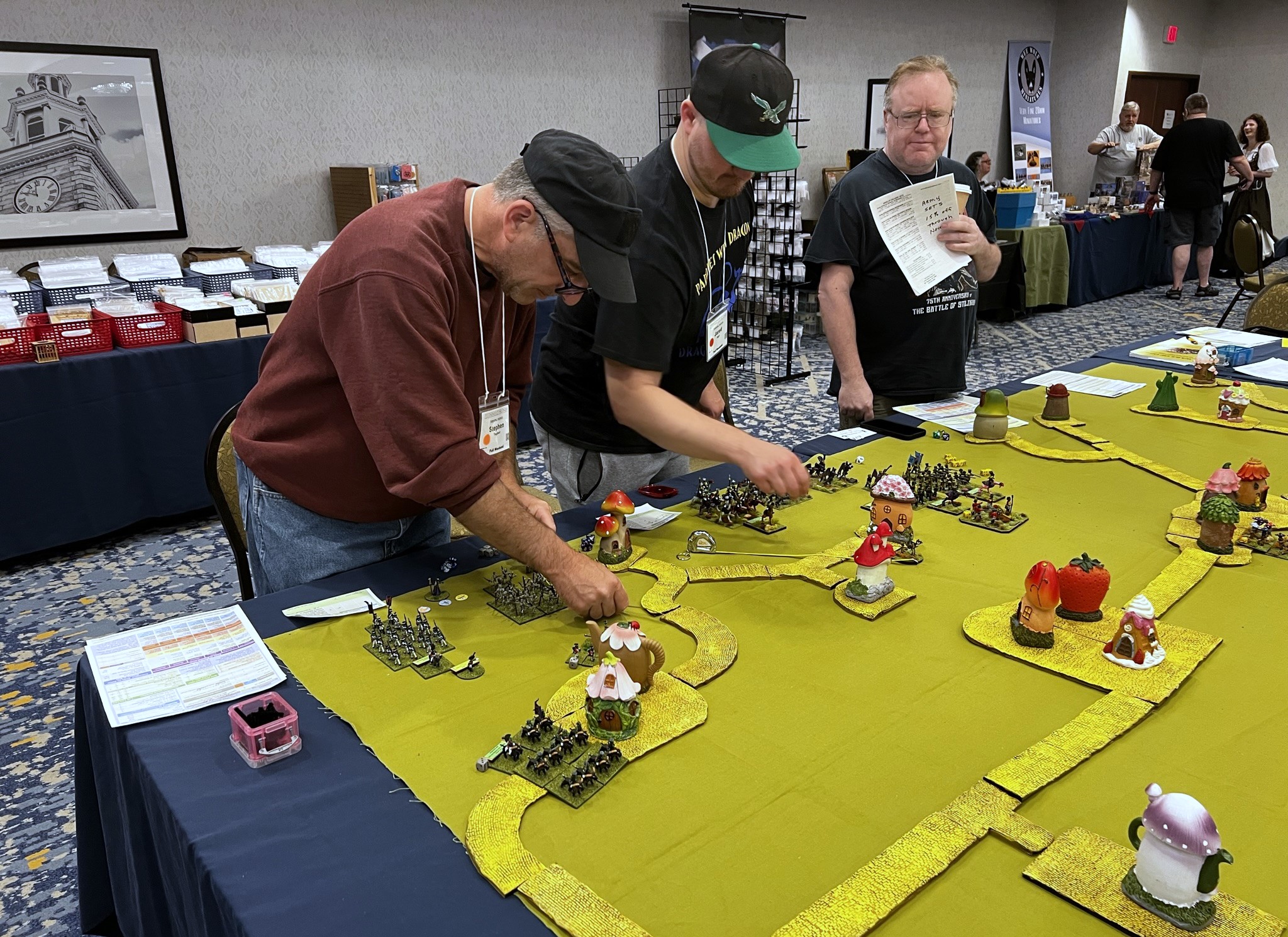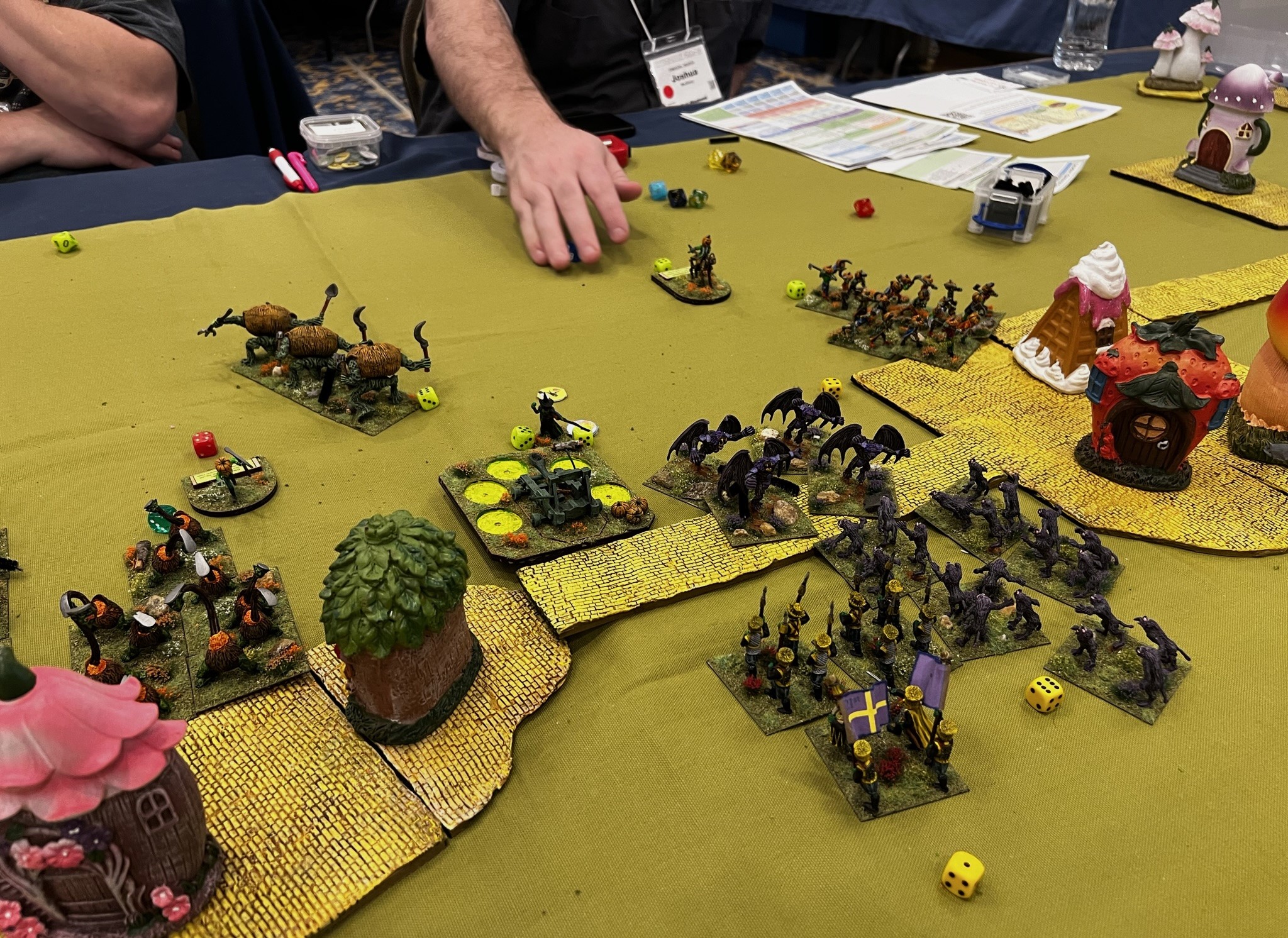 I arrived early Friday the 19th – around 11 AM – so that I could check into my hotel and move all my stuff from my very full car into my room and get my first game set up for 2 PM. Unfortunately, the hotel would not let ANYONE check in before 3 PM – and yes, that was during my game slot. The staff of the hotel claimed that they needed to keep rooms free for flight crews (not the fault of MWHA btw). In any case, my car was not packed such that I could just grab stuff and go – and after a bit of transloading in the parking lot I got my stuff into the convention space and set up my first 6-player Wars of Ozz game. The table was smaller than I had planned – and had a lot of figures on it, but with all of the scrambling, I made it work.