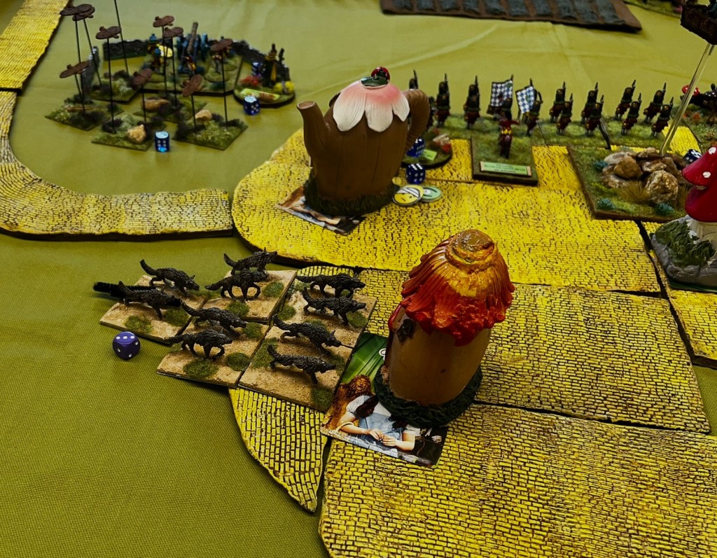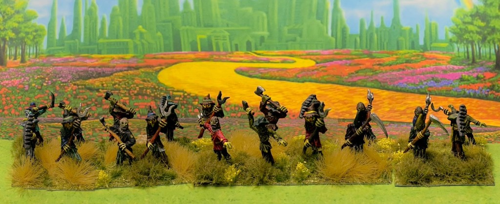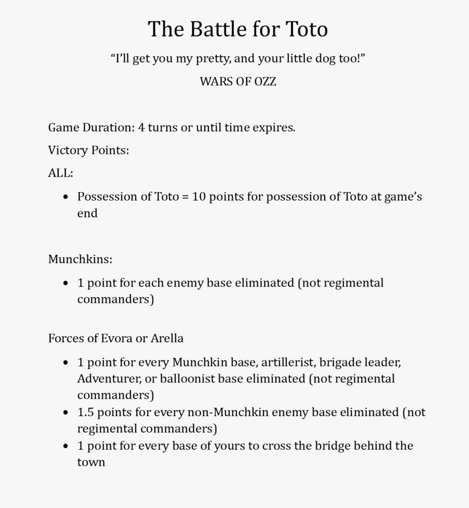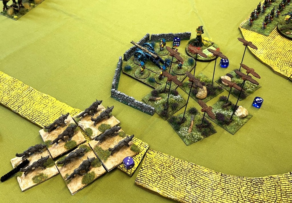 I have been developing a Wars of Ozz scenario to use at upcoming gaming conventions, especially at Fall In!® in Pennsylvania in November. The genesis of the idea for it came to me when I painted up the Adventurers of Ozz figures. The Kansas Farmgirl figure (probably “Dorothy”😁 ) had a small dog in a basket on her waist – and there was yet an extra separate Toto figure in the group. Well, I decided that I could use the other separate Toto as an objective marker – which led to my wanting a scenario for that use. And here we are!
